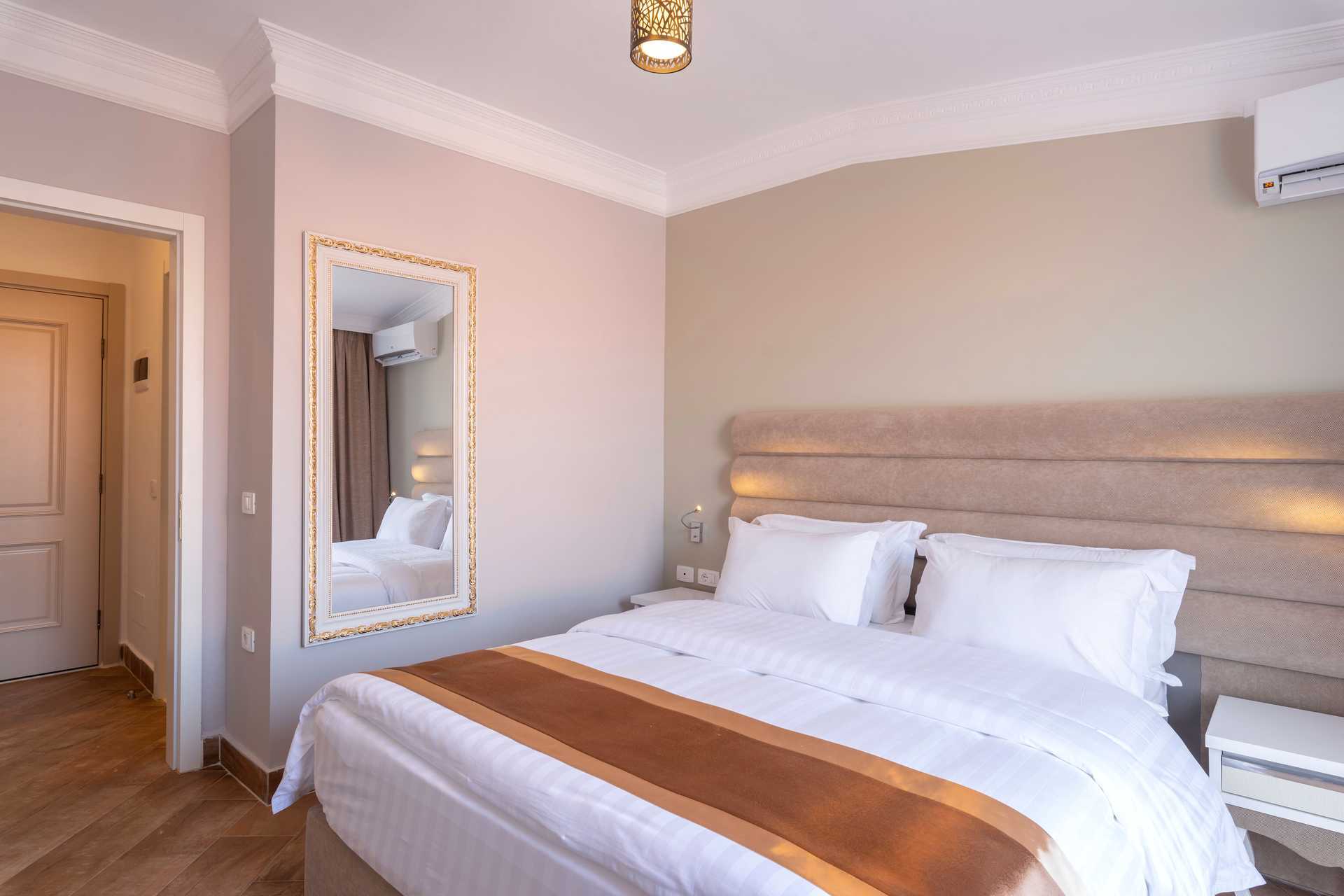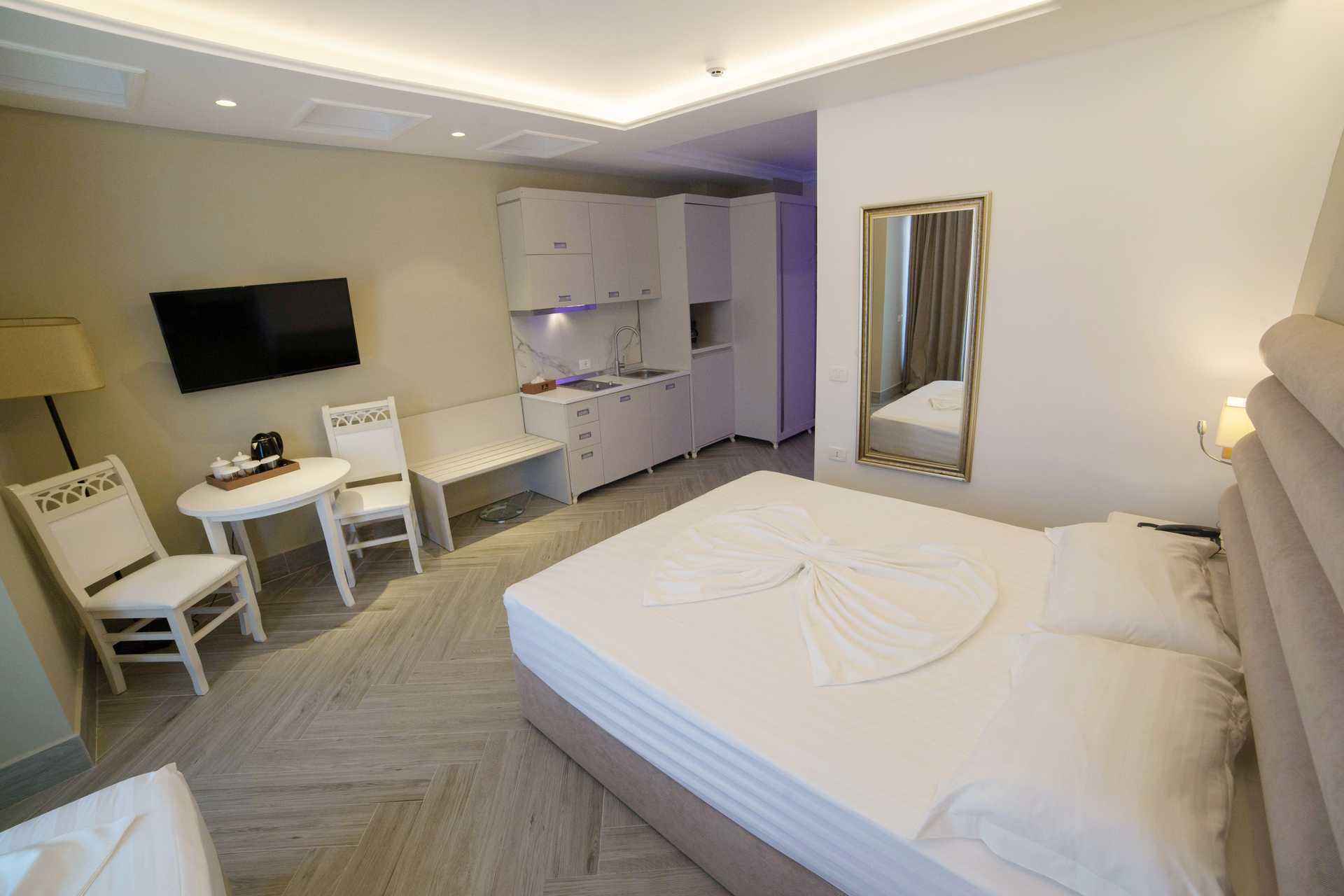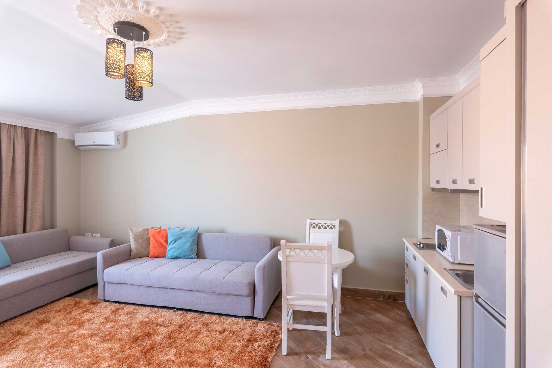 1-værelses lejligheder med balkon og delvis havudsigt. Kombineret soveværelse med minikøkken. En dobbeltseng eller to enkeltsenge. Mulighed for ekstra opredning i sovesofa. 4. person sover i eksisterende senge. Nogle lejligheder har væg til væg-tæppe. Minikøkken med køleskab, kogeplader og enkelt køkkenudstyr. Gratis wifi, aircondition og deponering. Hårtørrer. Badeværelse med bruser og toilet. Rengøring 7 gange om ugen.