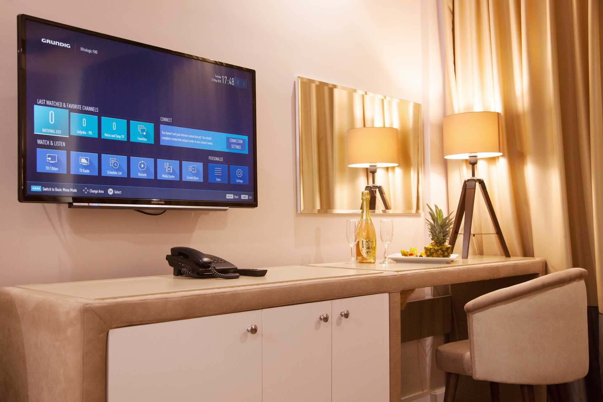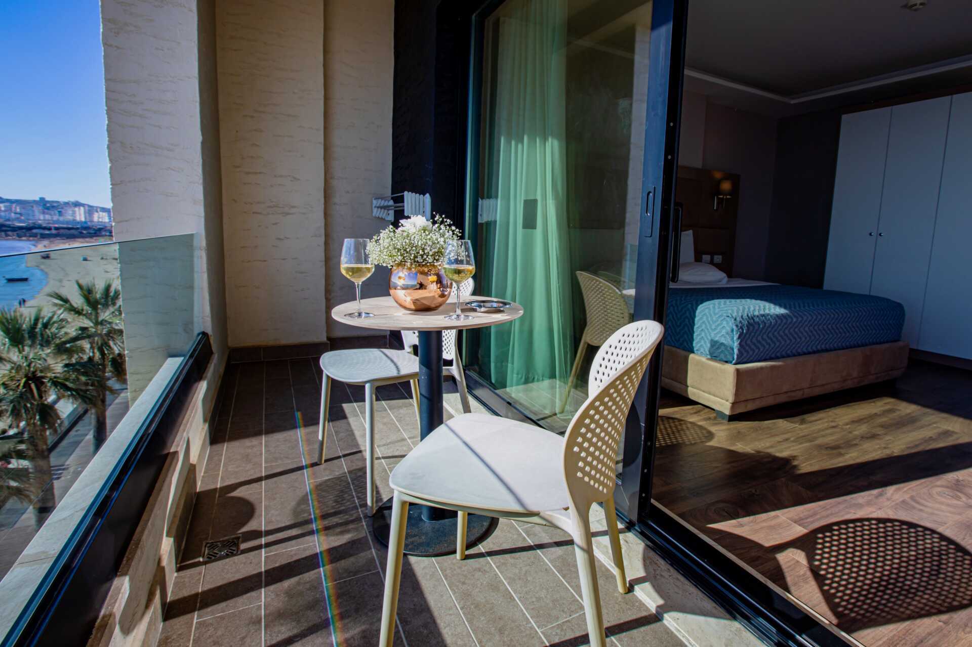 Dobbeltværelse med balkon og delvis havudsigt eller havudsigt eller dobbeltværelse uden terrasse. En dobbeltseng eller to enkeltsenge. Mulighed for ekstra opredning i sovesofa eller fold ud-seng. Gratis wifi, aircondition og deponering. Køleskab. Tv med internationale kanaler. Hårtørrer. Badeværelse med bruser og toilet. Rengøring 7 gange om ugen.