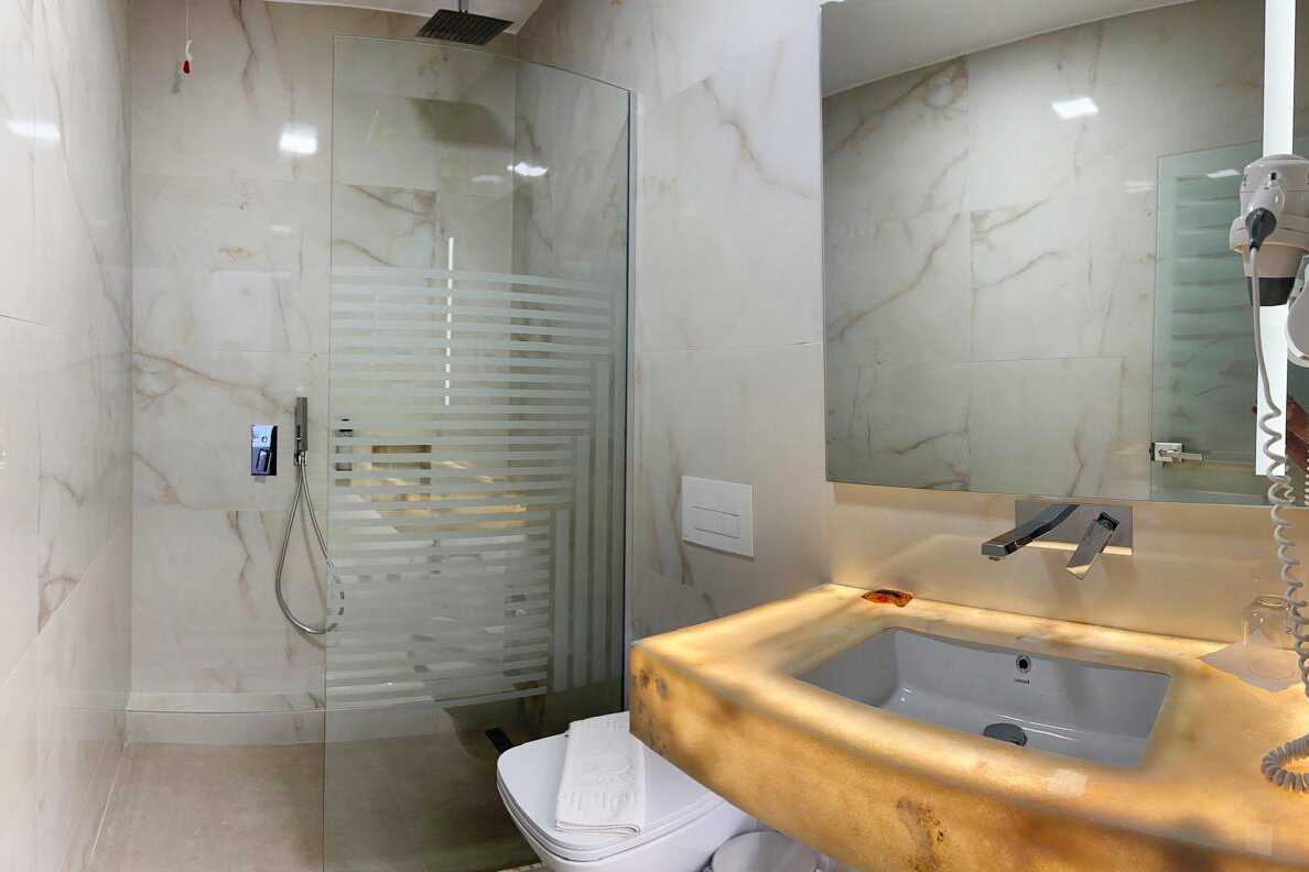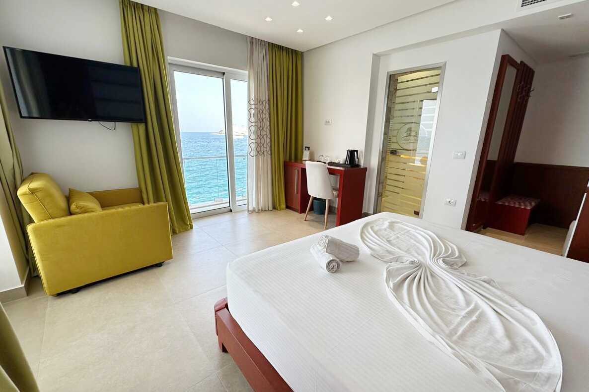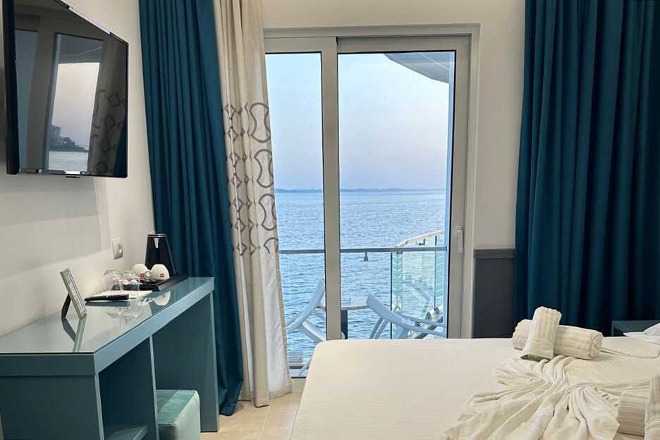 Deluxe-værelser med balkon og havudsigt. En dobbeltseng. Mulighed for ekstra opredning i enkeltseng. Gratis wifi, deponering og aircondition. Køleskab. El-kedel og kaffe/te. Tv med internationale kanaler. Hårtørrer. Glasdør til badeværelse med badekar eller bruser og toilet. Rengøring 7 gange om ugen.