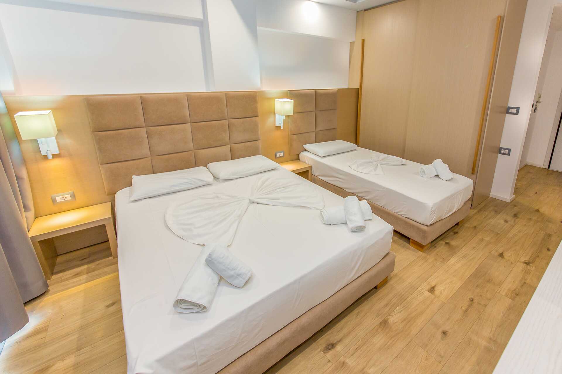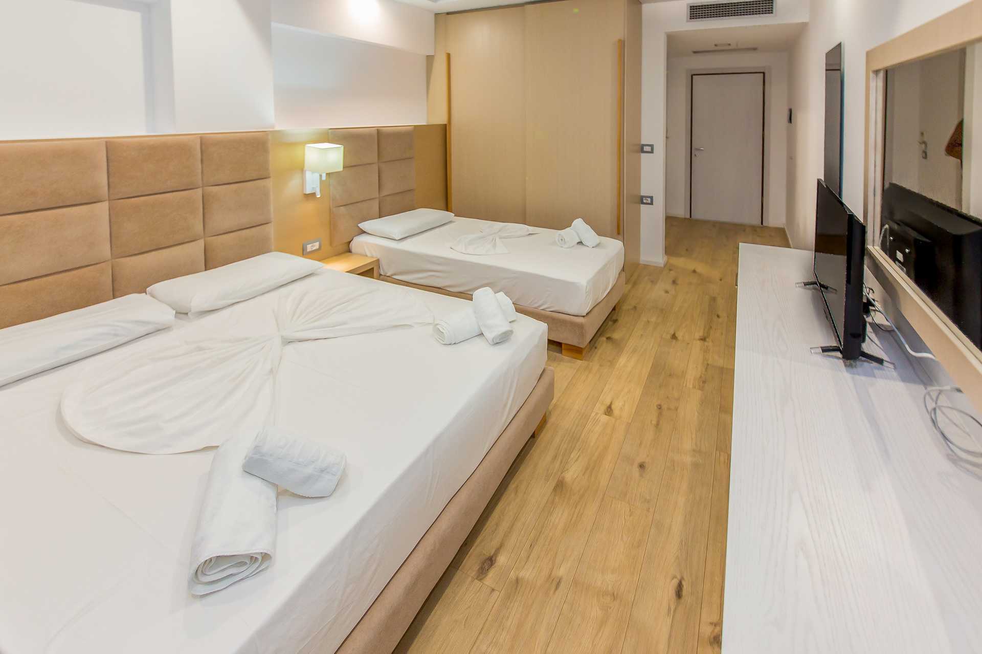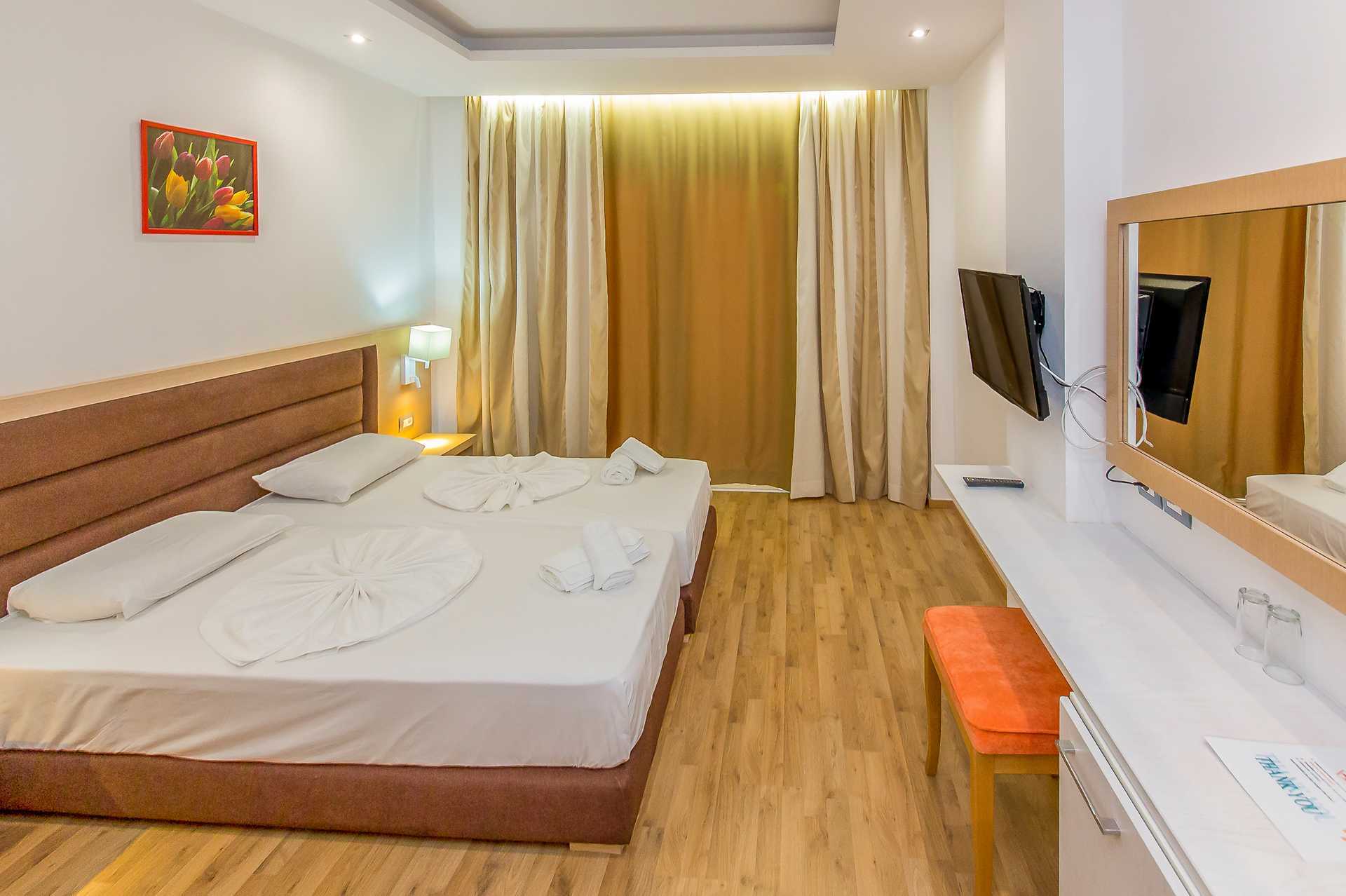 Dobbeltværelser med balkon, nogle med havudsigt eller delvis havudsigt. En dobbeltseng eller to enkeltsenge. Mulighed for ekstra opredning i enkeltseng. Gratis wifi, aircondition og deponering. Køleskab. Hårtørrer. Badeværelse med badekar eller bruser samt toilet. Rengøring 7 gange om ugen.