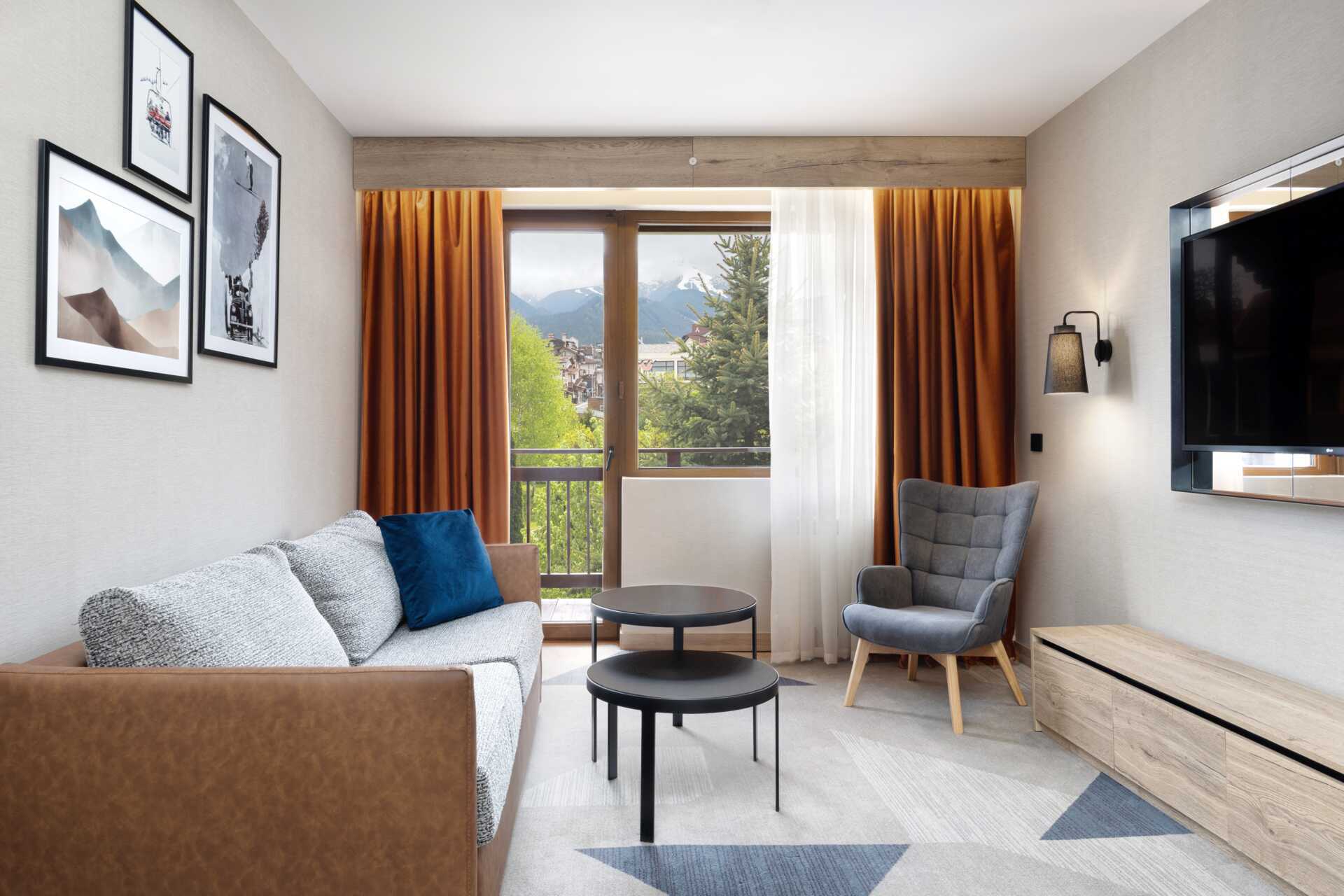 Suiter med balkon. Suiterne er på én etage. Et soveværelse med dobbeltseng ovenpå og et værelse med mulighed for en ekstra opredning i en sovesofa i stueetagen. Gratis wifi, deponering og opvarmning via aircondition. Minibar. El-kedel og kaffe og te. Tv med internationale kanaler. Væg til væg-tæppe. Strygejern og strygebræt. Hårtørrer Badeværelse med badekar og toilet. Rengøring 6 gange om ugen.