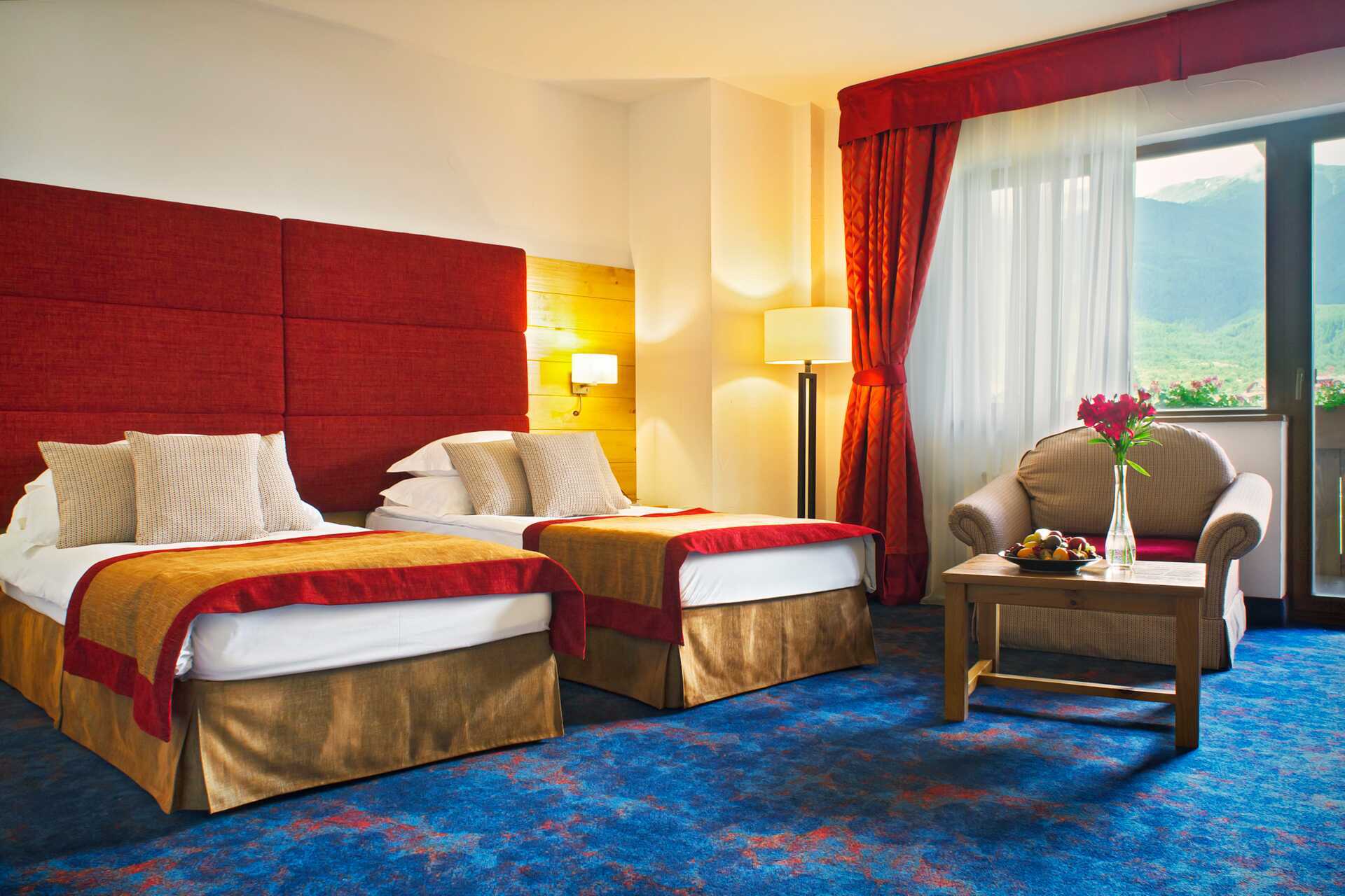 Deluxe-værelser med balkon og udsigt over byen. En dobbeltseng eller to enkeltsenge. Mulighed for en ekstra opredning i en lænestol. Gratis wifi, aircondition til varme og deponering. Køleskab. El-kedel og faciliteter til at lave kaffe og te. Væg til væg-tæppe. Hårtørrer. Badekåber og tøfler. Badeværelse med badekar, bruser og toilet. Rengøring 7 gange om ugen.