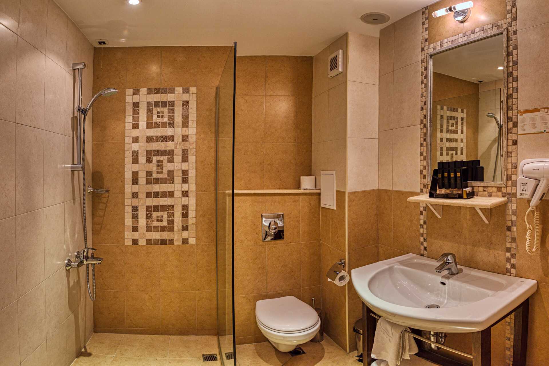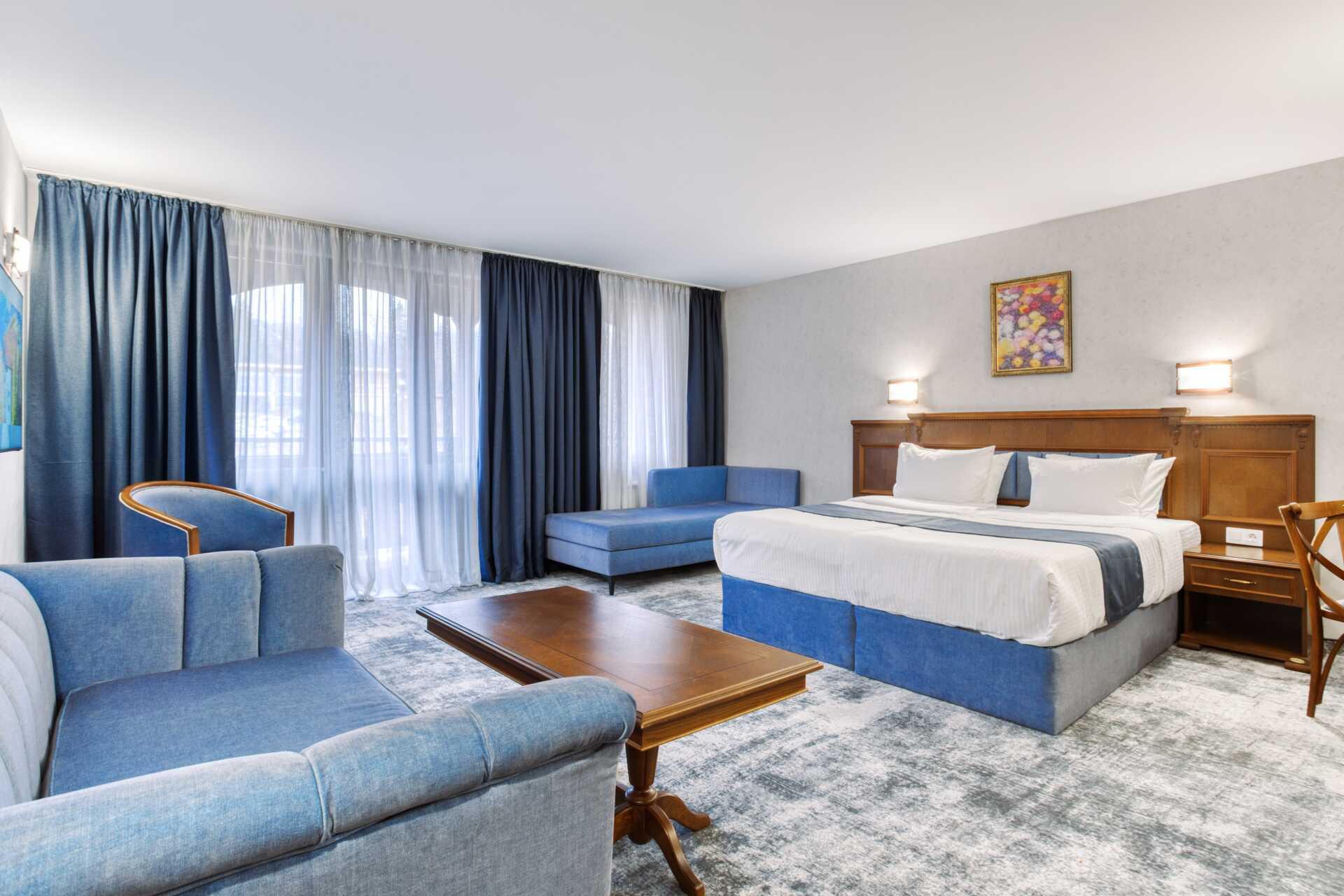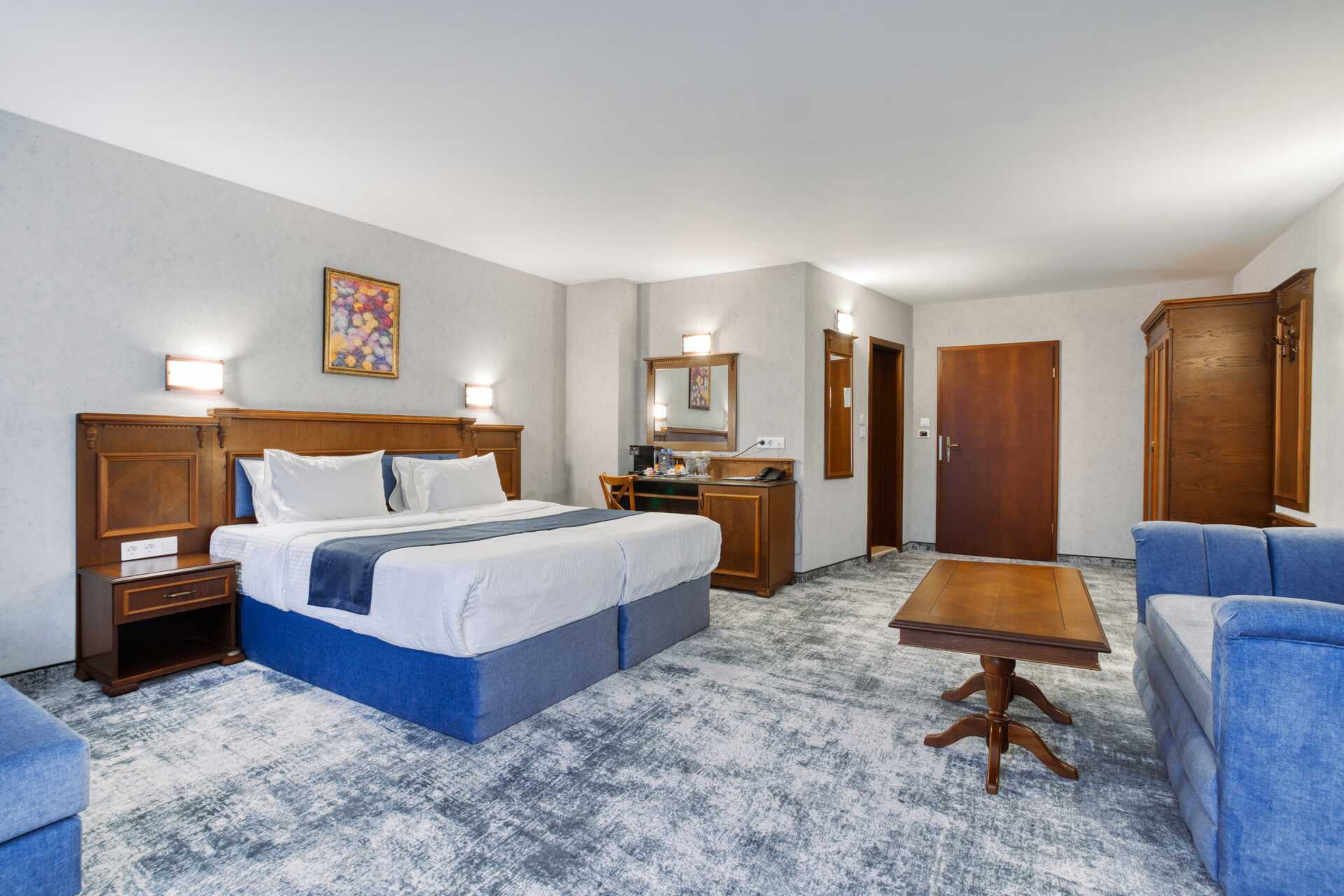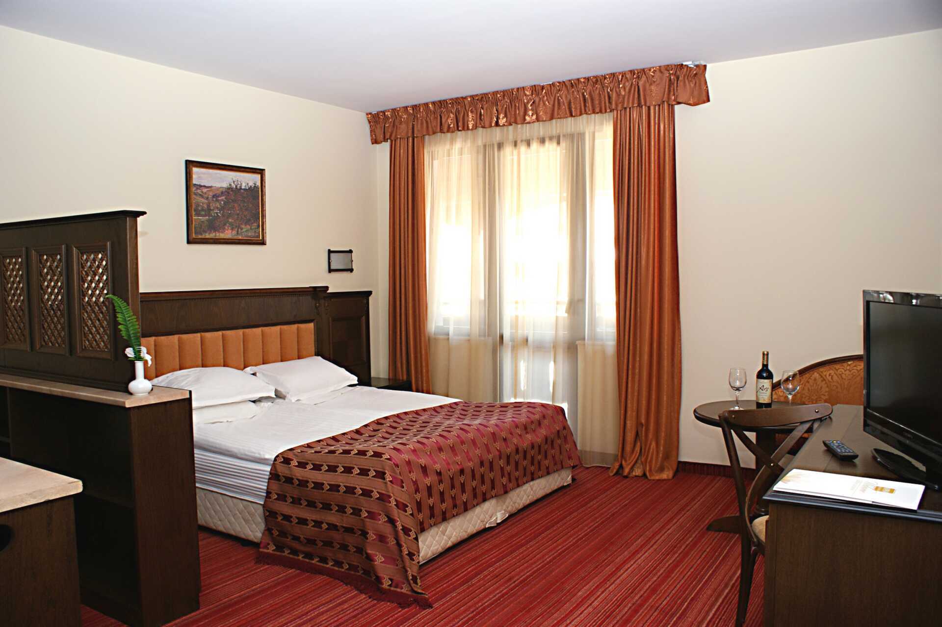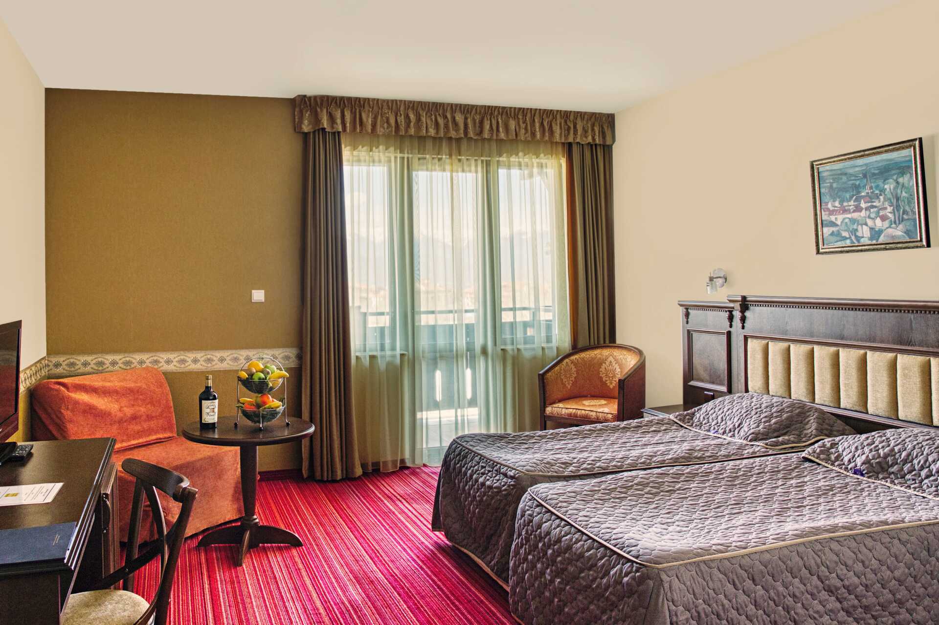 Deluxe-værelse med balkon og udsigt mod byen eller bjergene. En dobbeltseng eller to enkeltsenge. Mulighed for ekstra opredninger i sovesofa. Gratis wifi, aircondition til opvarmning og deponering. Køleskab. Illy kaffemaskine - kapsler indgår og genopfyldes hver dag. Tv med internationale kanaler. Væg til væg-tæppe. Badekåber og tøfler. Hårtørrer. Badeværelse med badekar eller bruser samt toilet. Rengøring 7 gange om ugen.
