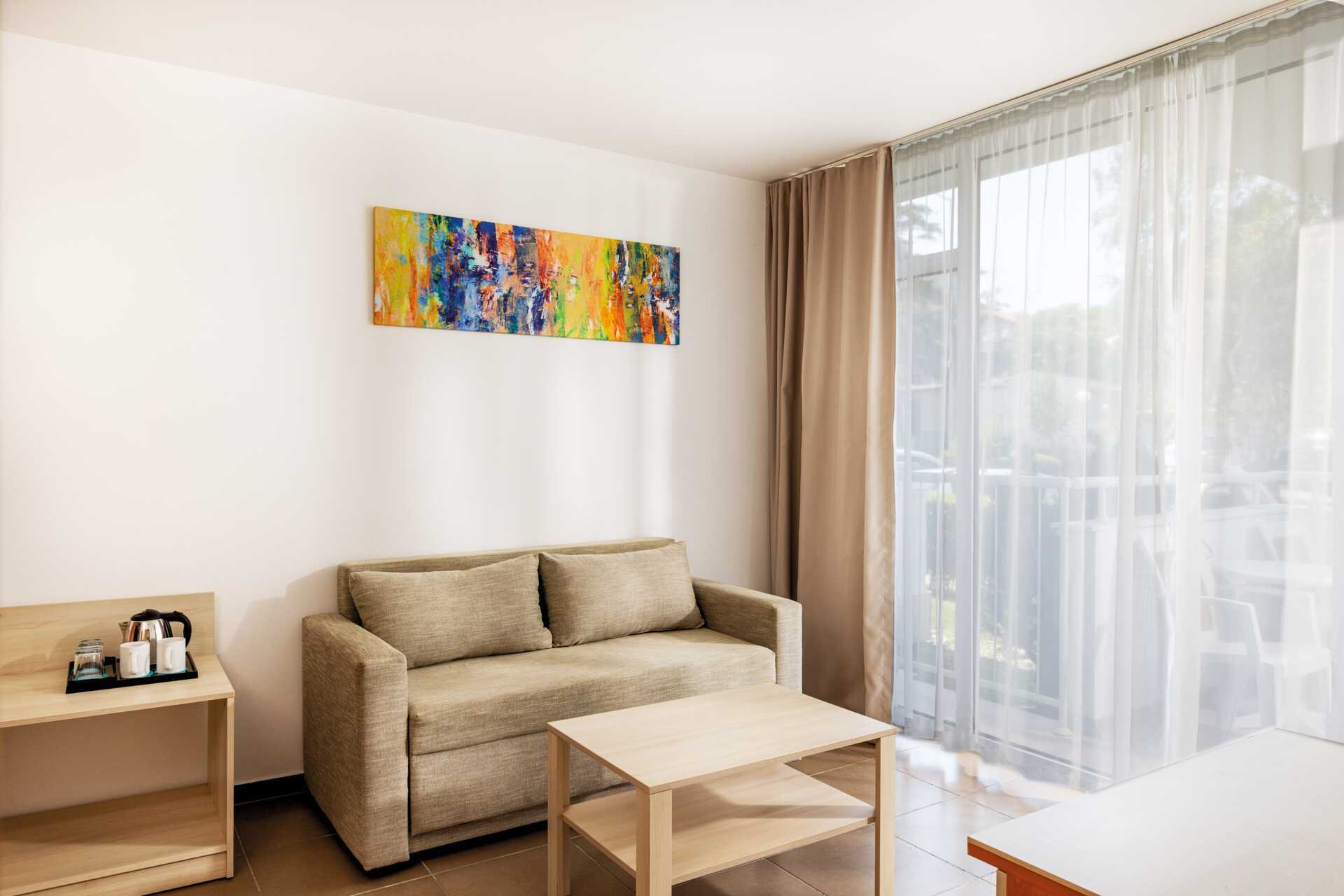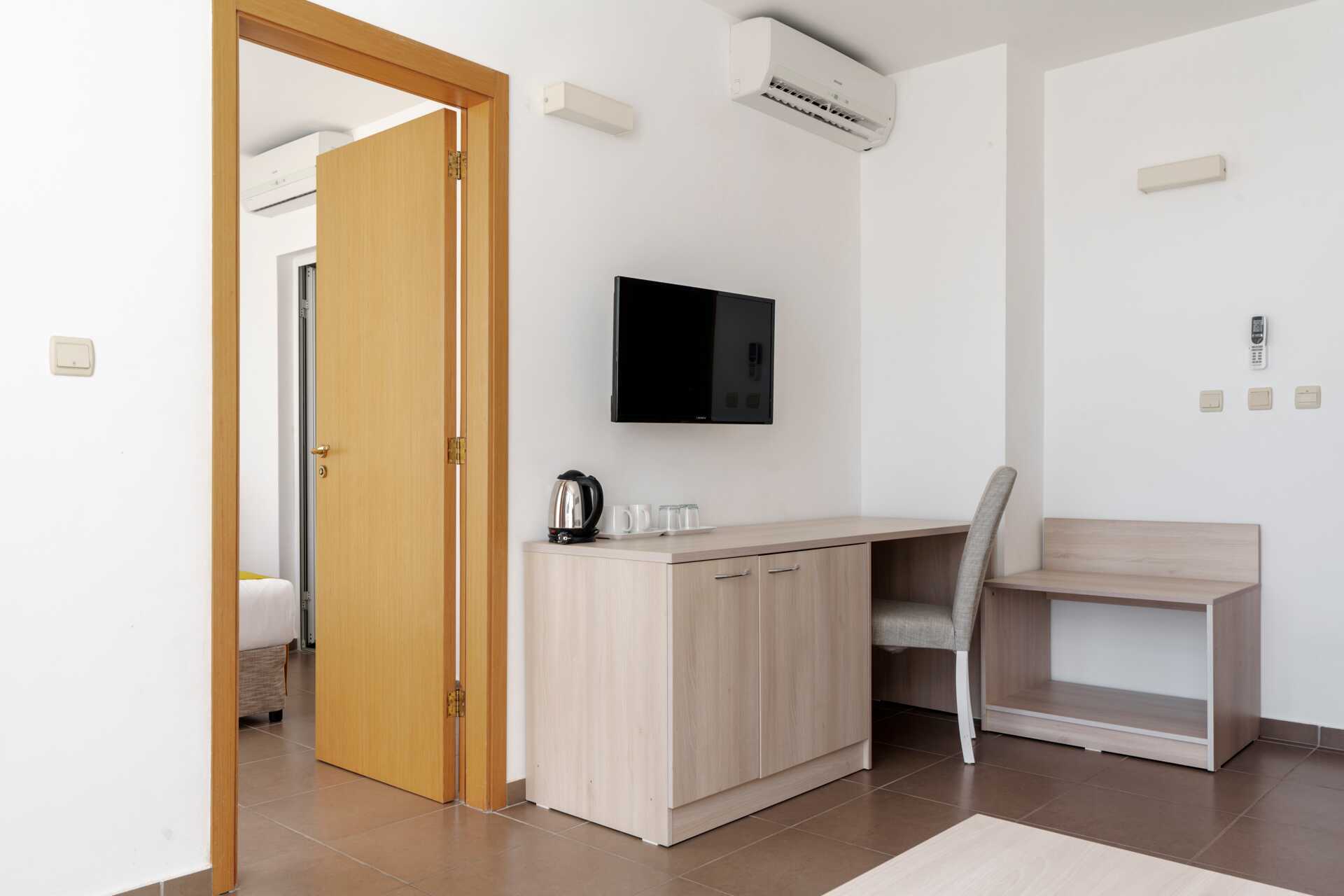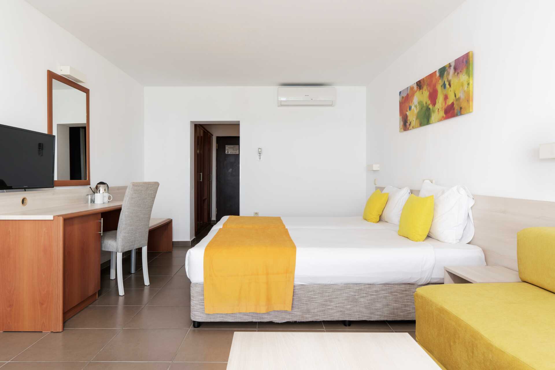Familie-værelse med balkon. Værelserne består af et soveværelse med en dobbeltseng og et værelse med en sovesofa eller to enkeltsenge. Gratis wifi, aircondition og deponering. Lille køleskab. El-kedel. Tv med internationale kanaler. Hårtørrer. Badeværelse med bruser og toilet. Rengøring 7 gange om ugen.