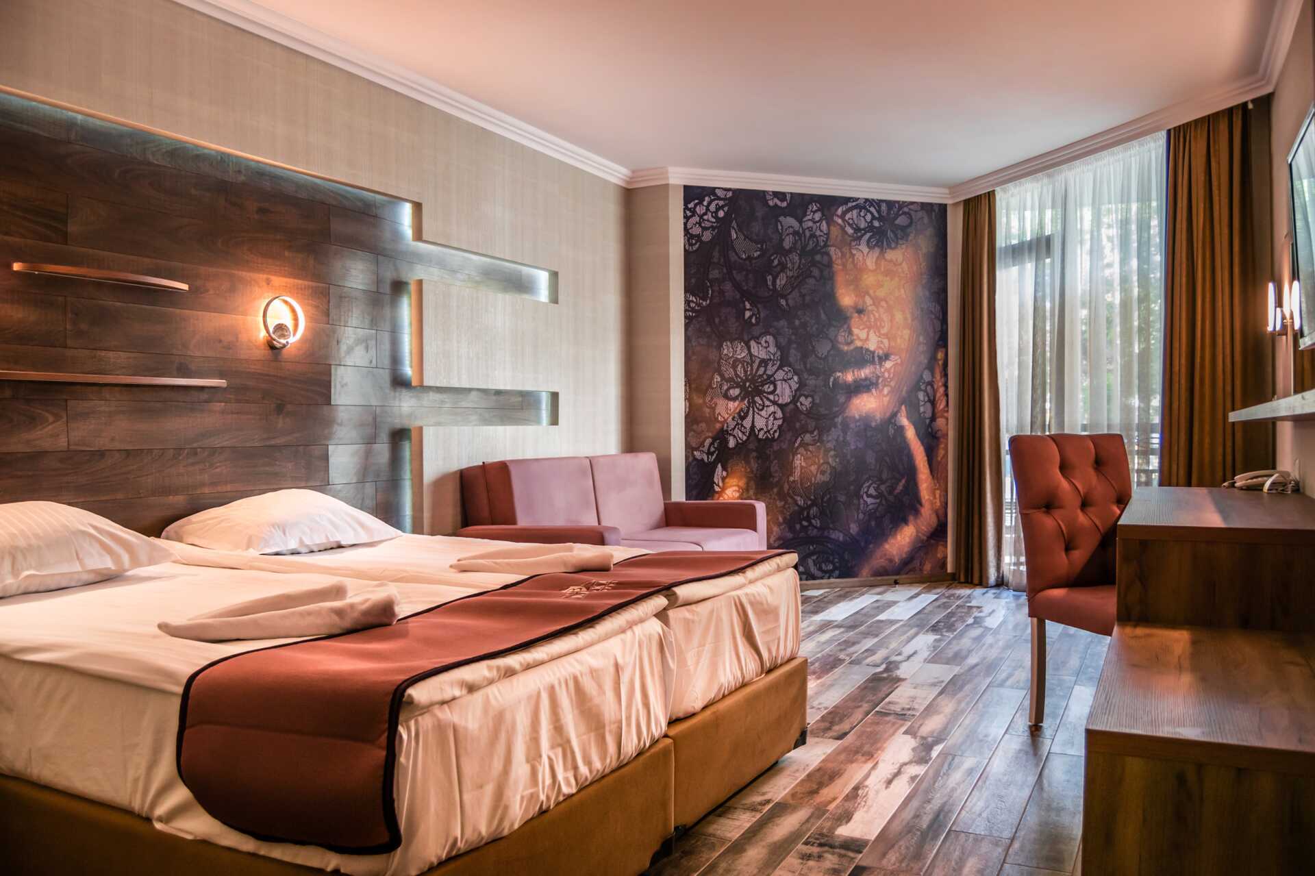 Superior-værelse med balkon. To enkeltsenge. Mulighed for opredning i enkeltseng, fold ud-stol og/eller sovesofa. Gratis wifi og aircondition. Køleskab. Tv med internationale kanaler. Hårtørrer. Badeværelse med bruser og toilet. Rengøring 7 gange om ugen.