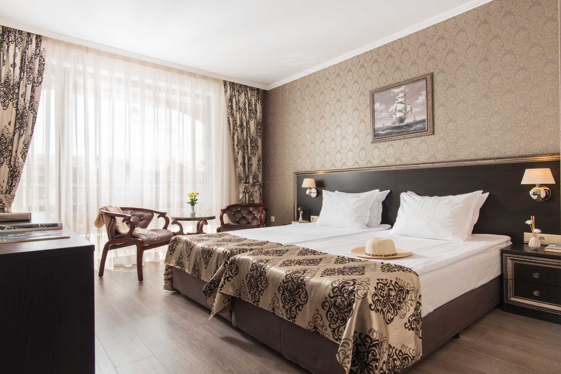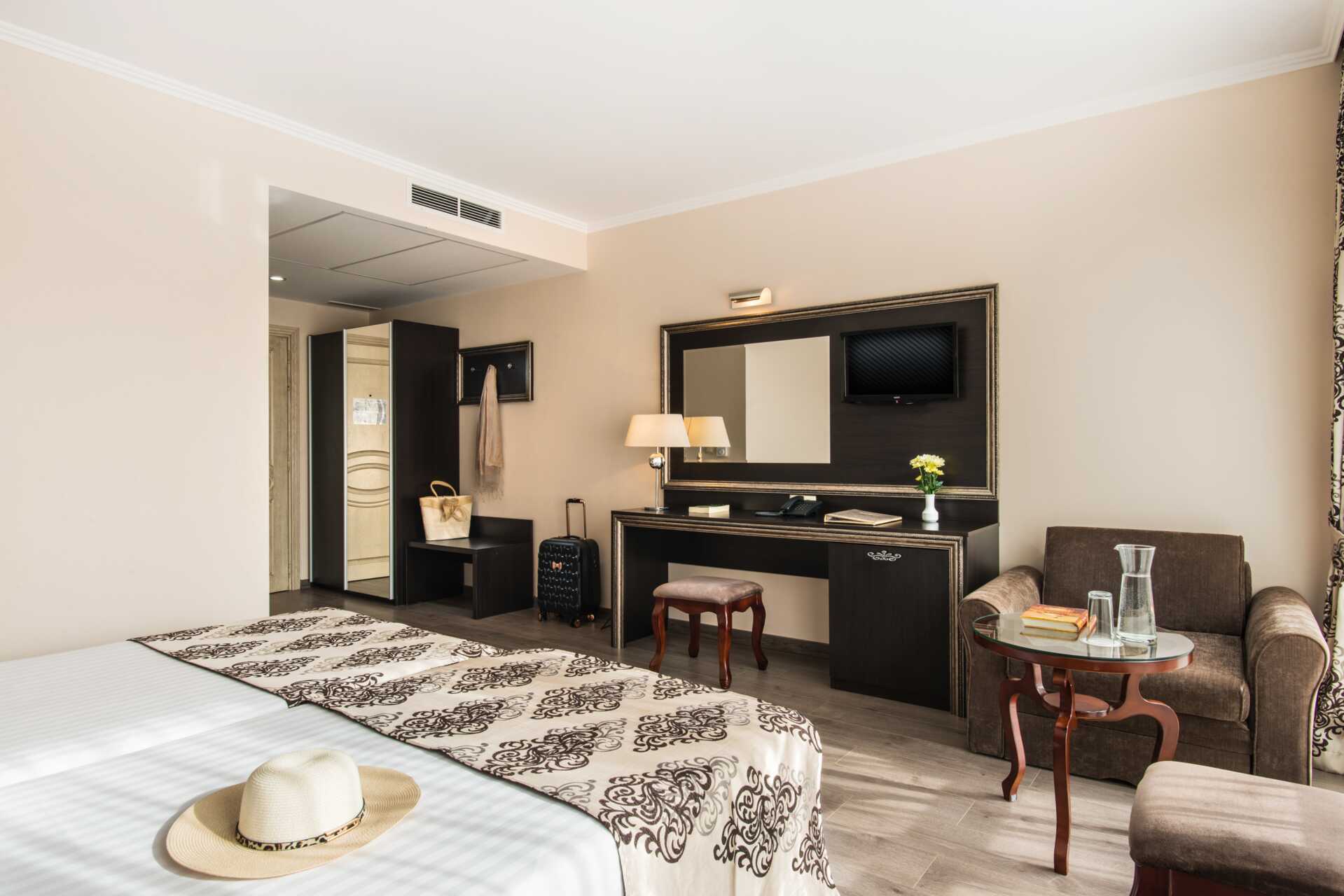 Junior-suite superior med balkon eller terrasse. To enkeltsenge. Mulighed for ekstra opredning i lænestol eller fold ud-seng. Gratis wifi og aircondition. Deponering mod betaling. Køleskab. Tv med internationale kanaler. Hårtørrer. Badeværelse med bruser og toilet. Rengøring 7 gange om ugen.