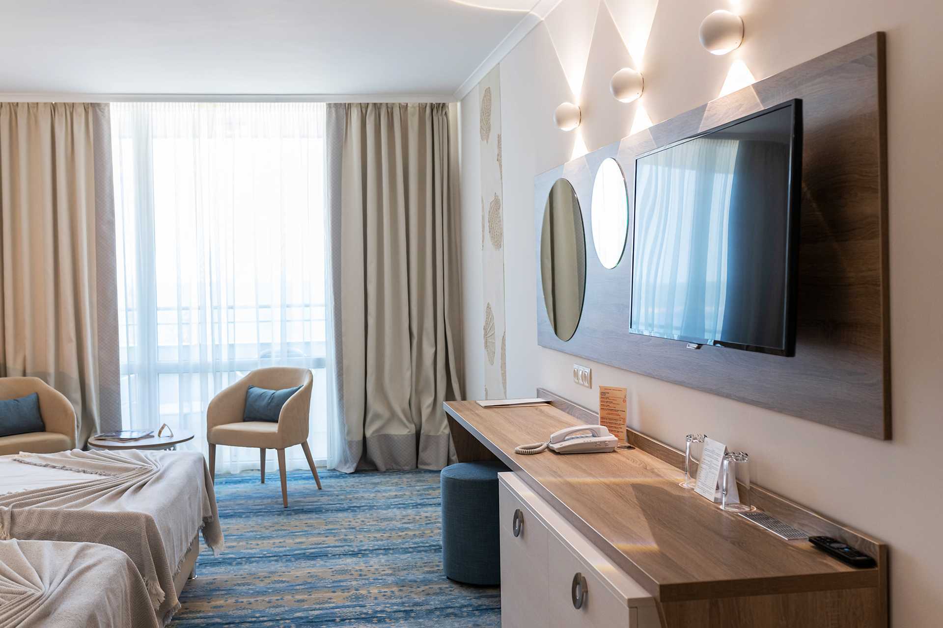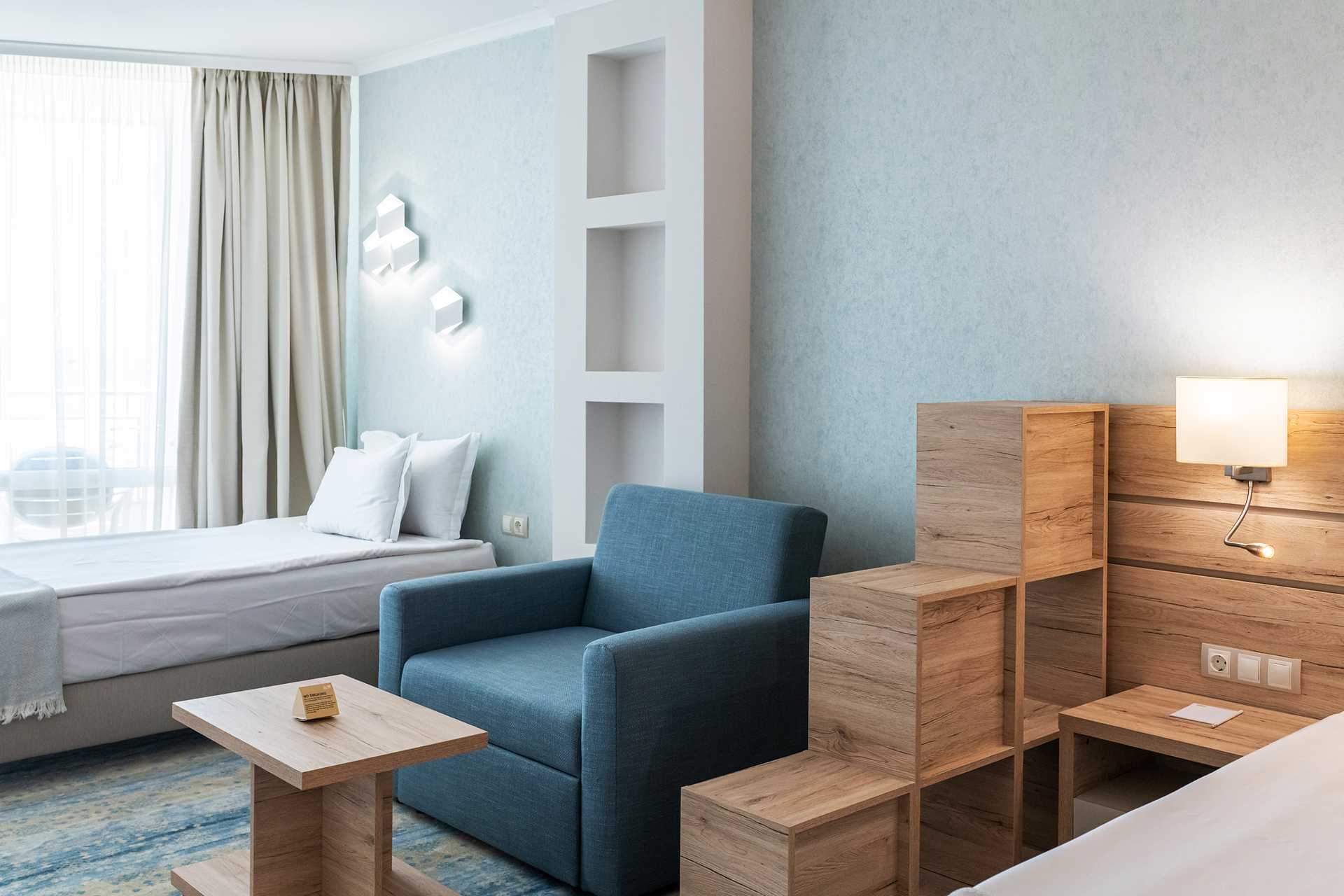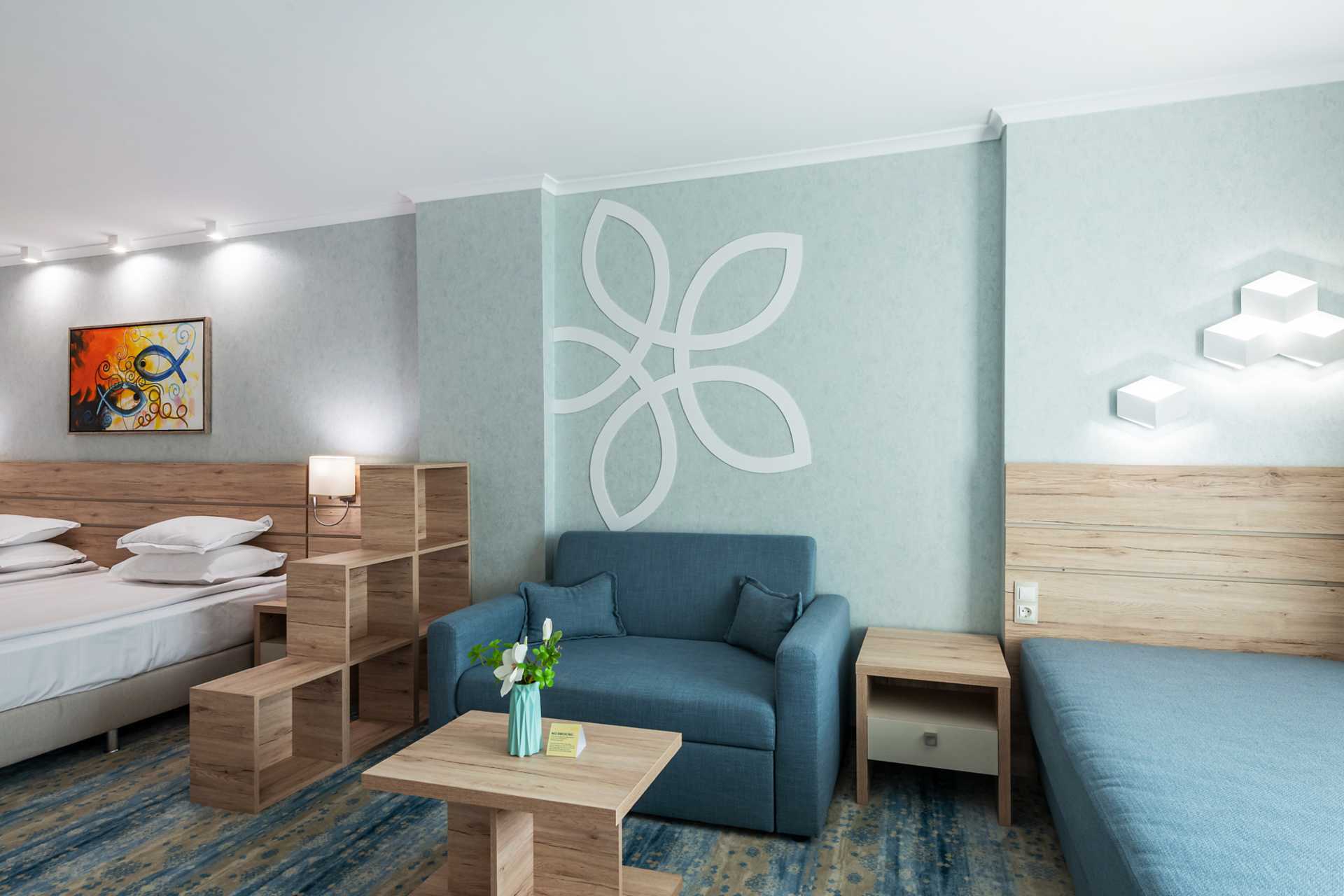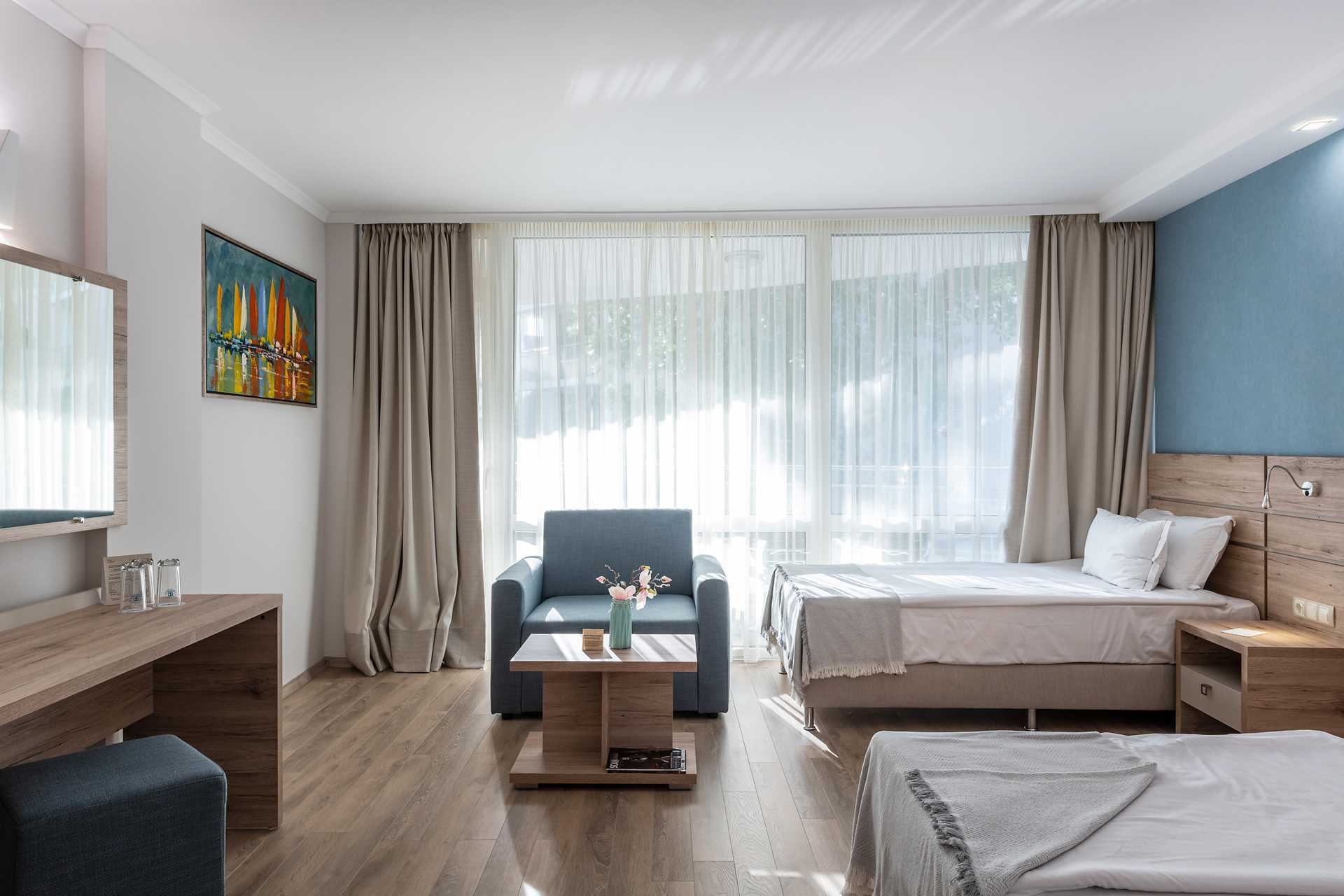 Familie-værelser med balkon, nogle med havudsigt. Værelserne er placeret i hotellets hovedbygning. Tre enkeltsenge eller en dobbeltseng og en enkeltseng. Mulighed for ekstra opredning i eksisterende senge og i en sovesofa. Væg til væg-tæppe. Gratis wifi, aircondition og deponering. Minibar, mod betaling. Kaffemaskine - kapsler er inkluderet og genopfyldes i løbet af ugen. Tv med internationale kanaler. Hårtørrer. Badeværelse med bruser og toilet. Rengøring 7 gange om ugen.
