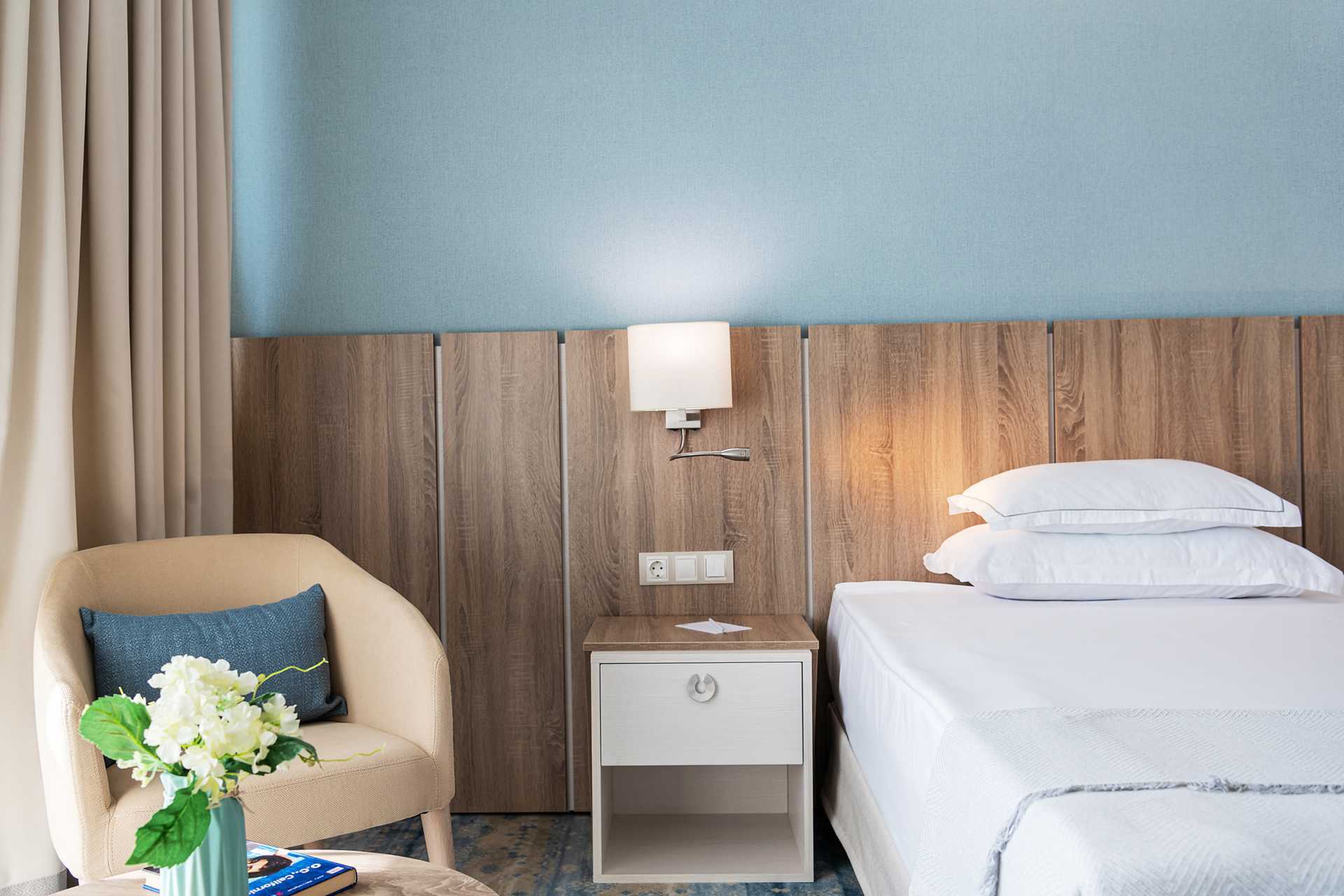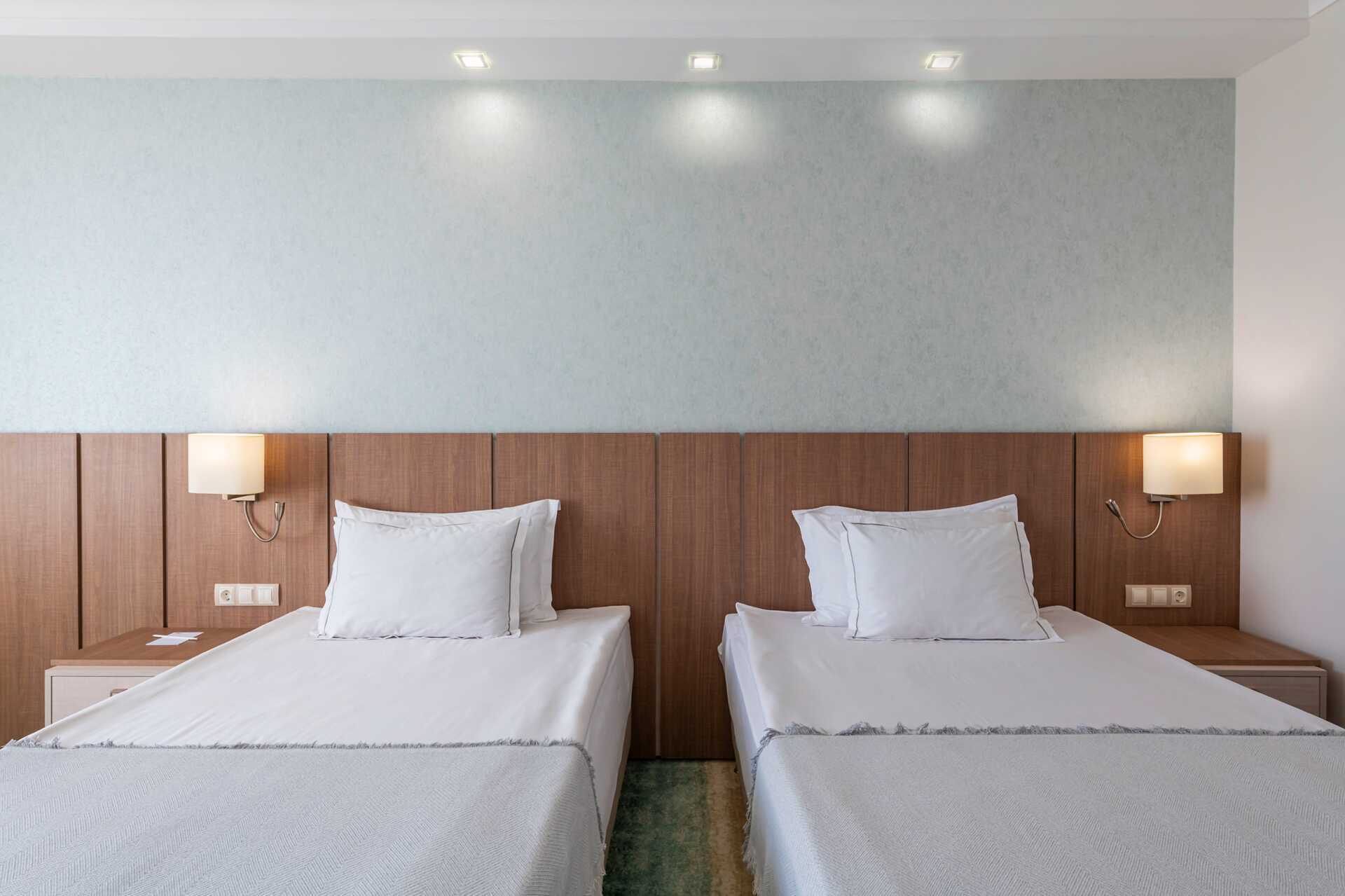 Standardværelse med balkon. Værelserne er placeret i hotellets sidebygning. To enkeltsenge. Gratis wifi, aircondition og deponering. Væg til væg-tæppe. Minibar mod betaling. Kaffemaskine - kapsler indgår og genopfyldes i løbet af ugen. Tv med internationale kanaler. Hårtørrer. Badeværelse med bruser og toilet. Rengøring 7 gange om ugen.