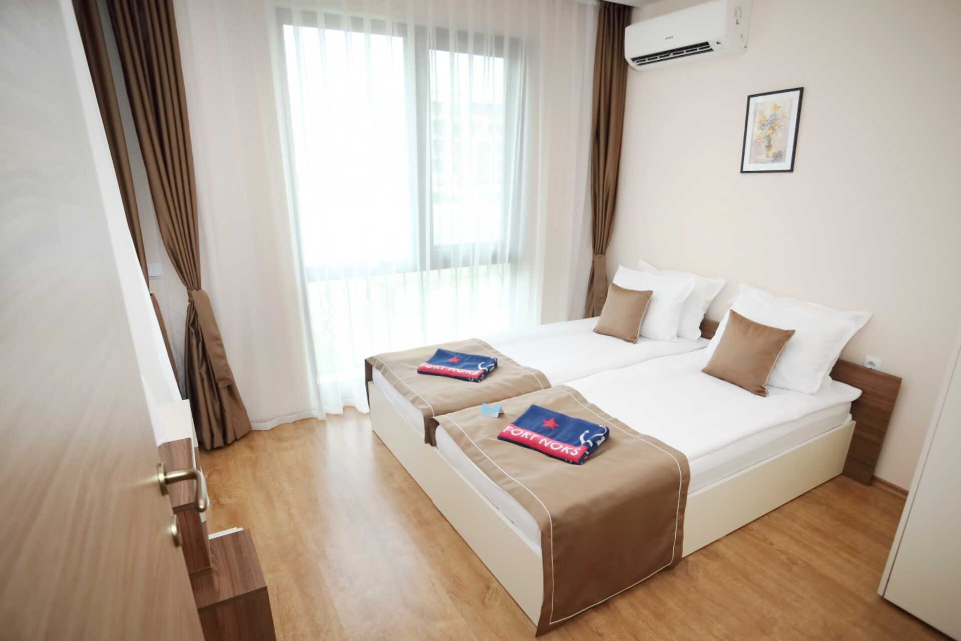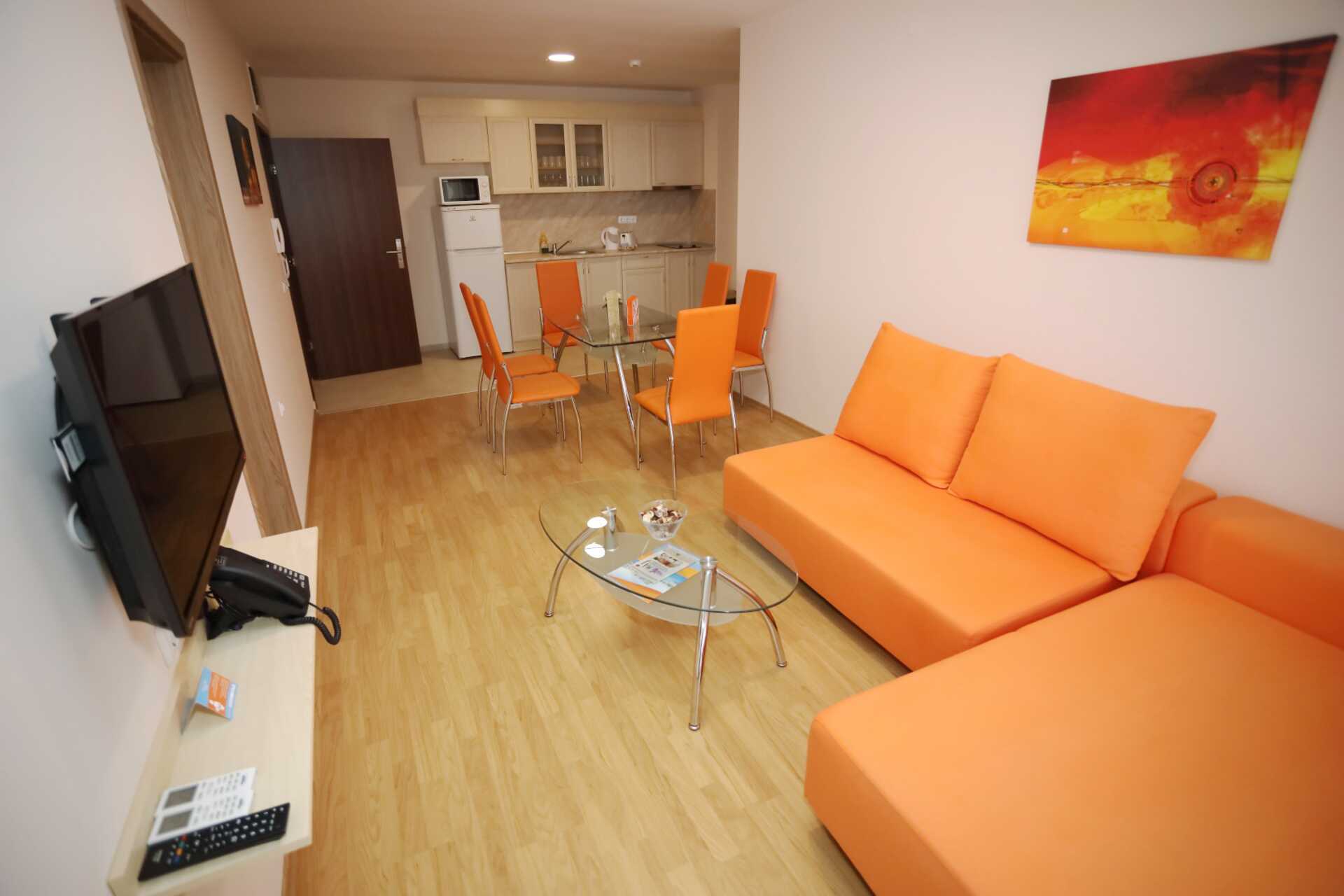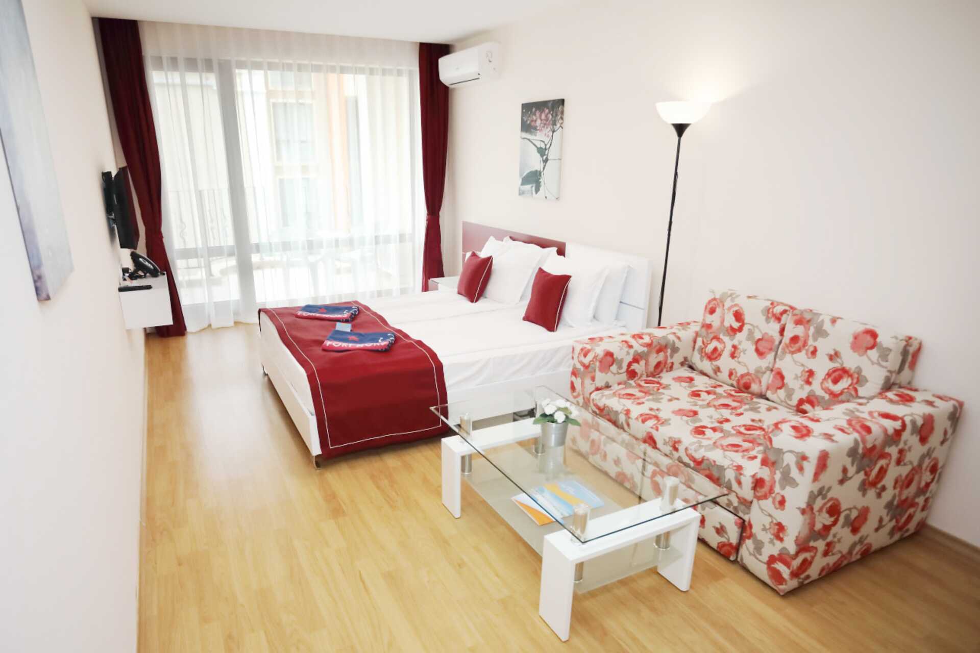2-værelses lejlighed med balkon. Et soveværelse og et kombineret opholdsrum med minikøkken. En dobbeltseng. Mulighed for ekstra opredning i sovesofa. Minikøkken med kogeplader, emhætte, køleskab, el-kedel, brødrister, mikroovn og enkelt køkkenudstyr. Nogle lejligheder har også ovn. Gratis wifi, aircondition og deponering. Tv med internationale kanaler. Vaskemaskine. Strygejern og strygebræt. Hårtørrer. Badeværelse med bruser og toilet. Rengøring 7 gange om ugen.