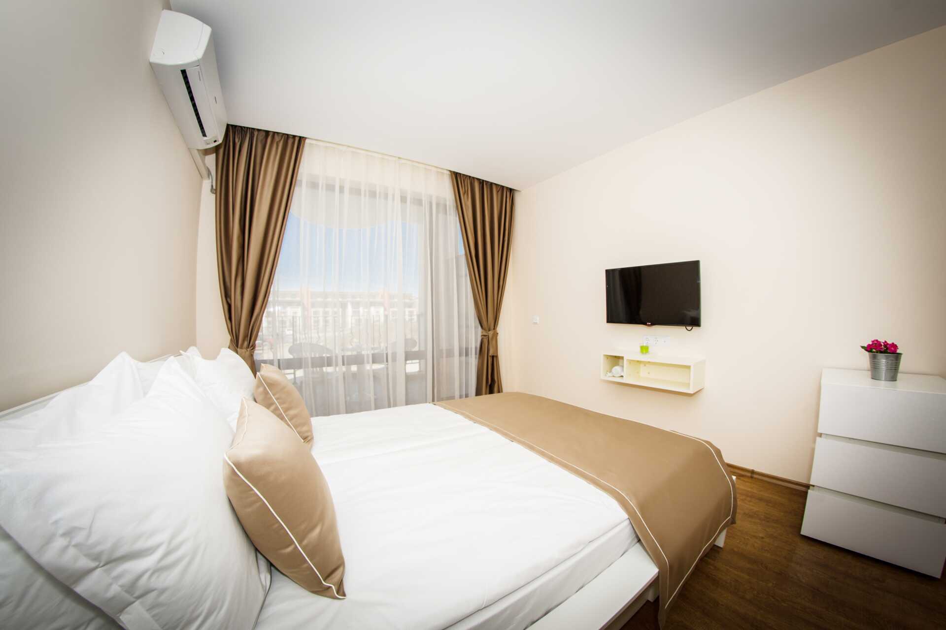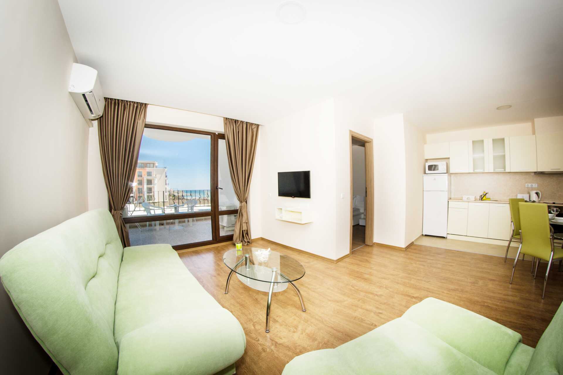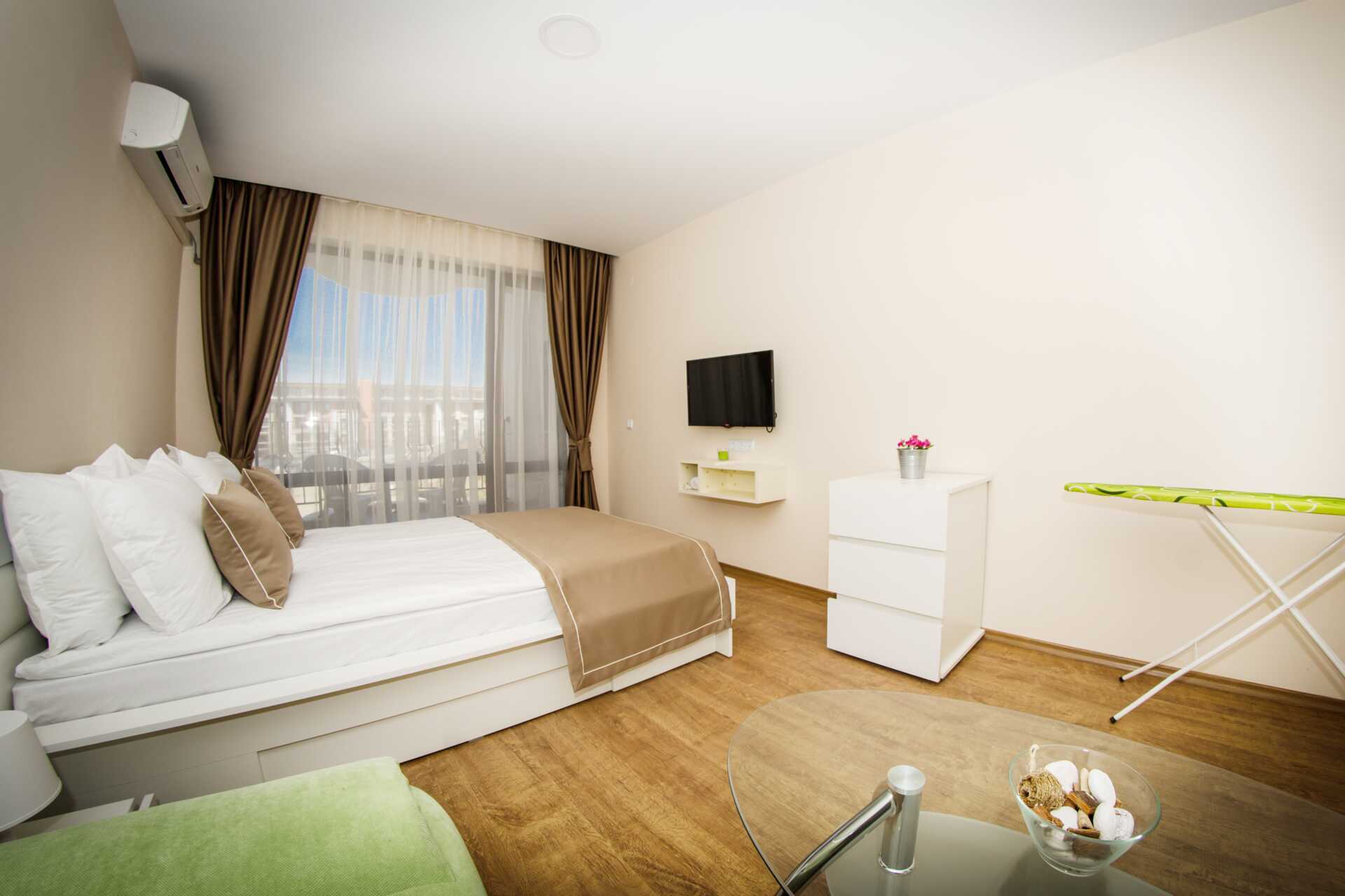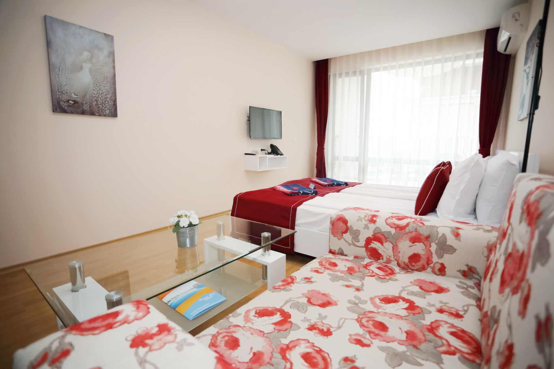 2-værelses lejlighed med balkon. Soveværelse og kombineret opholdsrum/minikøkken. En dobbeltseng. Mulighed for ekstra opredning i sovesofa. Minikøkken med kogeplader, emhætte, køleskab, el-kedel, brødrister, mikroovn og enkelt køkkenudstyr. Nogle lejligheder har også ovn. Gratis wifi, aircondition og deponering. Tv med internationale kanaler. Vaskemaskine. Strygejern og strygebræt. Hårtørrer. Badeværelse med bruser og toilet. Rengøring 7 gange om ugen.