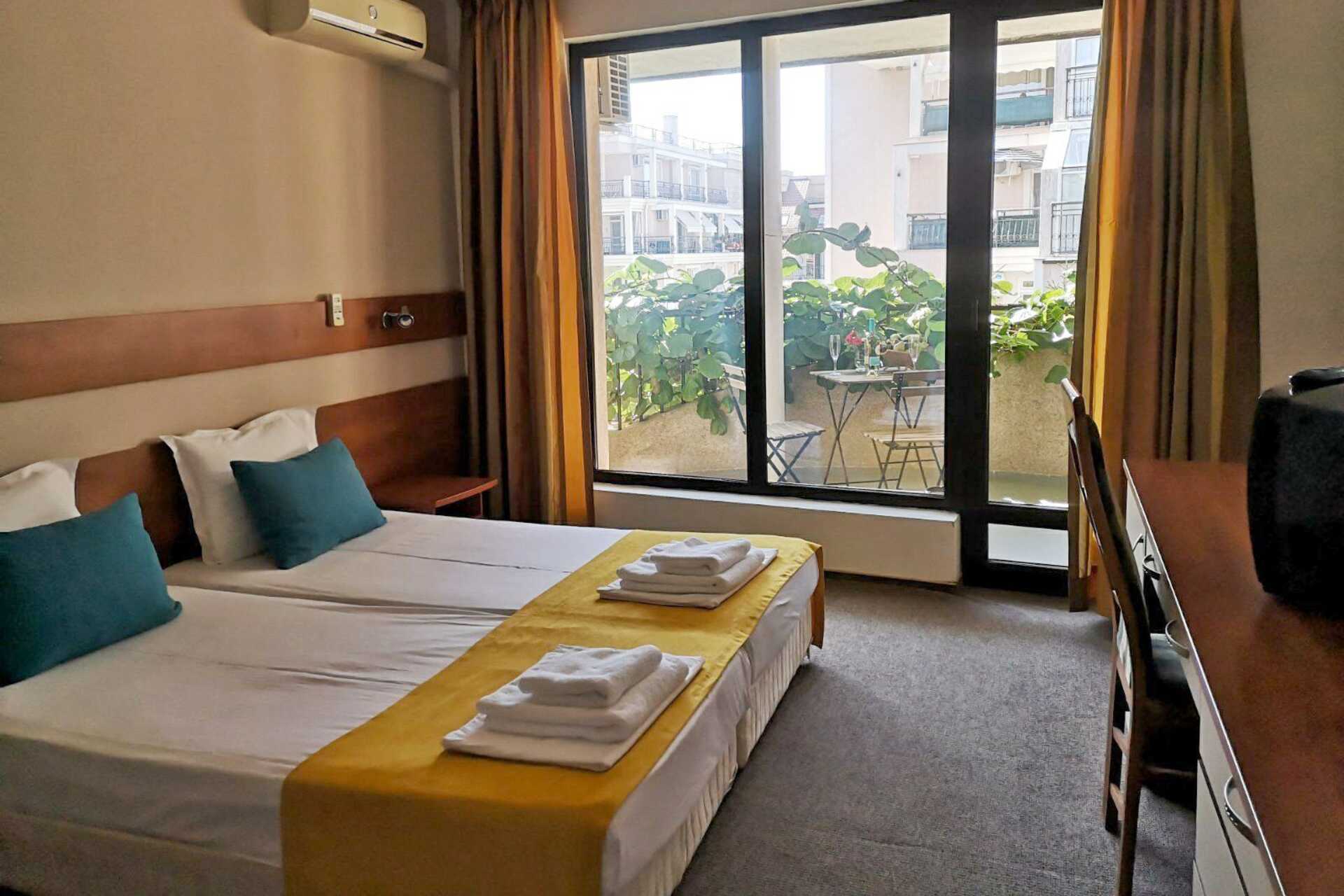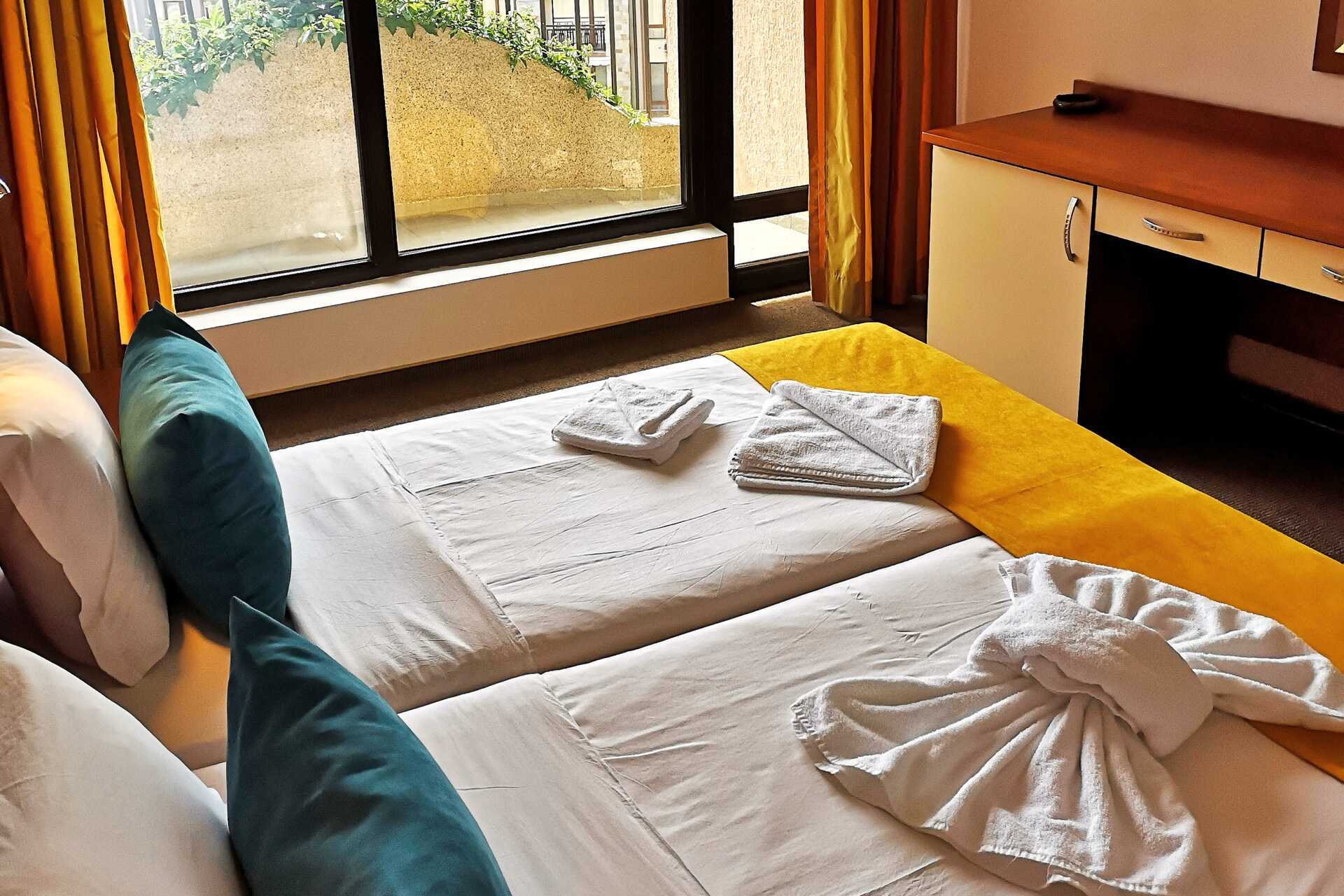 Dobbeltværelser med balkon. To enkeltsenge og mulighed for ekstra opredning i sovesofa. Væg til væg-tæppe. Tv med lokale kanaler. Køleskab. Gratis wifi. Aircondition og deponering mod betaling. Badeværelse med bruser og toilet. Rengøring 7 gange om ugen.