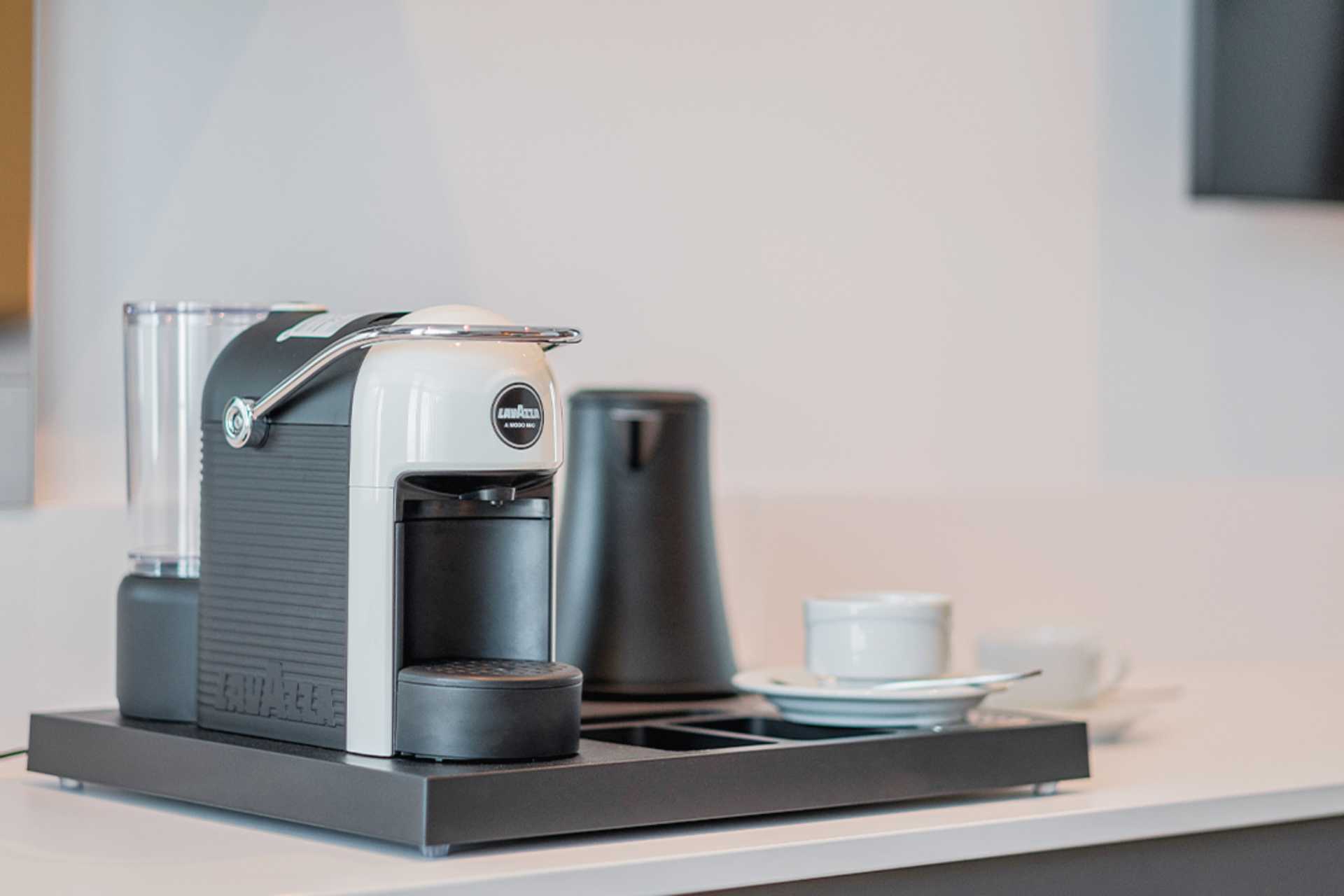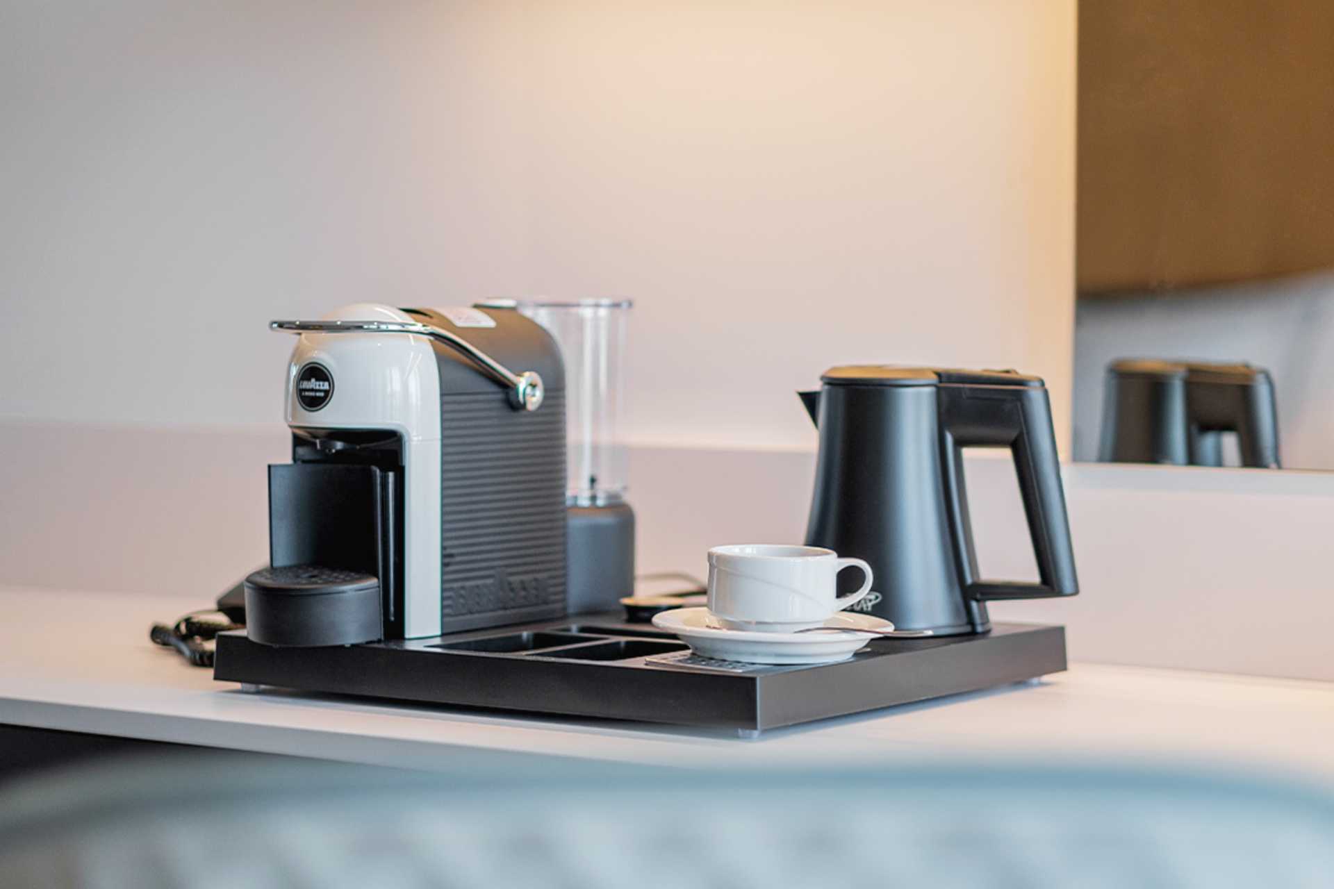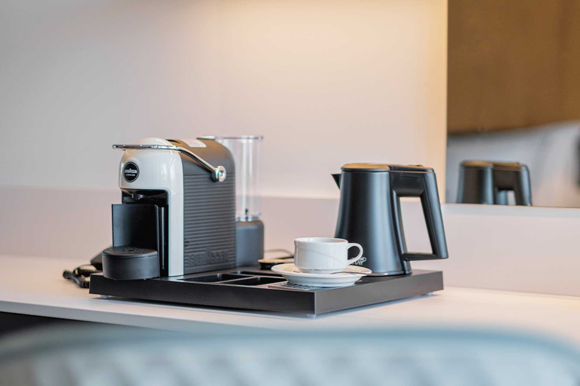 Enkeltværelse med balkon eller terrasse. En dobbeltseng. Gratis wifi, aircondition og deponering. Minibar. Lavazza kaffemaskine - kapsler medfølger. El-kedel og kaffe/te. Tv med internationale kanaler. Væg til væg-tæppe. Hårtørrer. Badeværelse med bruser og toilet. Rengøring 7 gange om ugen.