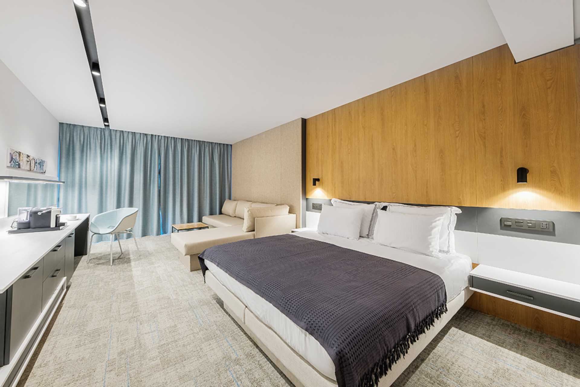 Familie-værelse med balkon eller terrasse og delvis havudsigt. En dobbeltseng og en enkeltseng/del af en sovesofa. Mulighed for ekstra opredning i sovesofa. Gratis wifi, aircondition og deponering. Minibar - vand, sodavand og øl indgår og genopfyldes dagligt. Lavazza kaffemaskine - kapsler indgår. El-kedel og kaffe/te. Tv med internationale kanaler. Væg til væg-tæppe. Hårtørrer. Badeværelse med bruser og toilet. Rengøring 7 gange om ugen.