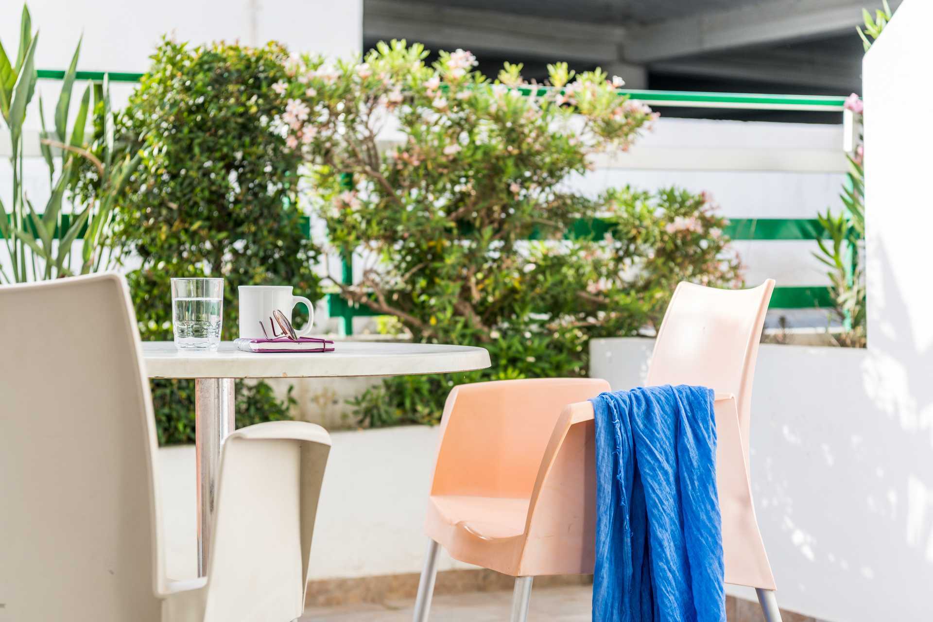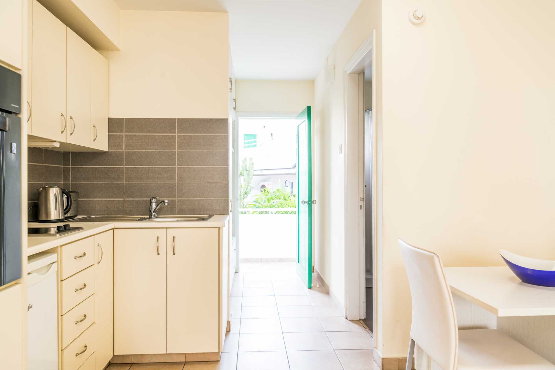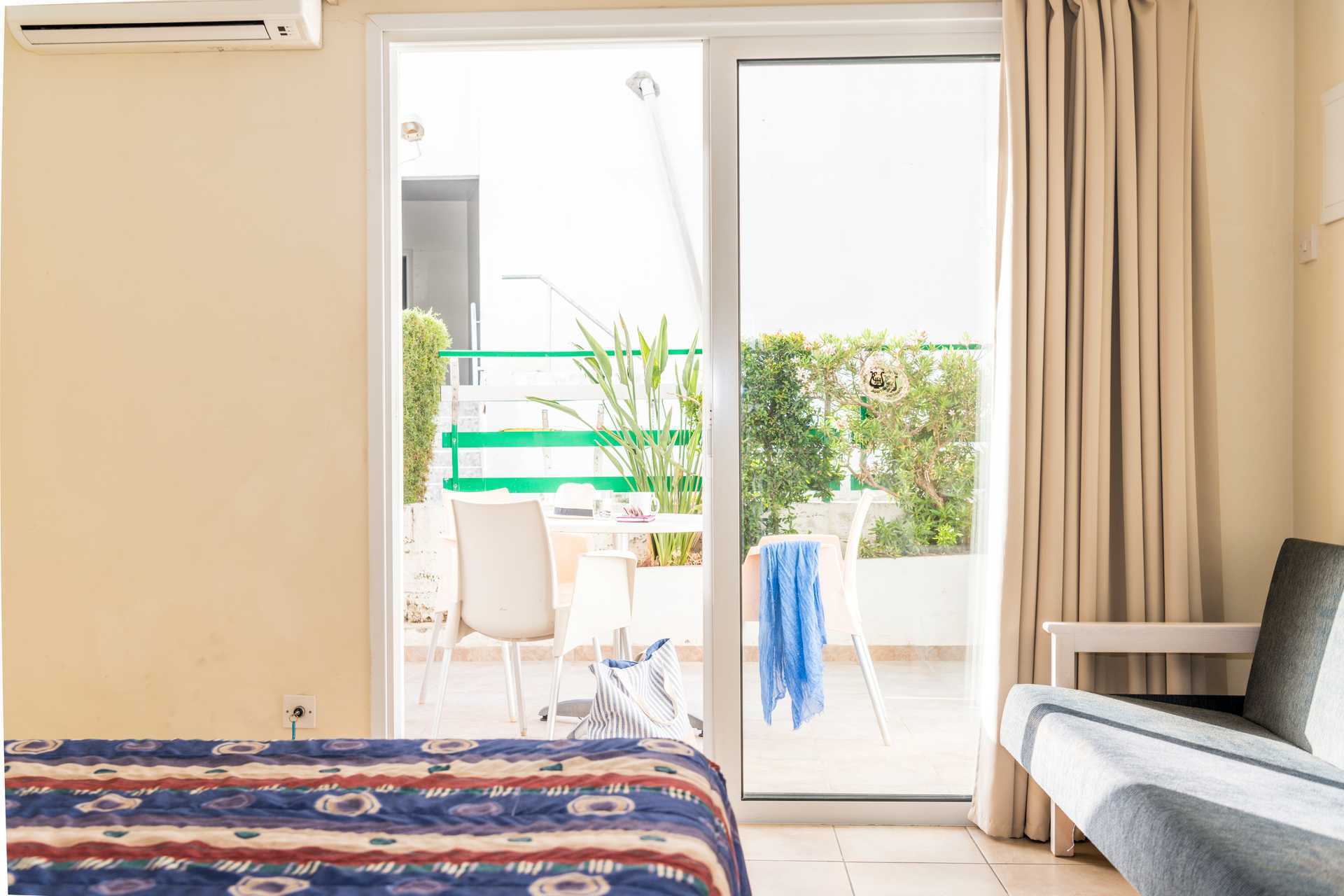 2-værelses lejlighed med balkon eller terrasse i stueplan. Soveværelse og kombineret opholdsrum med minikøkken. To enkeltsenge. Mulighed for ekstra opredninger i sovesofa. Minikøkken med køleskab, kogeplader - nogle med gas, brødrister, el-kedel, lille ovn eller mikrobølgeovn og enkelt køkkenudstyr. Gratis wifi. Aircondition mod betaling, der betales pr. tændt enhed og for mindst tre dage. Tv med internationale kanaler. Hårtørrer. Badeværelse med badekar og bruser samt toilet. Rengøring 6 gange om ugen.