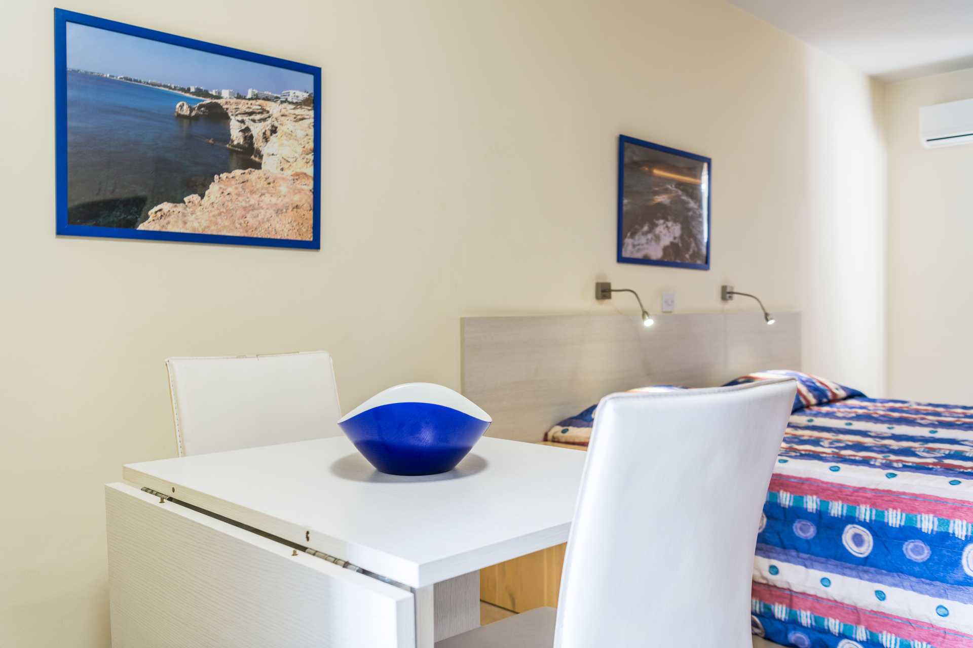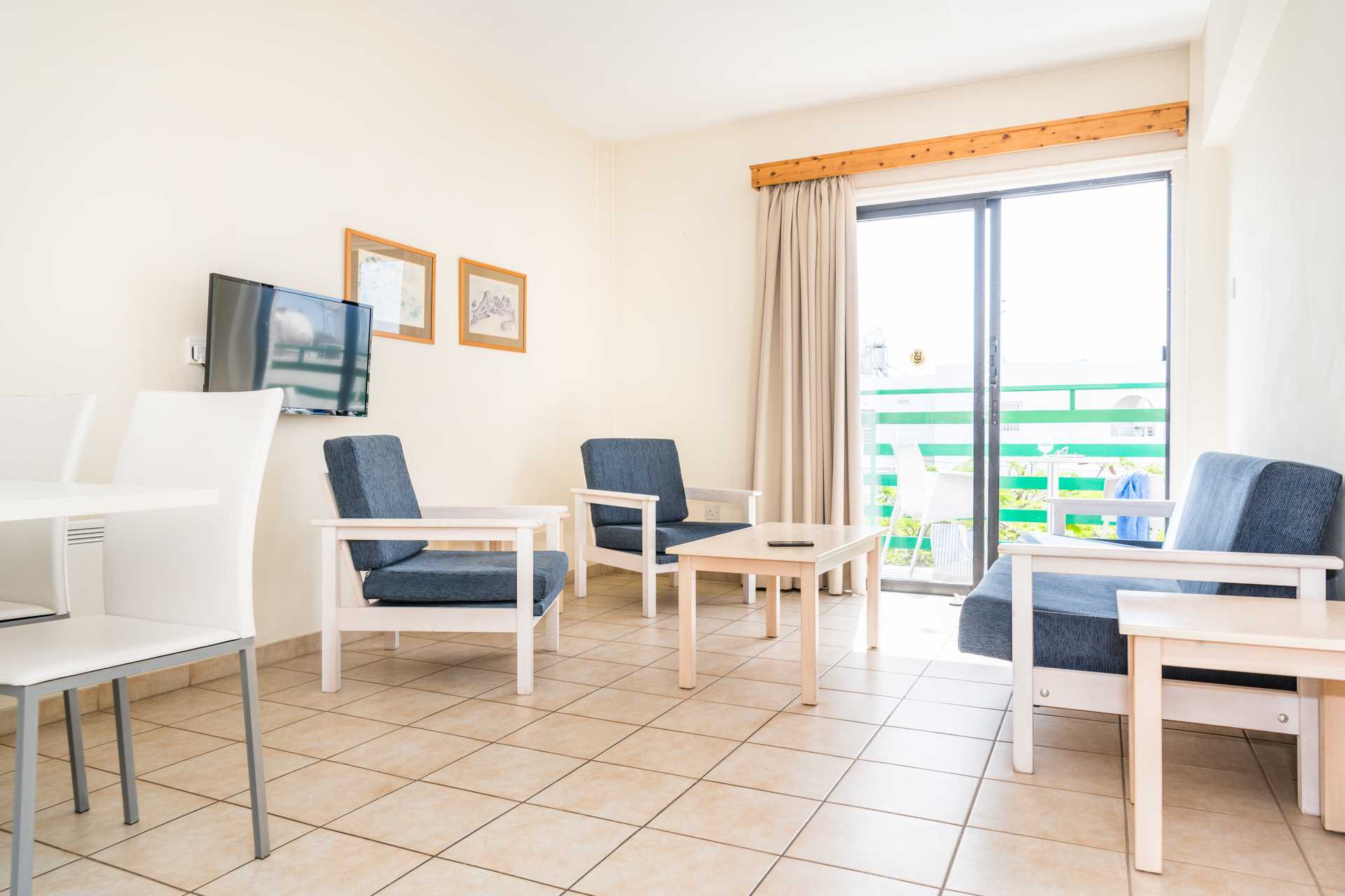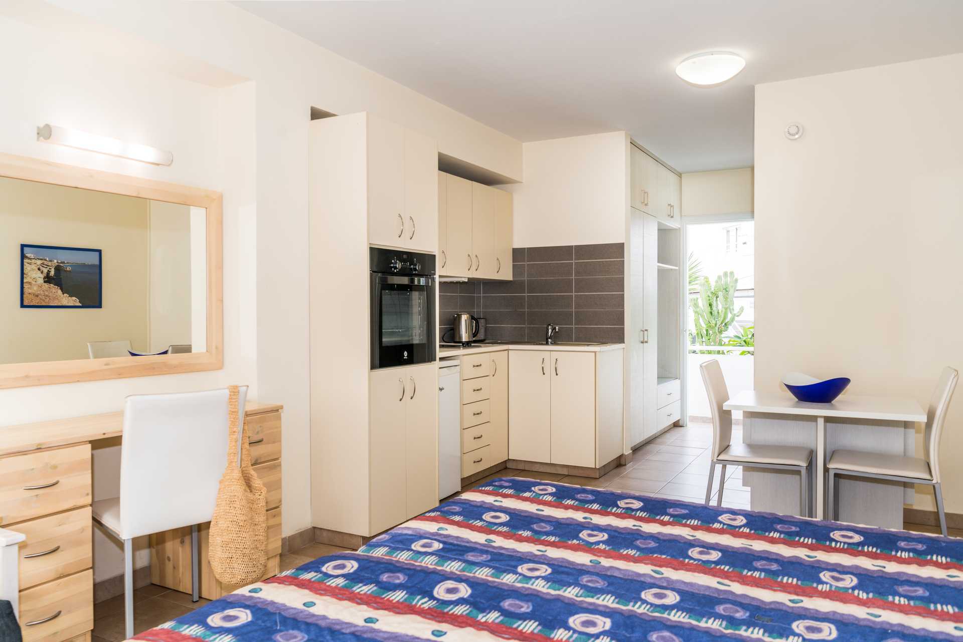 1-værelses lejlighed med balkon eller terrasse. Kombineret soveværelse med minikøkken. To enkeltsenge. Mulighed for ekstra opredning i sovesofa. Minikøkken med køleskab, kogeplader, brødrister, el-kedel, lille ovn eller mikrobølgeovn og enkelt køkkenudstyr. Gratis wifi. Aircondition mod betaling, der betales pr. tændt enhed og for mindst tre dage. De fleste lejligheder har termoruder. Tv med internationale kanaler. Badeværelse med badekar og bruser samt toilet. Rengøring 6 gange om ugen.