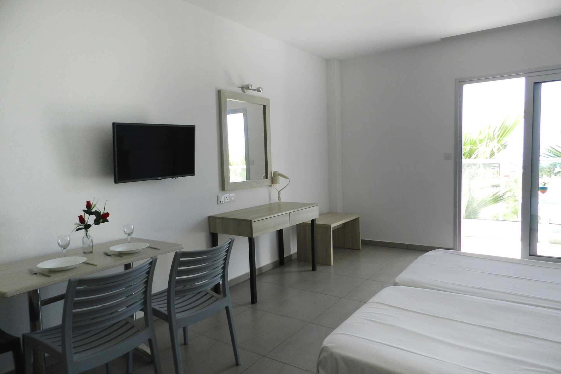 1-værelses lejligheder med balkon. Kombineret soveværelse og minikøkken. Enkeltseng. Mulighed for ekstra opredning i klapseng eller sovesofa. Minikøkken med kogeplader, køleskab, kaffemaskine, el-kedel, brødrister og enkelt køkkenudstyr. Gratis wifi, aircondition og deponering. Tv med internationale kanaler. Bruser og toilet. Rengøring 6 gange om ugen.