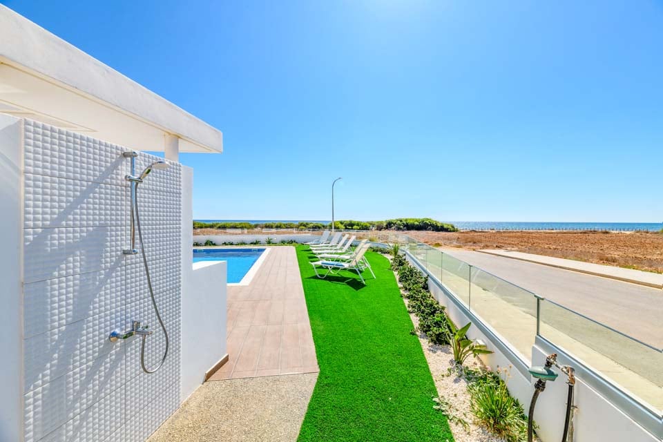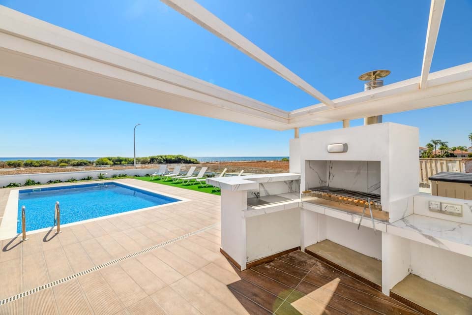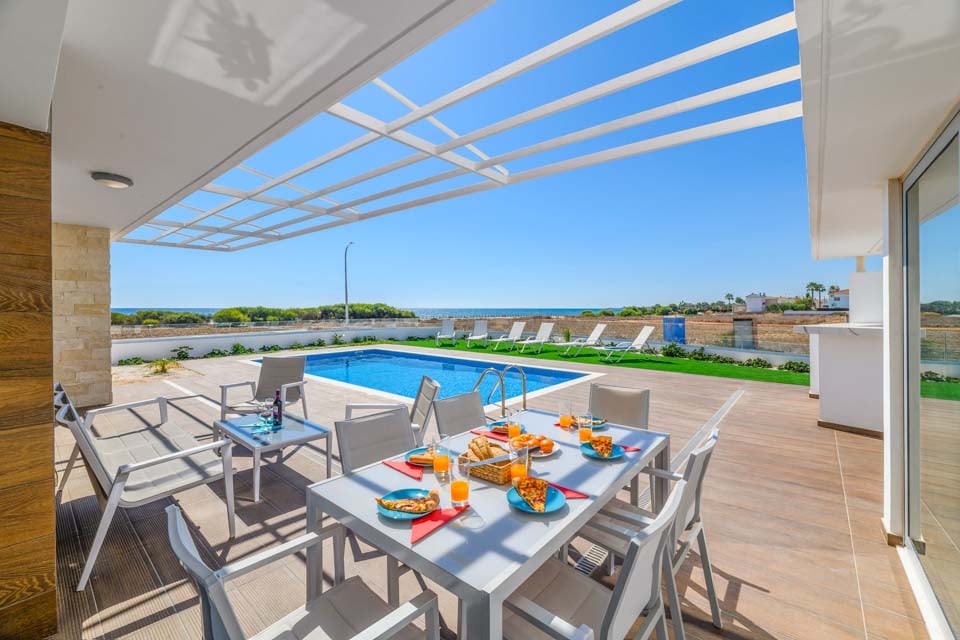 Træd udenfor og bliv betaget af villaens rummelige terrasse, hvor Middelhavets skønhed udfolder sig foran dig. Uanset om du nyder din morgenkaffe, solbader på en liggestol eller nyder en middag under åben himmel, mens solen går ned over havet, er terrassen det perfekte sted at slappe af. Villaens rolige haveområde tilbyder endnu mere plads til at slappe af og nyde de rolige omgivelser.