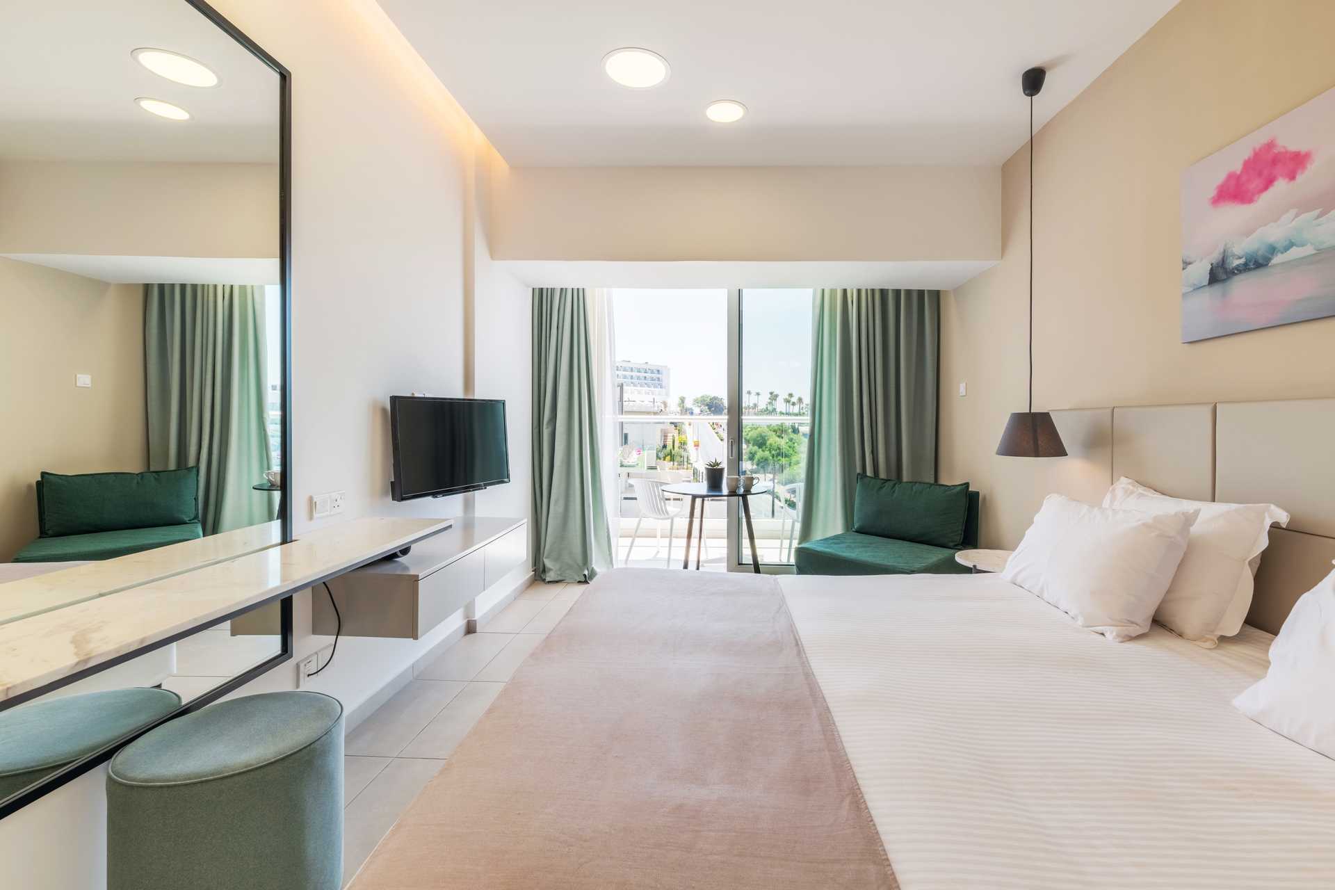 Dobbeltværelser med balkon, nogle med havudsigt eller delvis havudsigt. En dobbeltseng eller to enkeltsenge. Gratis wifi, aircondition og deponering. Minibar. Vand på værelset ved ankomst. El-kedel samt kaffe/te. Tv med internationale kanaler. Hårtørrer. Badekåbe og tøfler. Badeværelse med bruser og toilet. Rengøring 7 gange om ugen. Børn under to år tæller med i det maksimale antal personer på værelset.