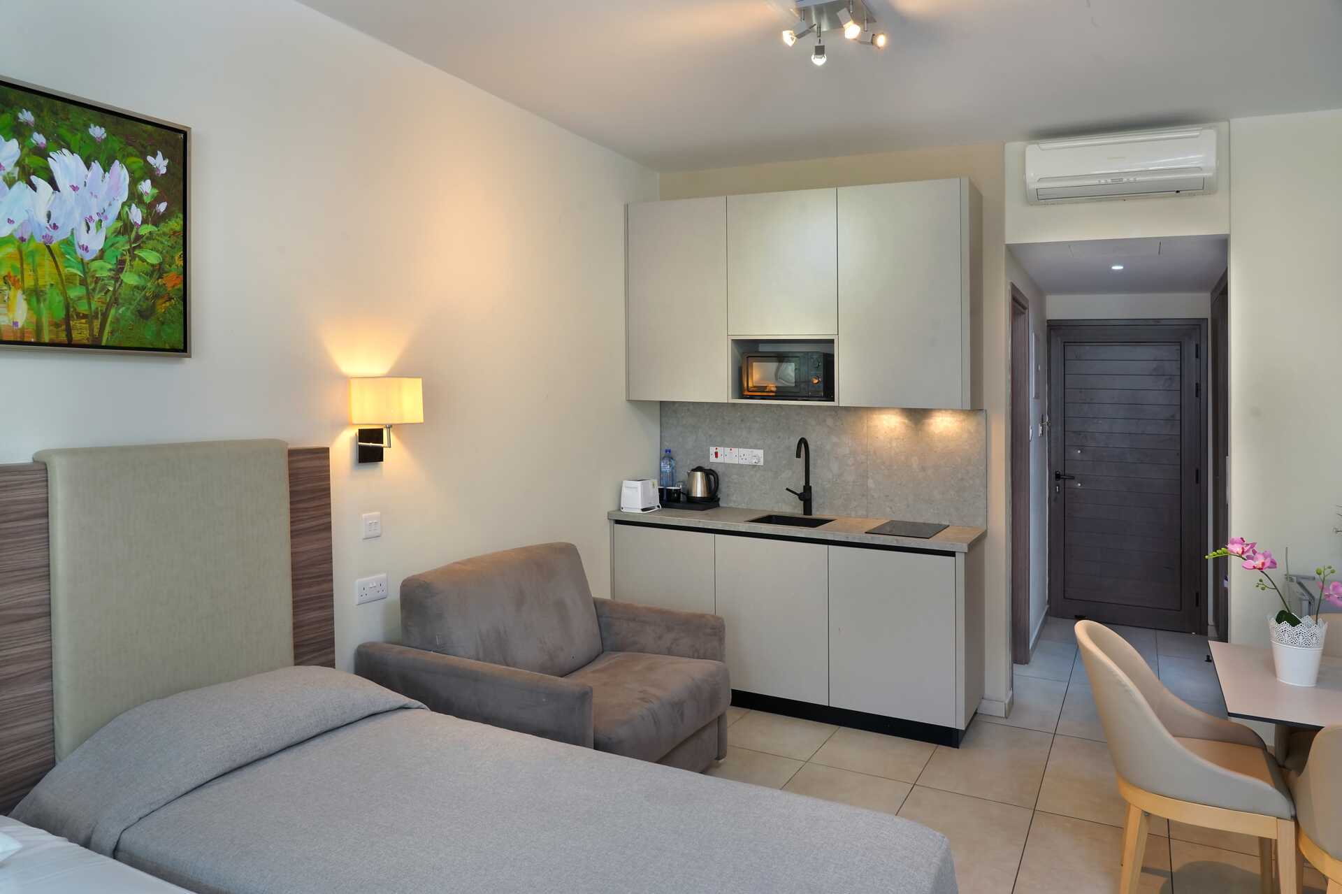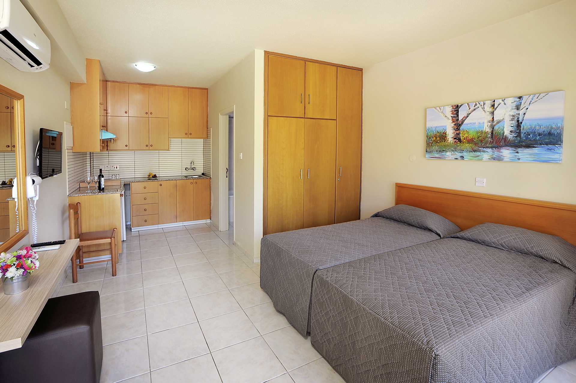 1-værelses lejlighed med balkon eller terrasse, nogle med pooludsigt. Kombineret soveværelse med minikøkken. En dobbeltseng eller to enkeltsenge. Mulighed for ekstra opredning i fold ud-seng. Minikøkken med kogeplader, køleskab, mikroovn, brødrister, kaffemaskine og enkelt køkkenudstyr. Gratis wifi og aircondition. Deponering mod betaling. Tv med internationale kanaler. Hårtørrer. Badeværelse med badekar og toilet. Rengøring 7 gange om ugen.