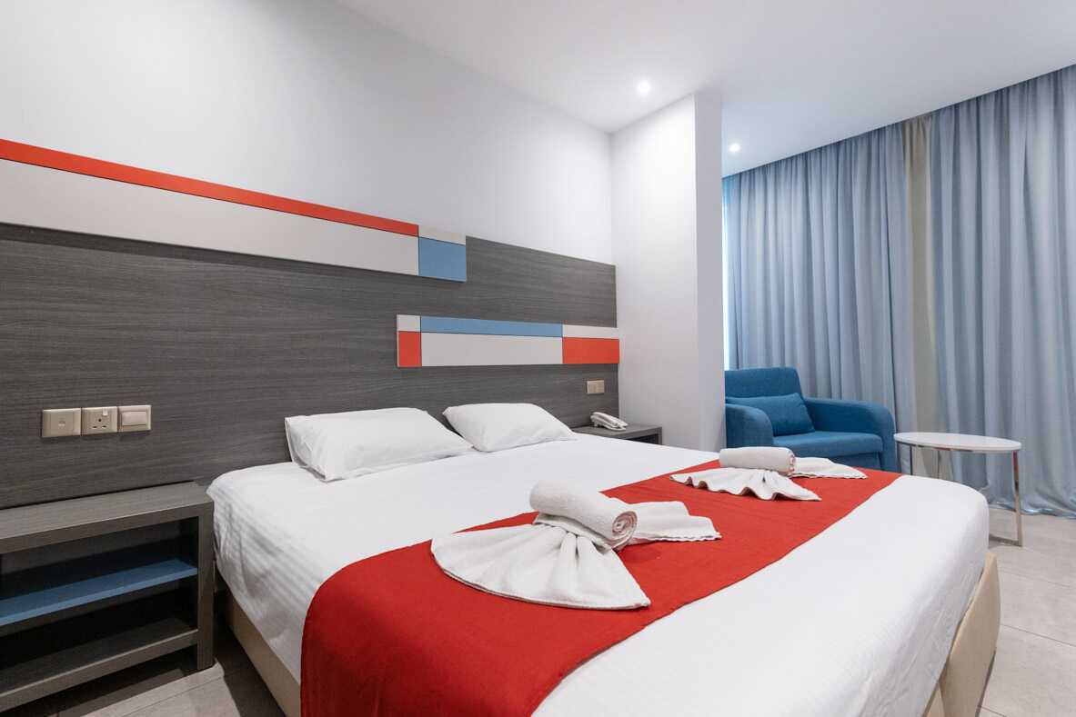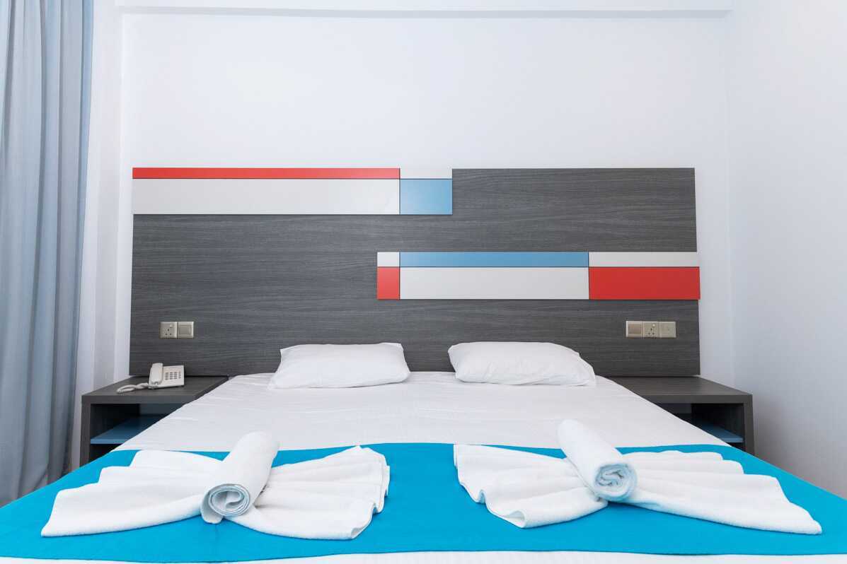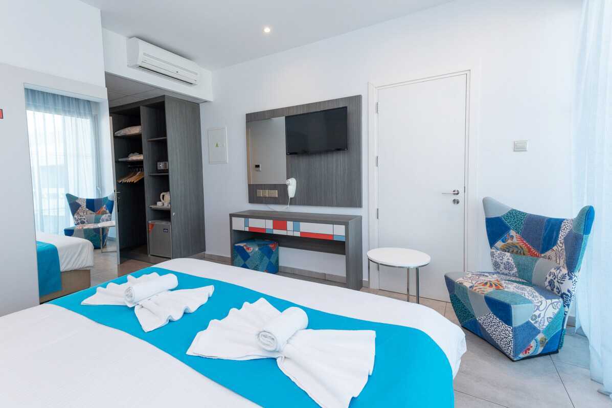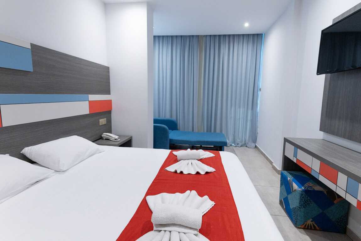 Familie-værelser Superior med balkon. En dobbeltseng eller to enkeltsenge. Mulighed for ekstra opredning i en fold ud-seng, en lænestol eller en køjeseng. Gratis wifi, aircondition og deponering. Køleskab. Tv med internationale kanaler. Hårtørrer. Badeværelse med bruser og toilet. Rengøring 7 gange om ugen. Børn under to år tæller med i det maksimale antal personer på værelset.