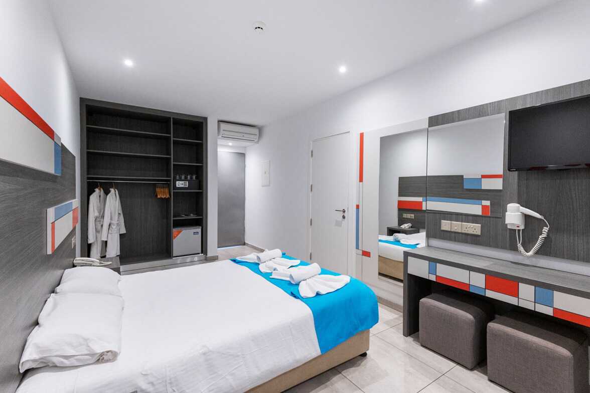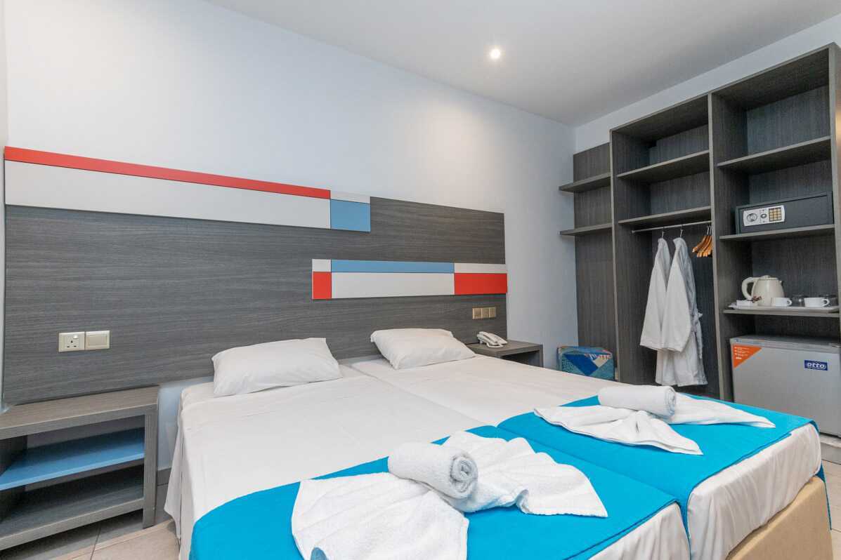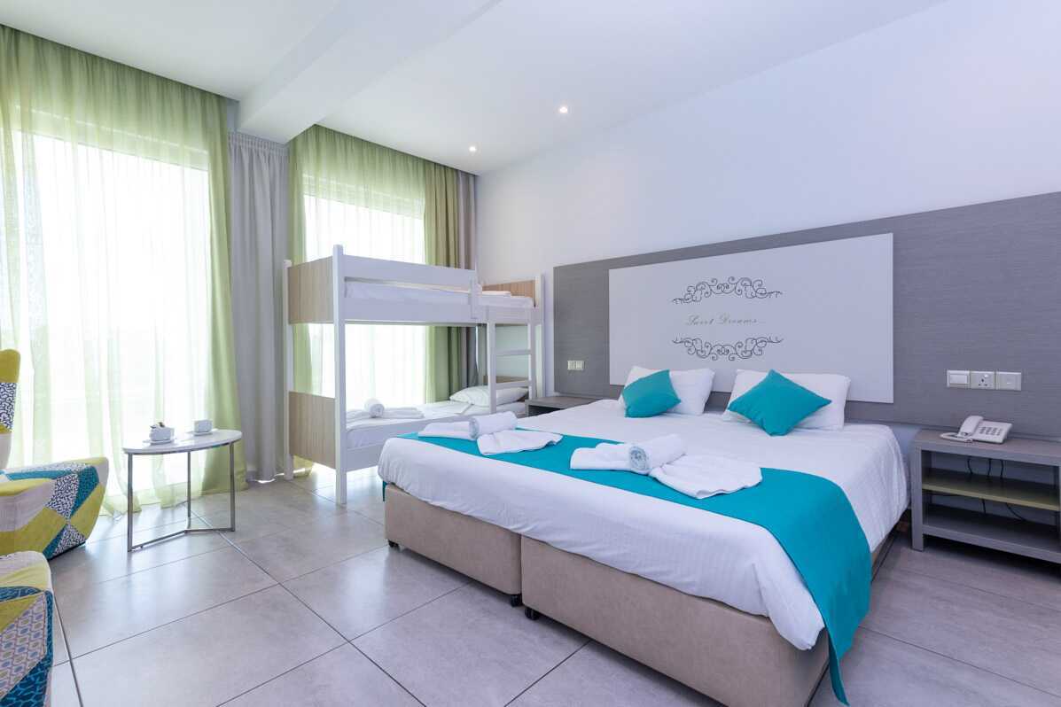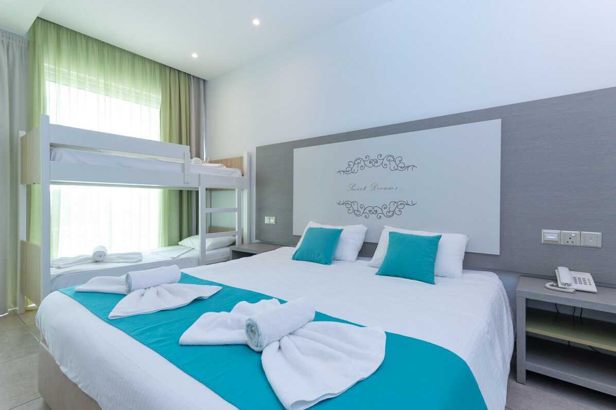 Familie-værelser Superior med balkon. En dobbeltseng eller to enkeltsenge. Mulighed for ekstra opredning i en fold ud-seng, en lænestol eller en køjeseng. Gratis wifi, aircondition og deponering. Køleskab. Tv med internationale kanaler. Hårtørrer. Badeværelse med bruser og toilet. Rengøring 7 gange om ugen. Børn under to år tæller med i det maksimale antal personer på værelset.