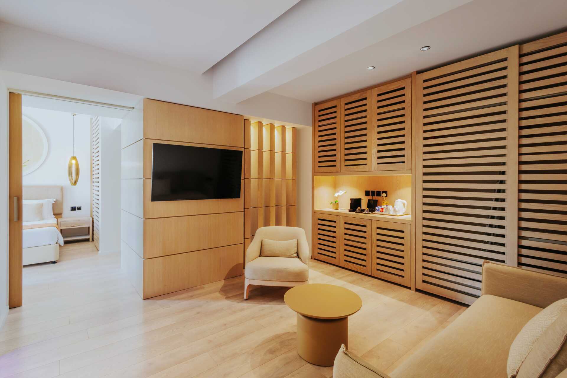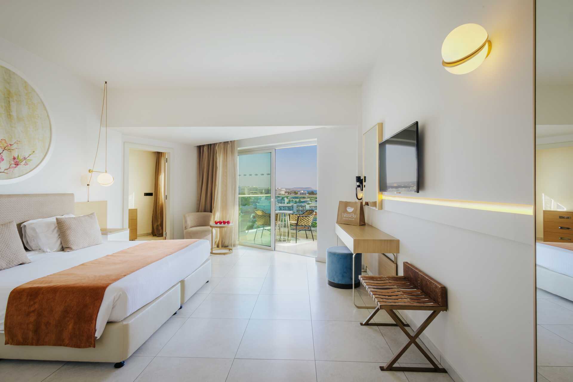 Junior-suite Premium med balkon og delvis havudsigt. Junior-suiten består af et soveværelse og et opholdsrum med skydedør mellem rummene. En dobbeltseng eller to enkeltsenge. Mulighed for ekstra opredning i sovesofa. Gratis wifi, aircondition og deponering. Minibar mod betaling. El-kedel og kaffe/te. Et tv med internationale kanaler i hvert værelse. Badekåber og tøfler. Hårtørrer. Badeværelse med badekar/bruser og toilet samt separat toilet. Rengøring 7 gange om ugen. Børn under to år tæller med i det maksimale antal personer på værelset.