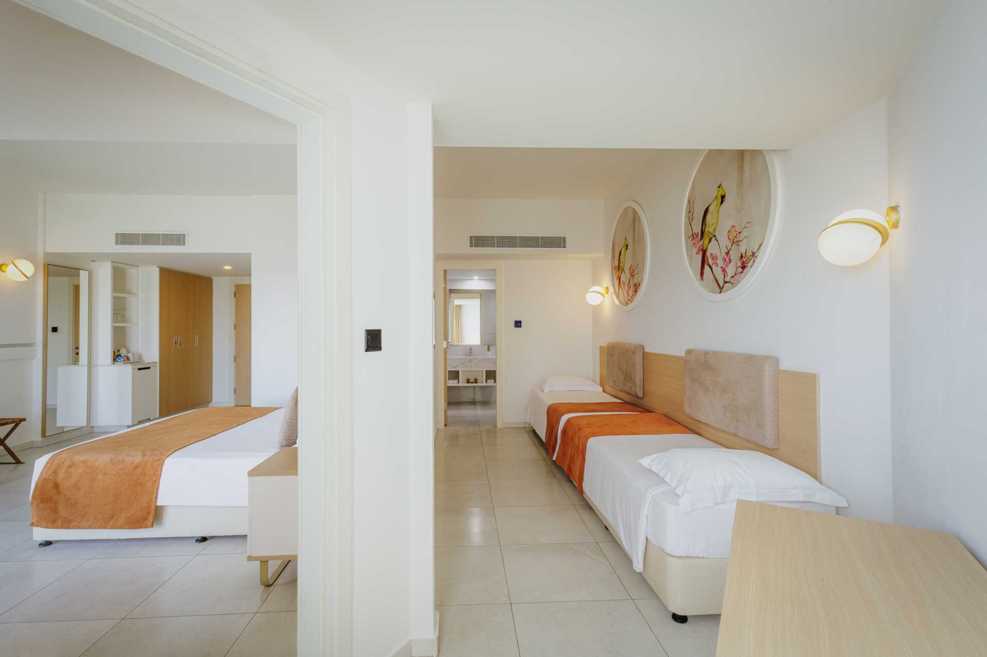 Familie-værelser med balkon og havudsigt. Familie-værelset består af to soveværelser, et med dobbeltseng og et med to enkeltsenge. Gratis wifi, aircondition og deponering. Minibar mod betaling. El-kedel og kaffe/te. Tv med internationale kanaler. Badekåber og tøfler. Hårtørrer. Badeværelse med badekar eller bruser samt toilet. Rengøring 7 gange om ugen. Børn under to år tæller med i det maksimale antal personer på værelset.