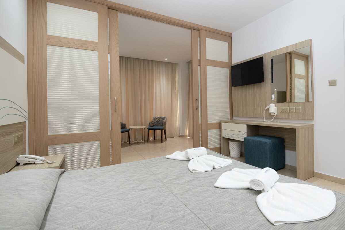 Familie-suite med balkon og havudsigt. Suiterne består af et soveværelse og et opholdsrum, der kan adskilles med en skydedør. En dobbeltseng eller to enkeltsenge. Mulighed for ekstra opredning i køjeseng. Gratis wifi og aircondition. Deponering mod betaling. Køleskab. El-kedel og kaffe/te. Tv med internationale kanaler. Hårtørrer. Badeværelse med badekar eller bruser samt toilet. Rengøring 7 gange om ugen.