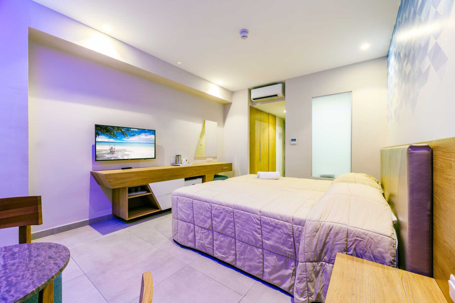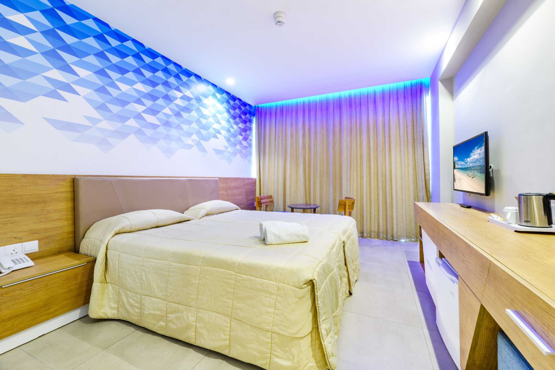 Deluxe-værelse med balkon, nogle med pooludsigt. En dobbeltseng eller to enkeltsenge. Mulighed for ekstra opredning i fold ud-seng. Gratis wifi, aircondition og deponering. Køleskab. El-kedel og kaffe/te. Tv med internationale kanaler. Strygejern og strygebræt. Hårtørrer. Badeværelse med bruser og toilet. Rengøring 7 gange om ugen.