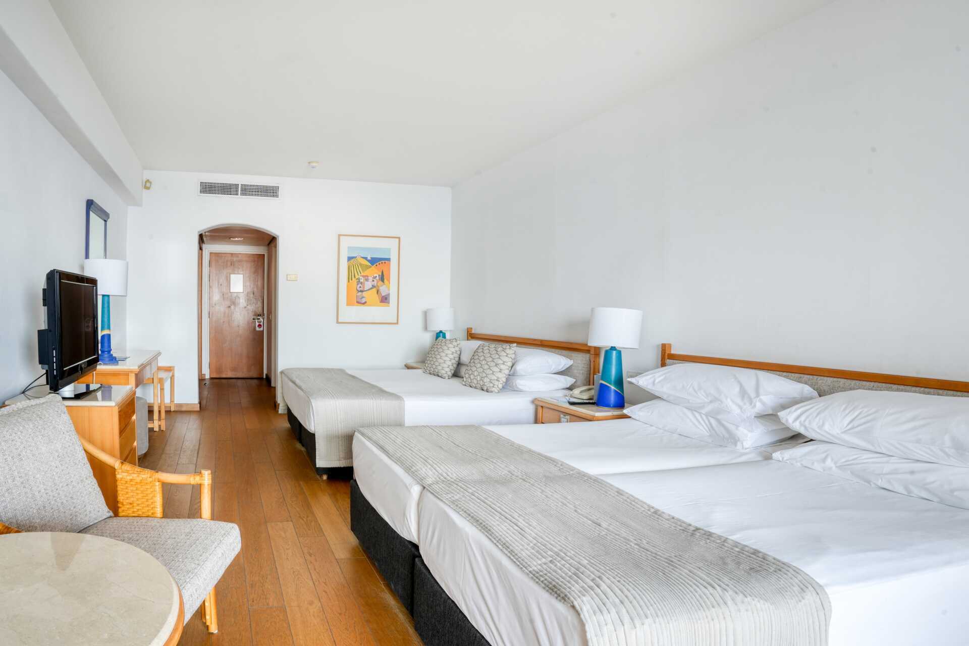 Dobbeltværelse med balkon. Nogle balkoner har havudsigt eller delvis havudsigt. En dobbeltseng og en enkeltseng. Mulighed for ekstra opredning i sovesofa. Gratis wifi, aircondition og deponering. Minibar mod betaling. El-kedel og kaffe/te. Tv med internationale kanaler. Hårtørrer. Badeværelse med badekar og toilet. Rengøring 7 gange om ugen. Børn under to år tæller med i det maksimale antal personer på værelset.