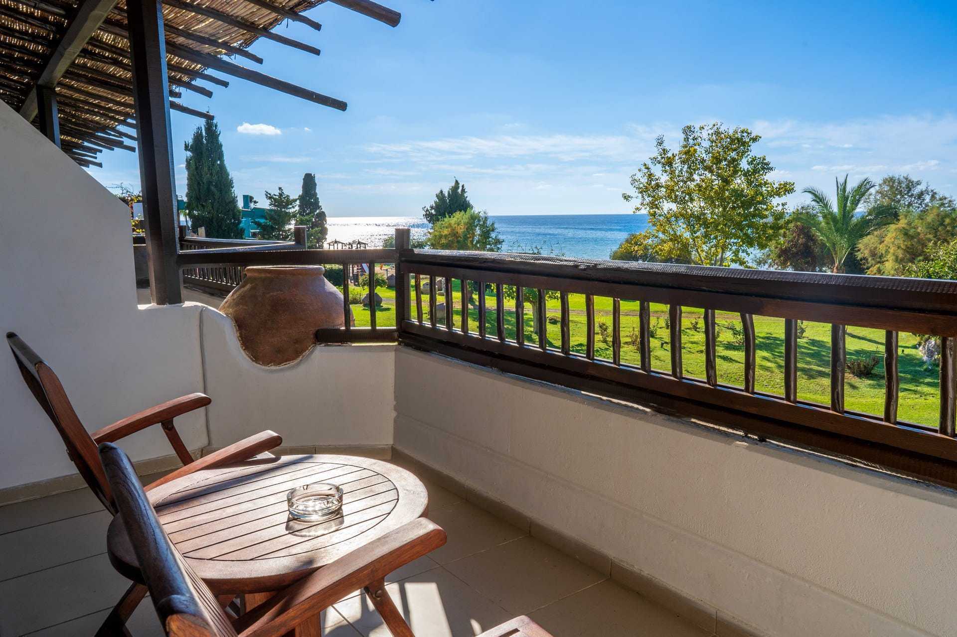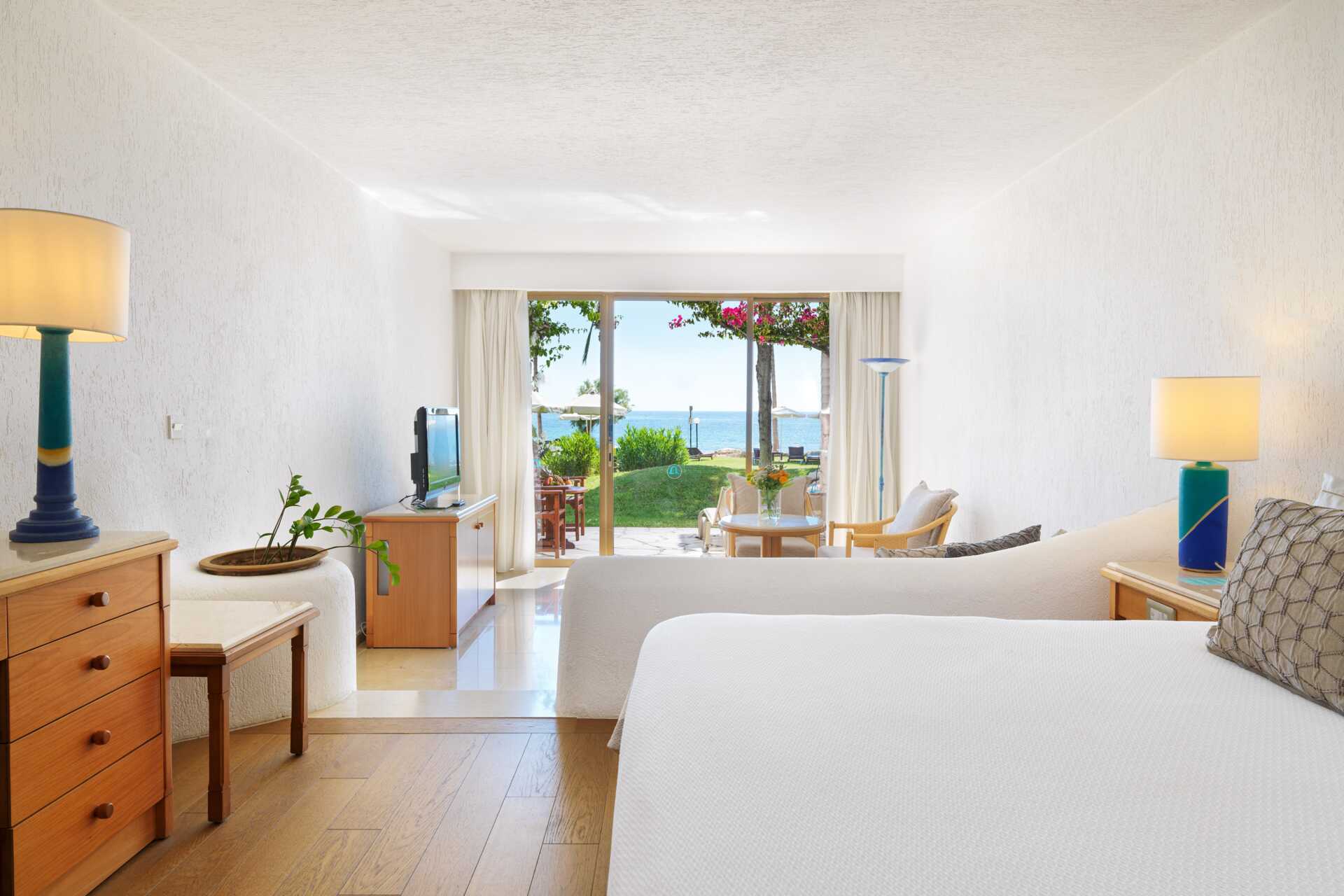 Suite med terrasse i stueplan. Suiten ligger med både haven og havet udenfor. Et par trin adskiller soveværelset fra opholdsrummet. En dobbeltseng og en enkeltseng. Mulighed for ekstra opredning i sovesofa. Gratis wifi, aircondition og deponering. Minibar mod betaling. El-kedel og kaffe/te. Tv med internationale kanaler. Hårtørrer. Badeværelse med badekar og toilet. Rengøring 7 gange om ugen. Børn under to år tæller med i det maksimale antal personer på værelset.