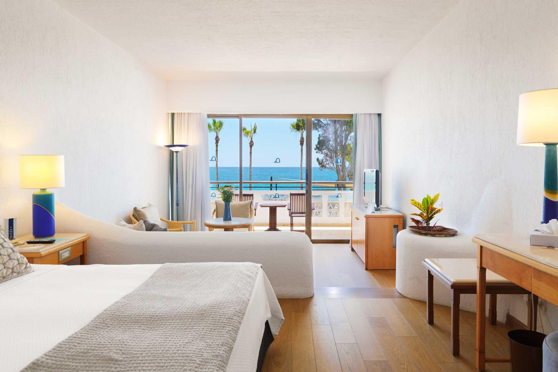 Junior-suite med balkon og havudsigt. En dobbeltseng og en enkeltseng. Mulighed for ekstra opredninger i sovesofa. Gratis wifi, aircondition og deponering. Minibar mod betaling. El-kedel og kaffe/te. Tv med internationale kanaler. Hårtørrer. Badeværelse med bruser og toilet. Rengøring 7 gange om ugen. Børn under to år tæller med i det maksimale antal personer på værelset.