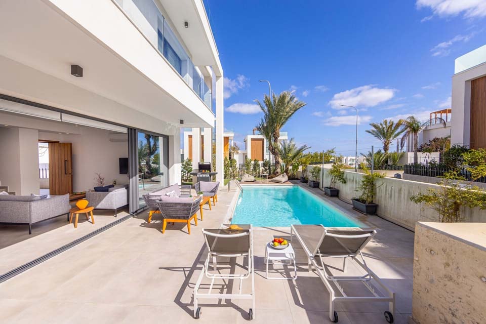 Villa By The Bay 32 er ideel for dem, der ønsker at bo i hjertet af Protaras, og er et godt valg for op til seks gæster. Alternativt kan disse to villaer bookes sammen, lige ved siden af søstervillaen By The Bay 33, for større bookinger på op til tolv personer. Denne villa er et fantastisk eksempel på moderne cypriotisk arkitektur og er blevet kærligt designet både indvendigt og udvendigt for at sikre, at dit ophold bliver så behageligt som muligt. Denne villa er indrettet og møbleret til en høj standard og er lys og luftig, indbydende og komfortabel. Du finder en åben stue og køkken med gulv-til-loft-terrassedøre, der fører ud til din helt egen terrasse ved poolen. Ovenpå finder du tre soveværelser med aircondition, så du kan få et behageligt ophold.