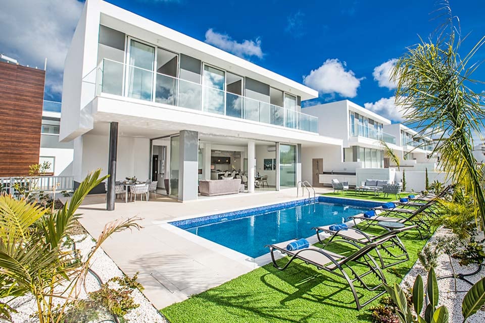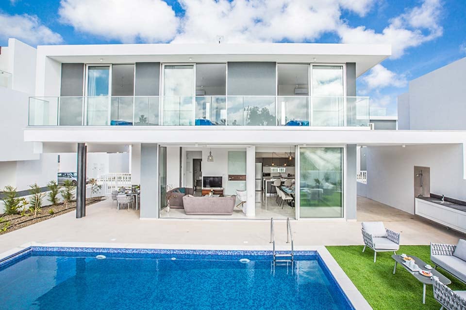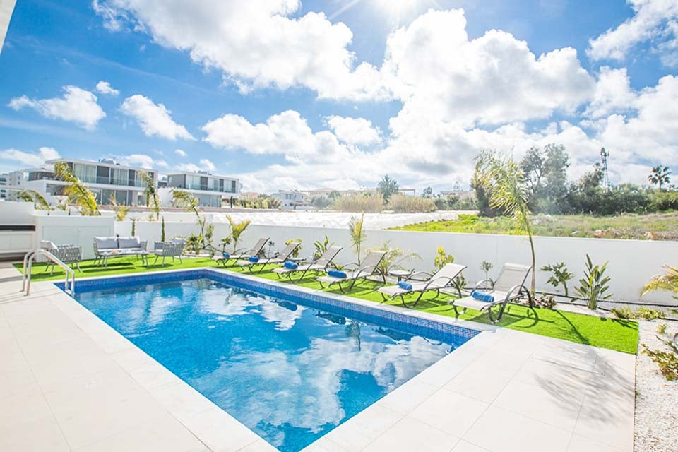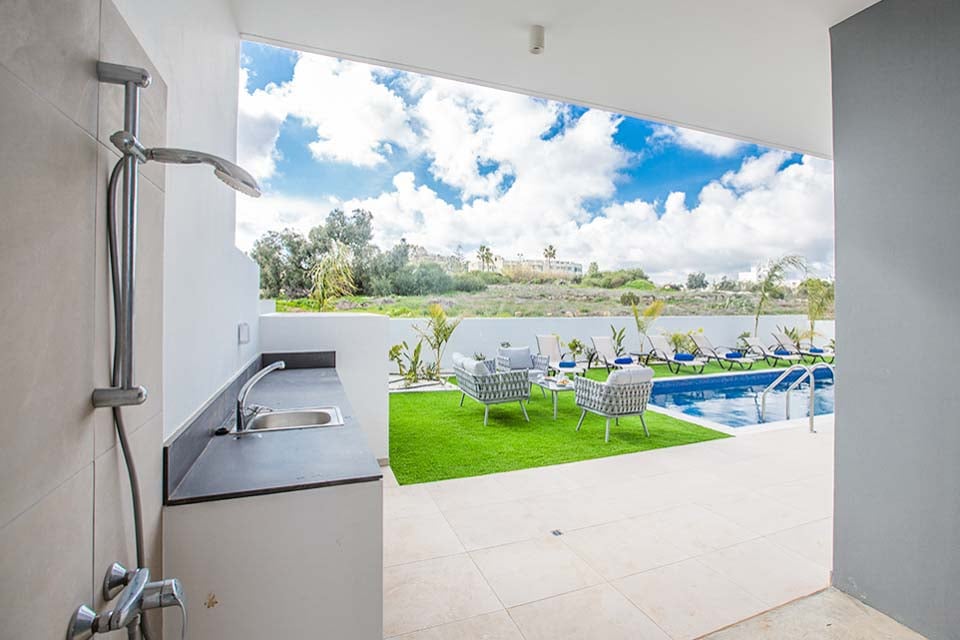 Olivine Villa 21 er en moderne skønhed med firkantet design og elegant arkitektur. Interiøret er oversvømmet med gyldent sollys fra de høje glasvinduer, hvilket får hele opholdsrummet til at føles lyst og varmt. Et bredt sæt skydedøre bringer udefra indenfor og smelter sammen med en moderne lounge designet med enkel indretning, friske hvide vægge og luksuriøse møbler. På den ene side er det fuldt udstyrede køkken, ideelt til selvforplejning, med en stilfuld morgenmadsbar og alt hvad du behøver for at lave lækre måltider. For grillentusiaster er der et dedikeret udendørsområde med bordplade til at tilberede et festmåltid. Spis indenfor omkring det elegante bord eller under den strålende solskin på terrassen.