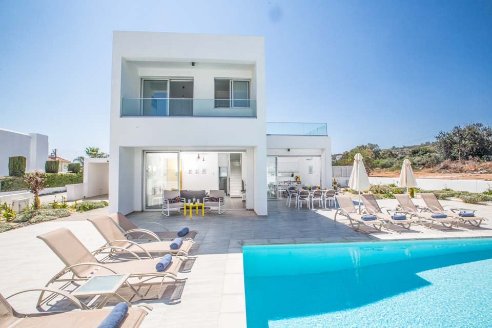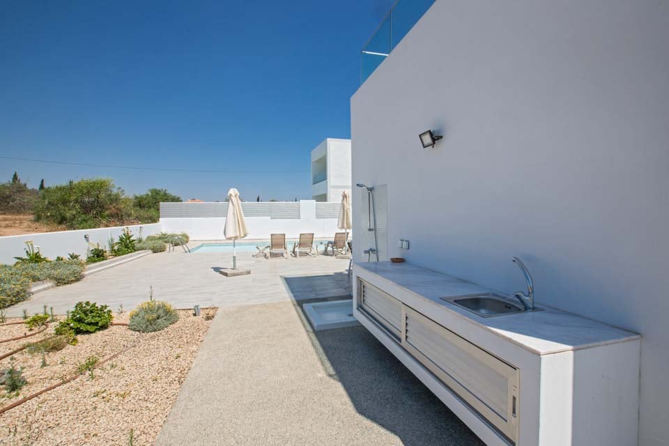 Udenfor venter den varme glød fra den cypriotiske sol. Det rummelige haveområde er din egen private oase, centreret omkring en glitrende swimmingpool med overløb. Slap af i behagelige liggestole, nyd de varme stråler, og saml jer omkring det indbydende udendørs siddeområde til udendørs måltider fra grillen, mens de glitrende stjerner kommer frem.