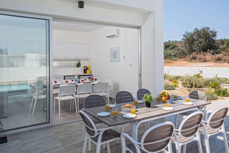 Udenfor tilbyder villaen en moderne terrasse med en ren hvid facade, der skiller sig ud mod den blændende azurblå himmel. Når du træder ind ad entréen, byder et pust af frisk, moderne charme dig velkommen. Den rummelige stue, spisestue og køkkenal flyder problemfrit over i et rum badet i naturligt lys, der strømmer ind gennem terrassedørene. Stuen er hjemsted for bløde sofaer og et fladskærms-tv, mens køkkenet kan prale af en række moderne bekvemmeligheder, herunder køleskab, elkedel, mikrobølgeovn, brødrister og opvaskemaskine.