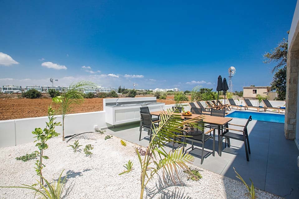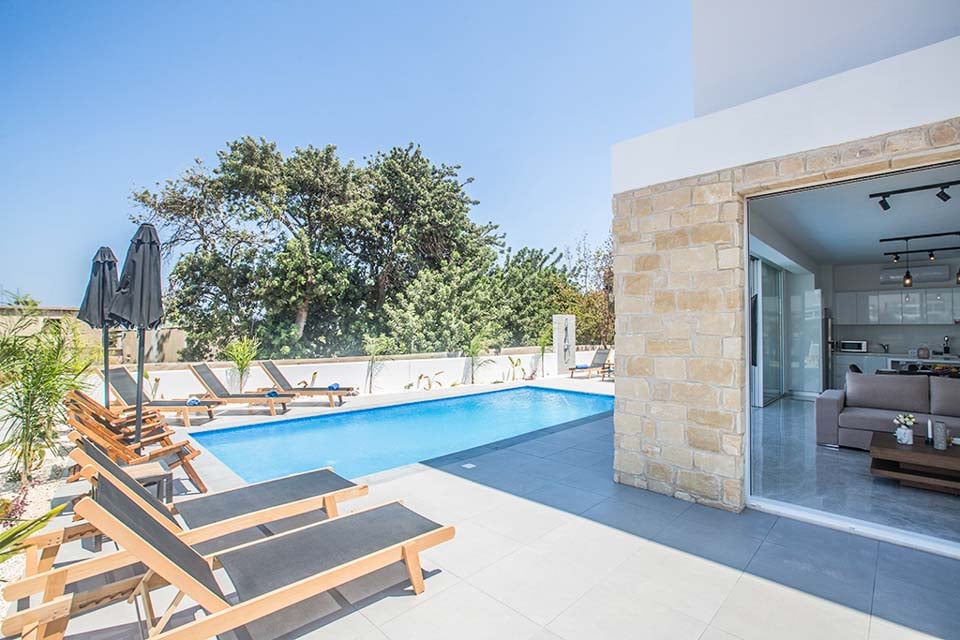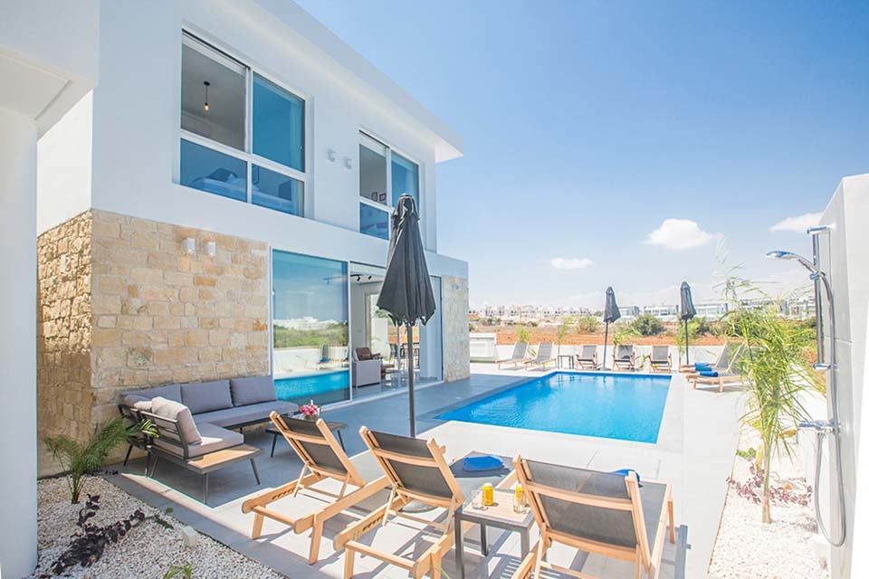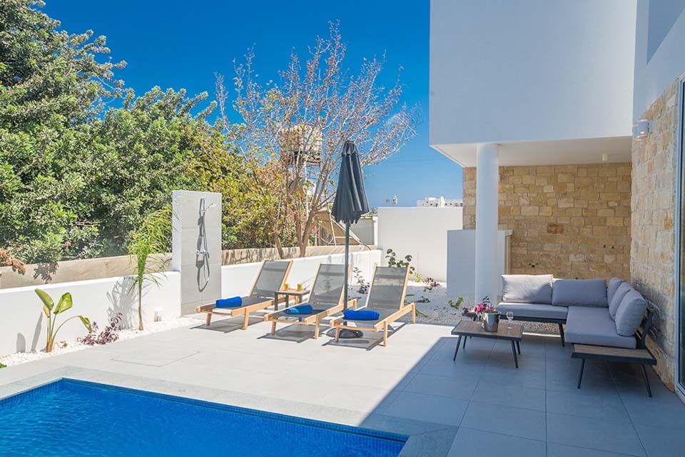 Vie Bleu 2 ligger i det populære feriested Protaras, blot 5 minutters gang fra strande, butikker, restauranter og barer. Fantastiske villaer med en ideel beliggenhed, men alligevel tæt nok på stranden til at nyde en slentretur. Et godt valg for familier eller vennegrupper, der søger en afslappende og hyggelig ferie.