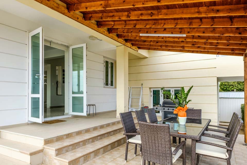 Overdækket terrasse, udendørs servering, udendørs spisefaciliteter, spisefaciliteter, grill, gasgrill, havemøbler, liggestole, parasol
