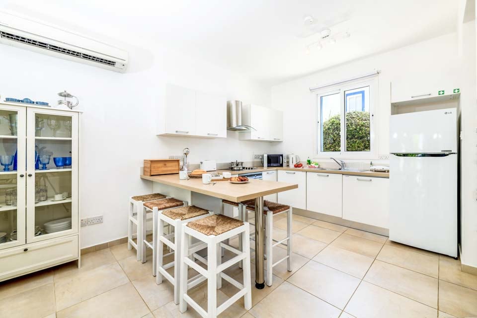 Nyd afslapning udendørs på havesofaerne, eller slap af i det intime køkken/opholdsstue, der er ideelt til at tilberede måltider eller blot nyde en doven aften. Med parkering uden for vejen tilbyder villaen både komfort og praktiske funktioner i en livlig og bekvem beliggenhed. Uanset om du nyder solen eller udforsker den nærliggende kystlinje, er denne villa en god base for din ferie på Cypern.