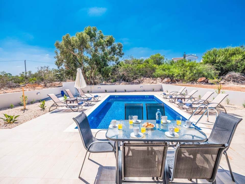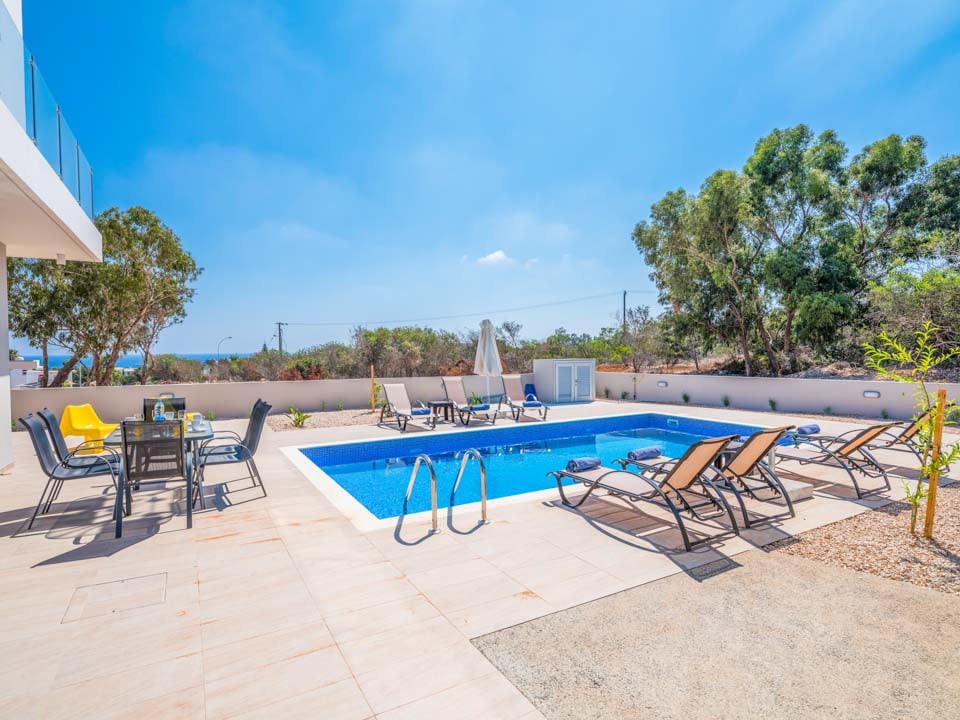 Udenfor, i den store rummelige have, finder du en grill, udendørs spiseplads, udendørs bruser, liggestole og en stor privat pool med udsigt over havudsigten. En smuk og moderne villa, det ideelle valg for dem, der søger en fredelig og afslappende ferie.
