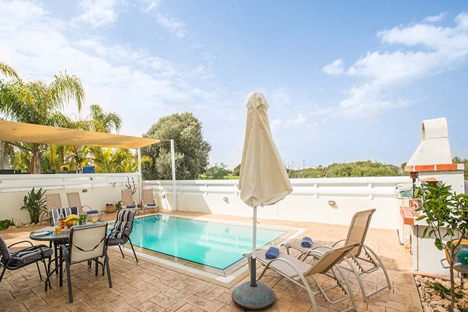 Udenfor den private og lukkede have er der en 8 x 4 meter pool omgivet af liggestole samt en parasol og overdækket terrasse for den vigtige skygge fra sommersolen. Et havebord og stole samt en indbygget grill og vaskeområde giver de perfekte rammer til udendørs spisning og underholdning i de lange sommeraftener. Alt i alt er dette en fantastisk villamulighed for familier, der ønsker at holde ferie ikke langt fra alle faciliteter
