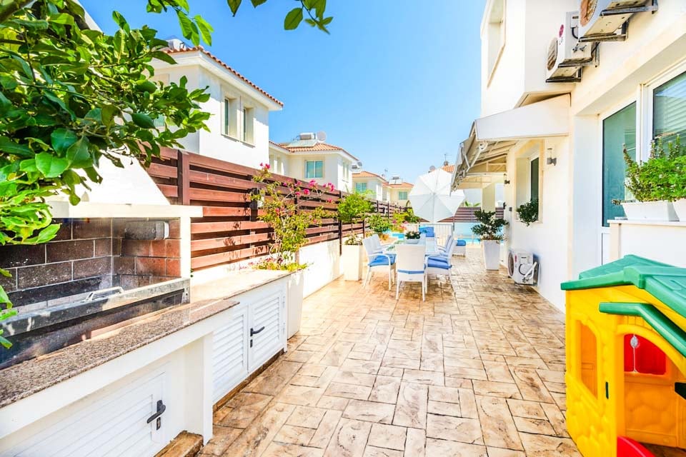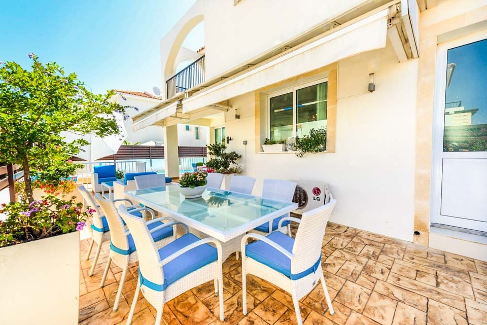 Udenfor tilbyder villaens indhegnede poolterrasse en privat oase til afslapning. Tag en dukkert i den indbydende swimmingpool, sol dig i Cyperns solskin, eller nyd måltider under åben himmel i skyggen.