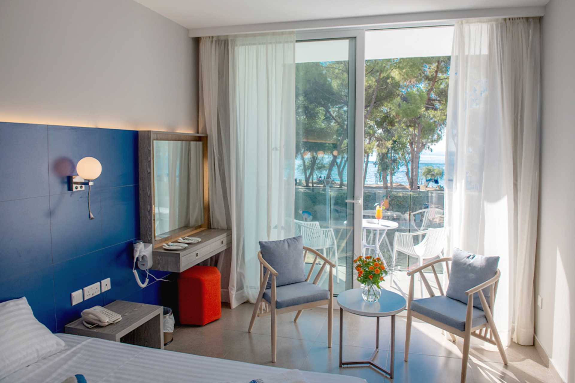 Dobbeltværelse med balkon og havudsigt. En dobbeltseng eller to enkeltsenge. Mulighed for ekstra opredning i sovesofa eller fold ud-seng. Gratis wifi, aircondition og deponering. Minibar. Tv med internationale kanaler. Hårtørrer. Badeværelse med bruser og toilet. Rengøring 7 gange om ugen. Børn under to år tæller med i det maksimale antal personer på værelset.