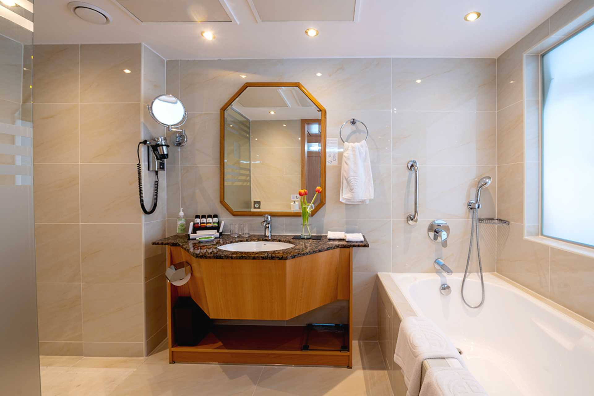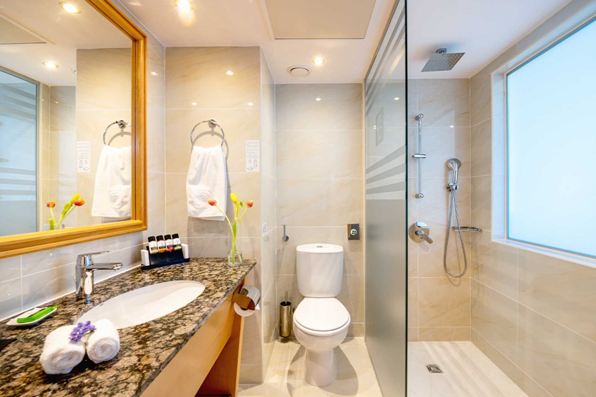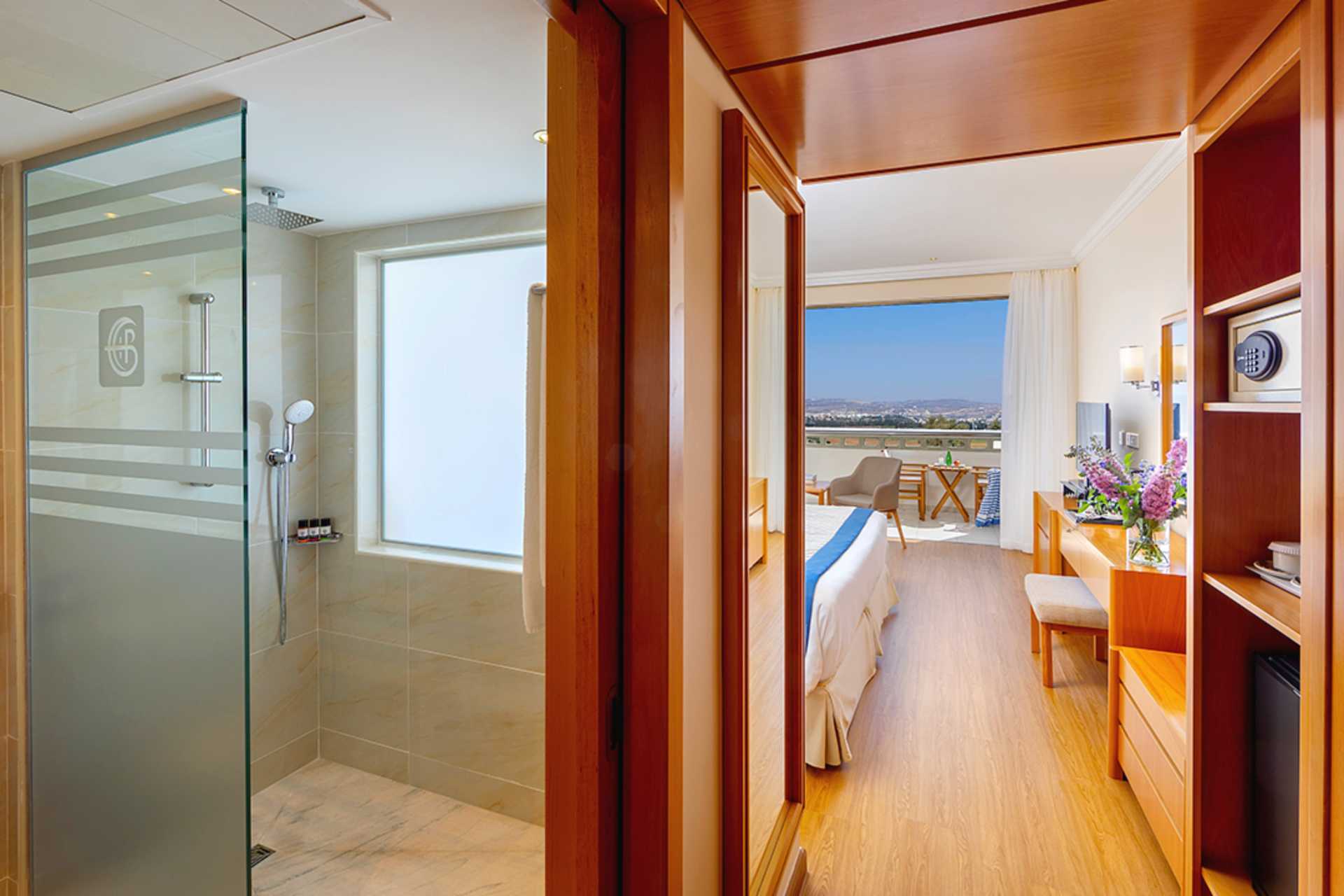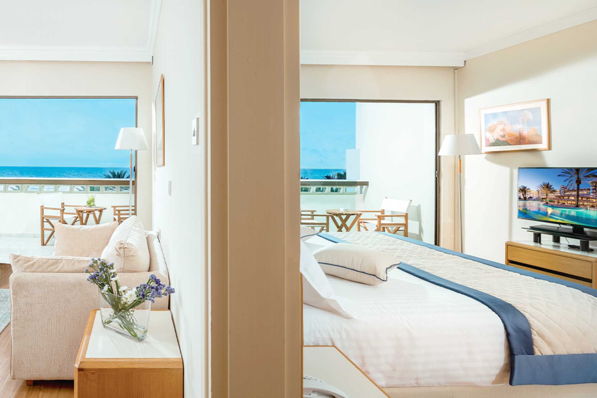 Familie-suite med balkon og havudsigt. Et soveværelse og et opholdsrum. En dobbeltseng eller to enkeltsenge. Mulighed for ekstra opredninger i sovesofa. Gratis wifi, aircondition og deponering. Køleskab. El-kedel og kaffe/te. Espressomaskine - kapsler er ikke inkluderet, men kan købes på hotellet. Tv med internationale kanaler. Strygejern og strygebræt. Hårtørrer. Badekåber og tøfler. To badeværelser, begge med badekar og toilet. Rengøring 7 gange om ugen.
