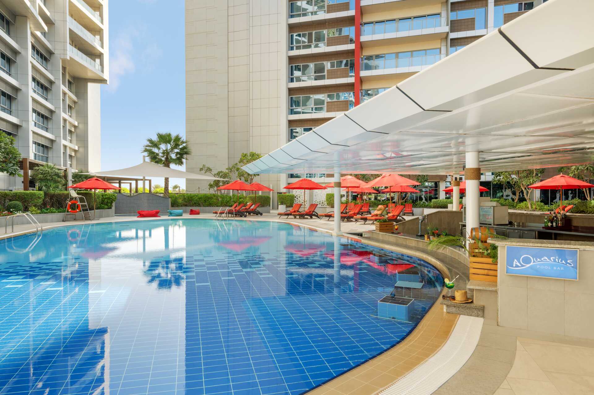 Park Rotana har et dejligt poolområde med en tempereret pool, børnepool med solbeskyttelse og en swim up-bar. Solstole og parasoller. Poolhåndklæder indgår.