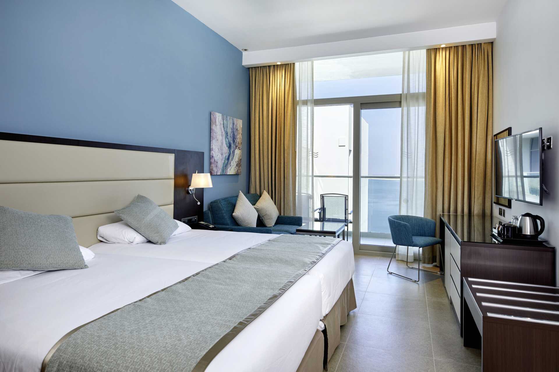 Dobbeltværelse med balkon, nogle med havudsigt eller delvis havudsigt. En dobbeltseng eller to enkeltsenge. Mulighed for ekstra opredning i sovesofa eller fold ud-seng. Gratis wifi, aircondition og deponering. Loftsvifte. El-kedel. Tv med internationale kanaler. Hårtørrer. Badeværelse med badekar eller bruser samt toilet. Rengøring 7 gange om ugen.