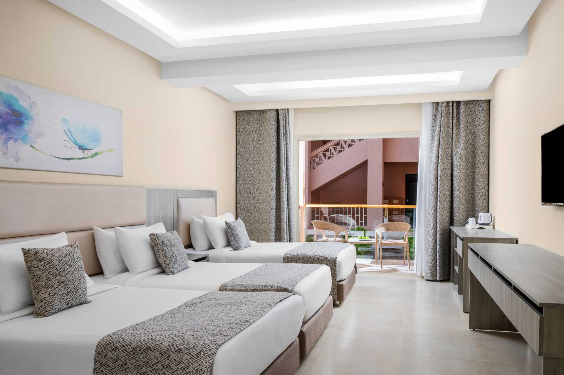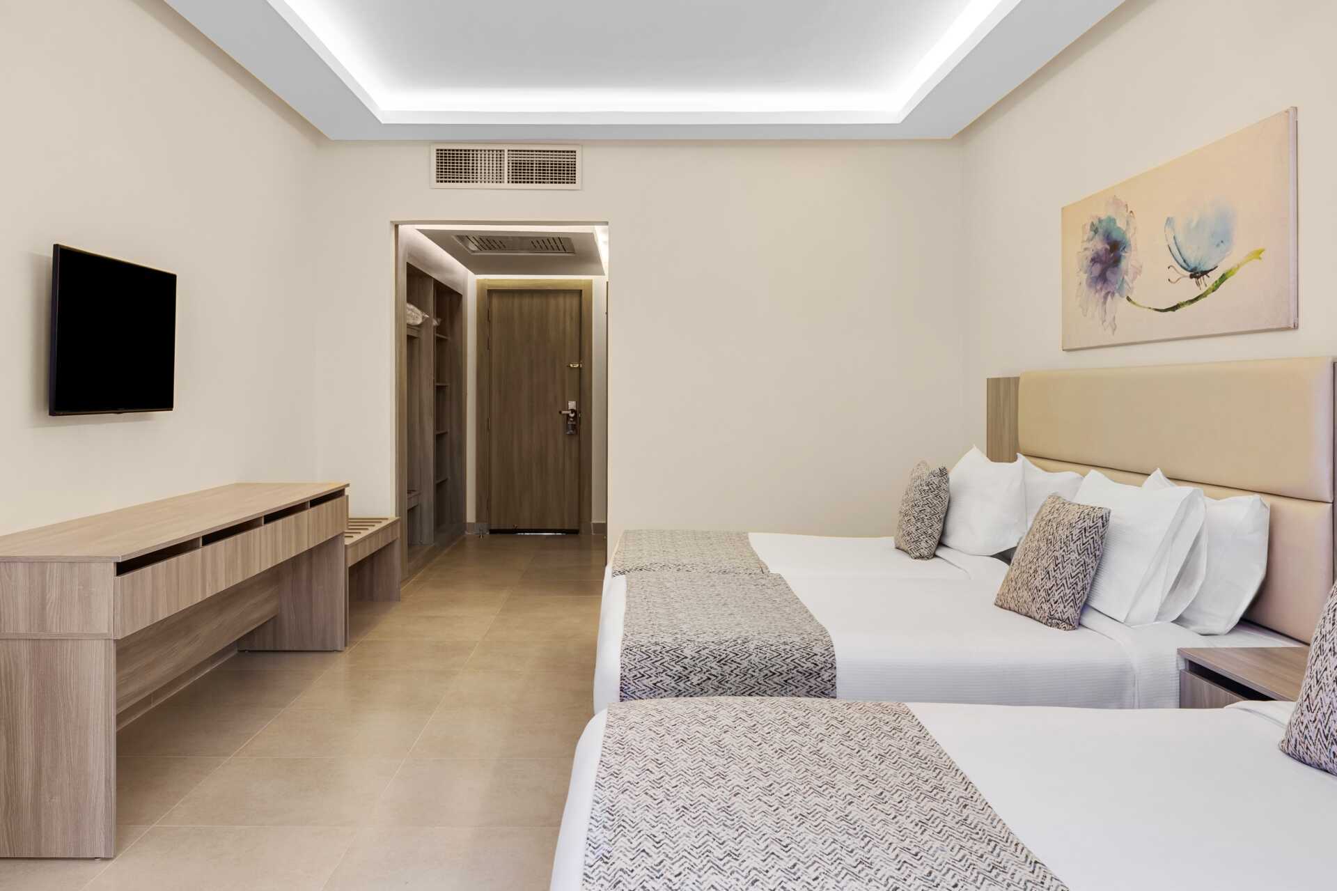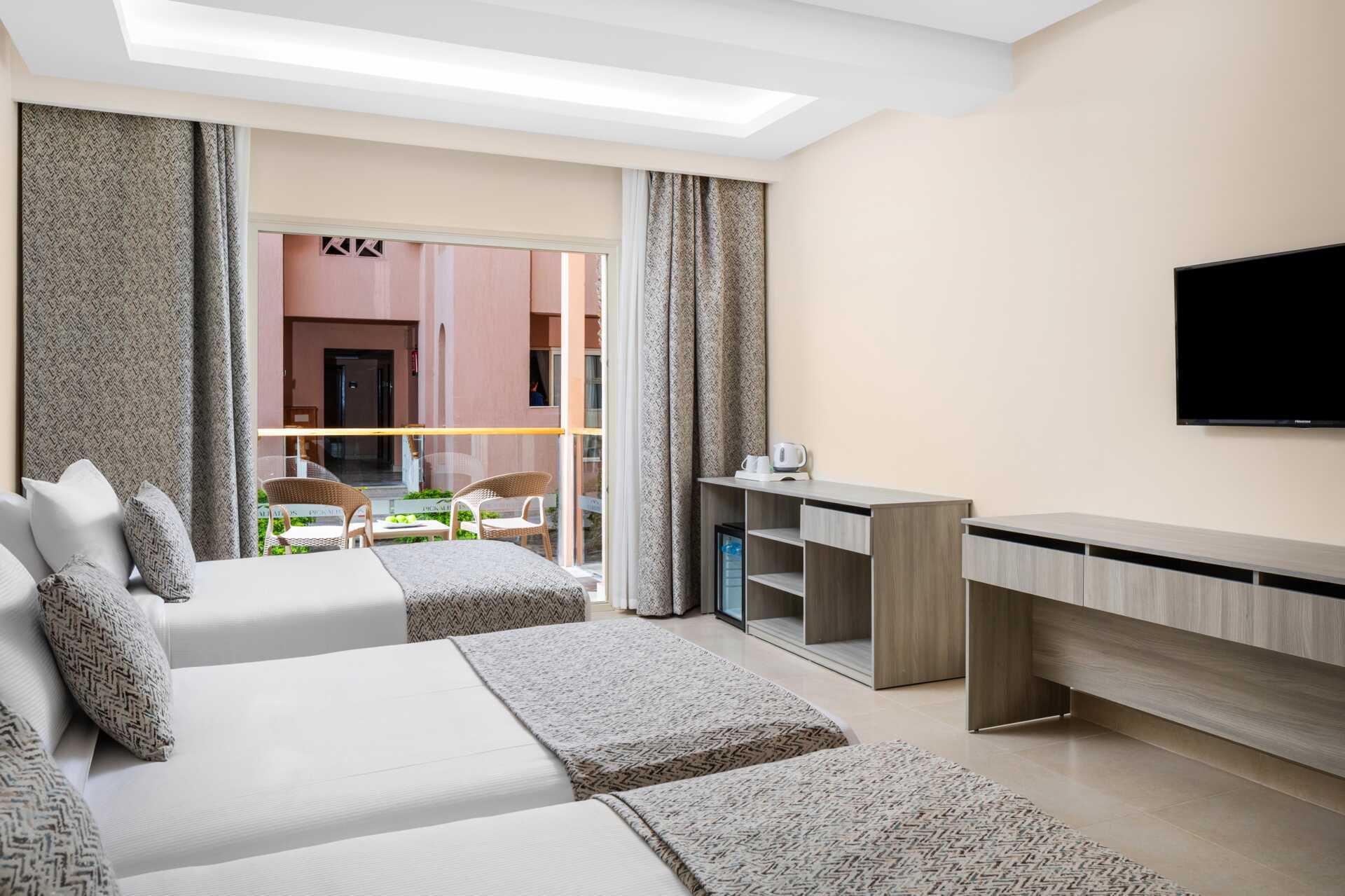 Familie-værelser med balkon eller terrasse, nogle pooludsigt. Familie-værelset består af to soveværelser. En dobbeltseng i det ene soveværelse og to enkeltsenge i det andet soveværelse. Gratis wifi, aircondition og deponering. Minibar fyldt med gratis vand. Tv med internationale kanaler. Hårtørrer. Badeværelse med bruser og toilet. Rengøring 7 gange om ugen.