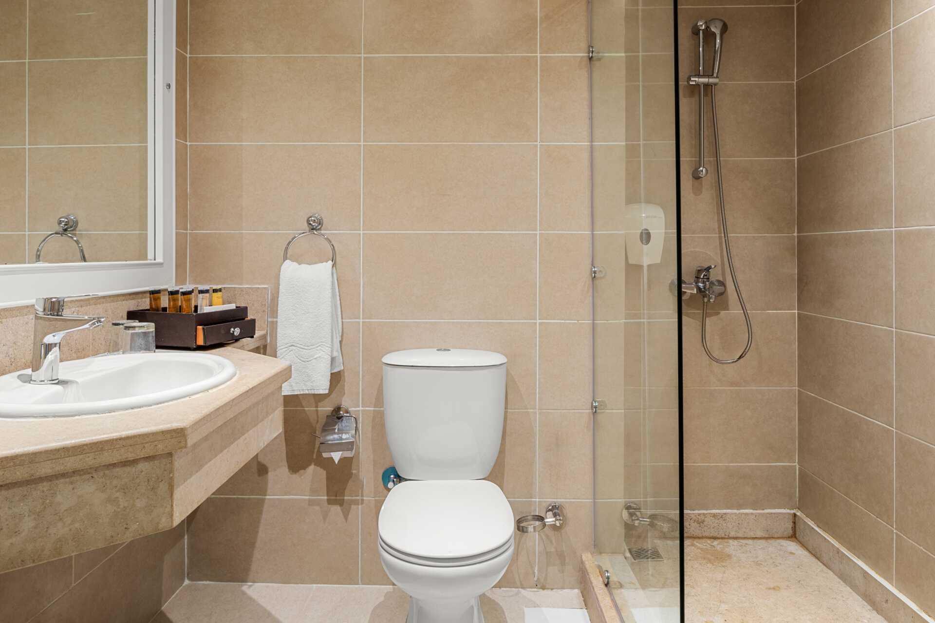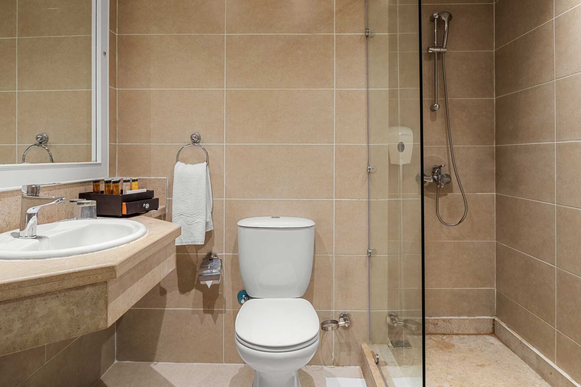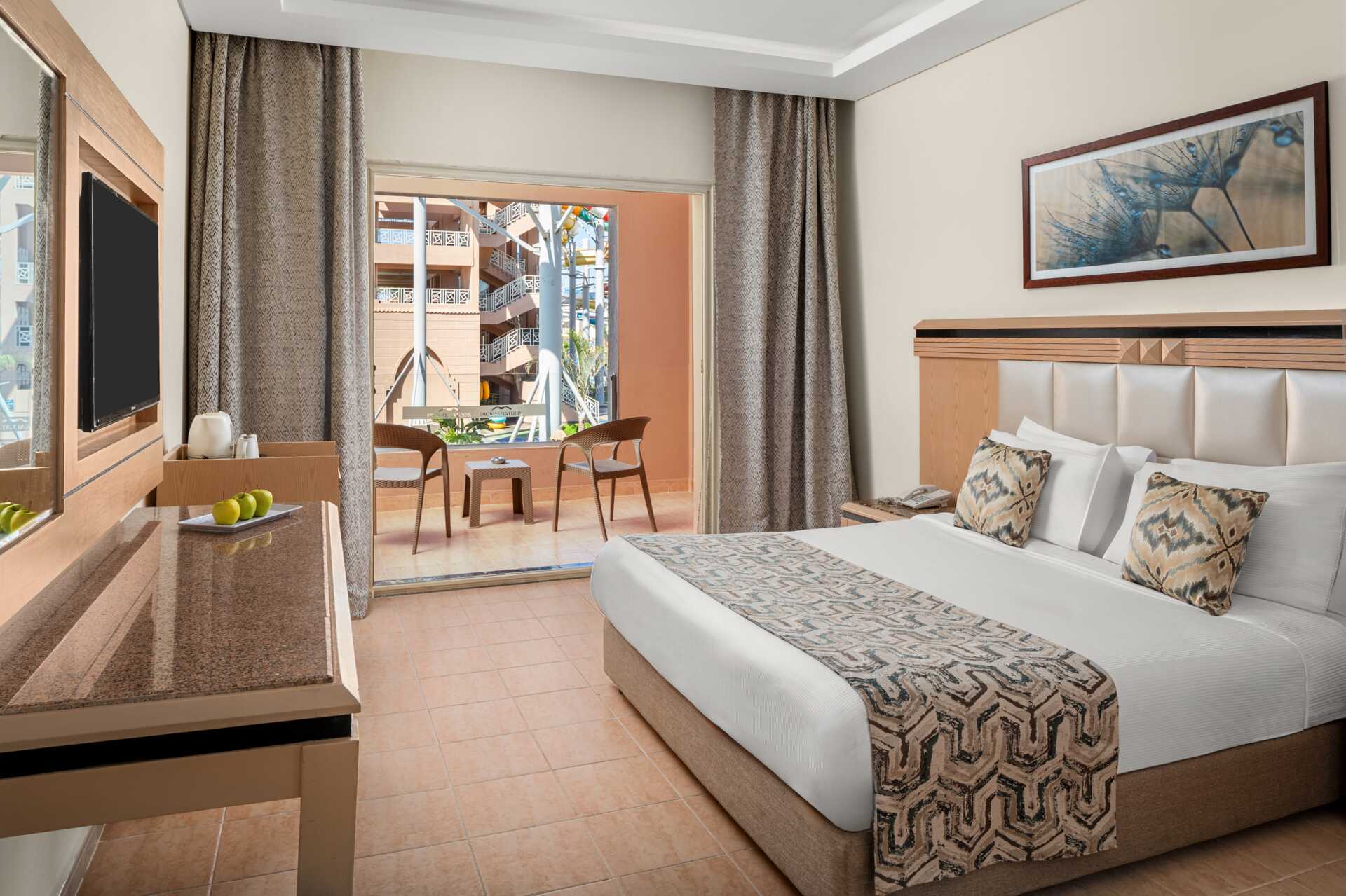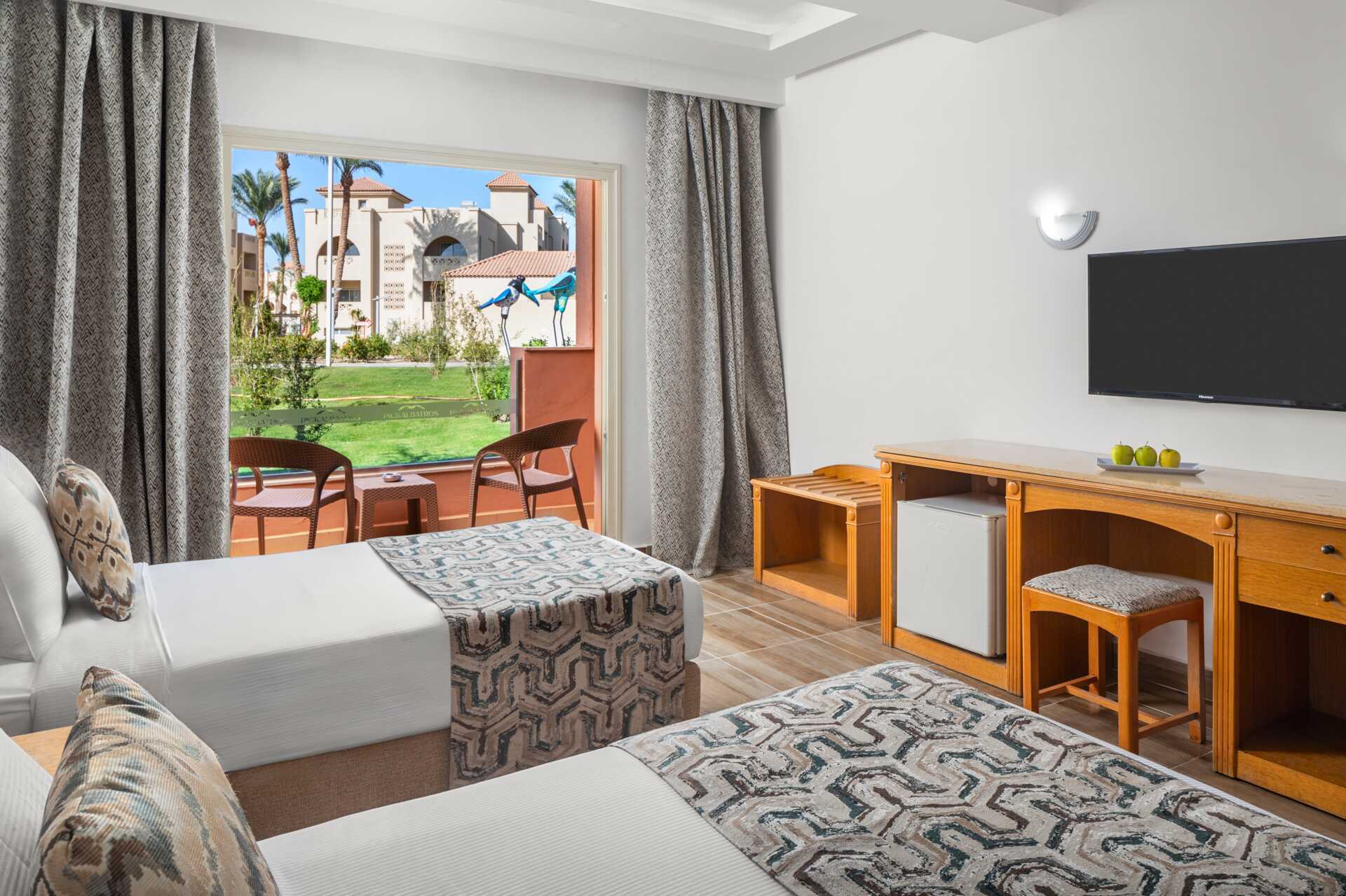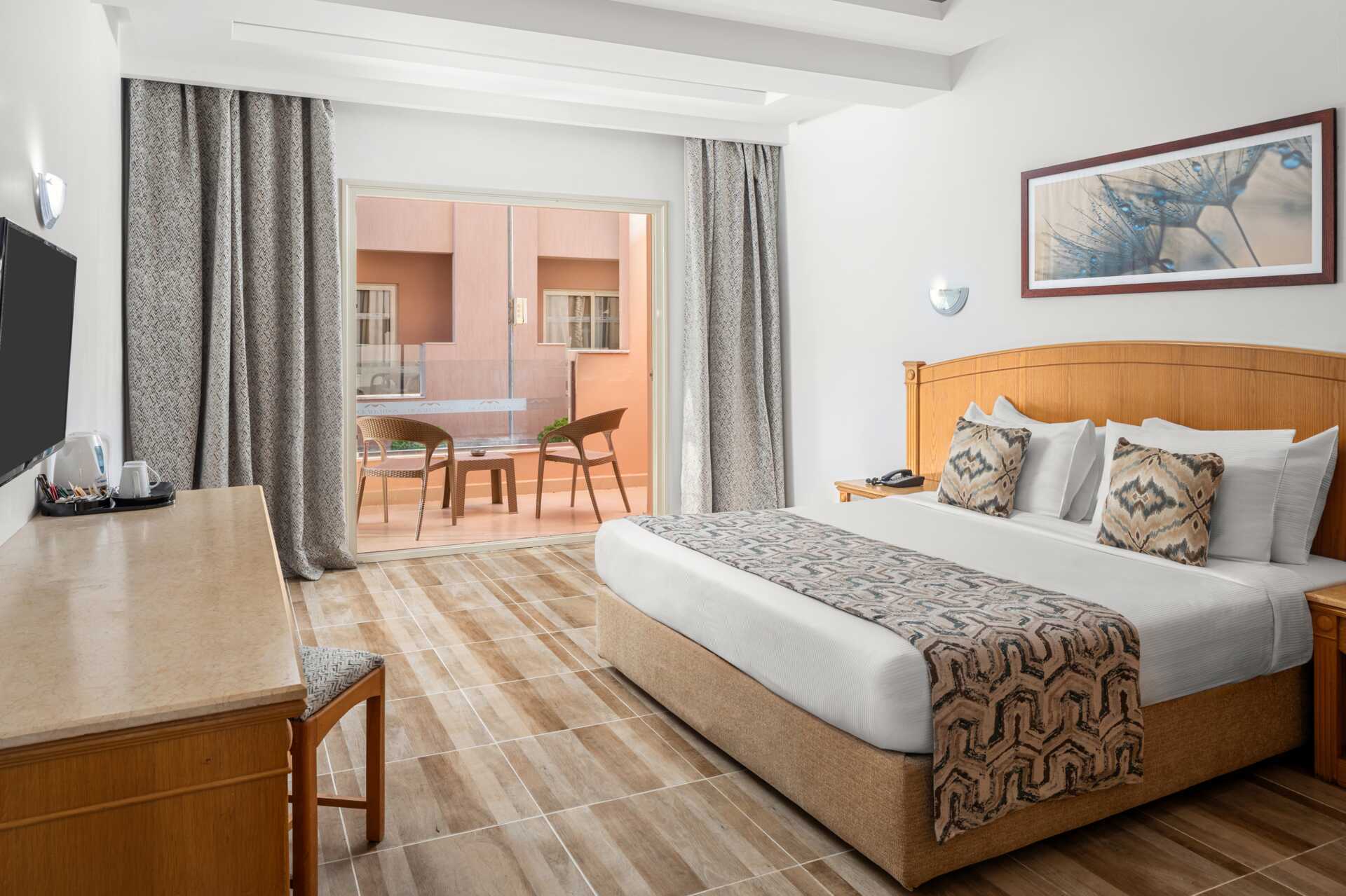 Dobbeltværelser med balkon eller terrasse, nogle med pooludsigt. En dobbeltseng eller en dobbeltseng og en enkeltseng. Mulighed for ekstra opredning i sovesofaer eller enkeltsenge. Gratis wifi, aircondition og deponering. El-kedel og kaffe/te. Minibar fyldt med gratis vand. Tv med internationale kanaler. Hårtørrer. Badeværelse med bruser og toilet. Rengøring 7 gange om ugen.