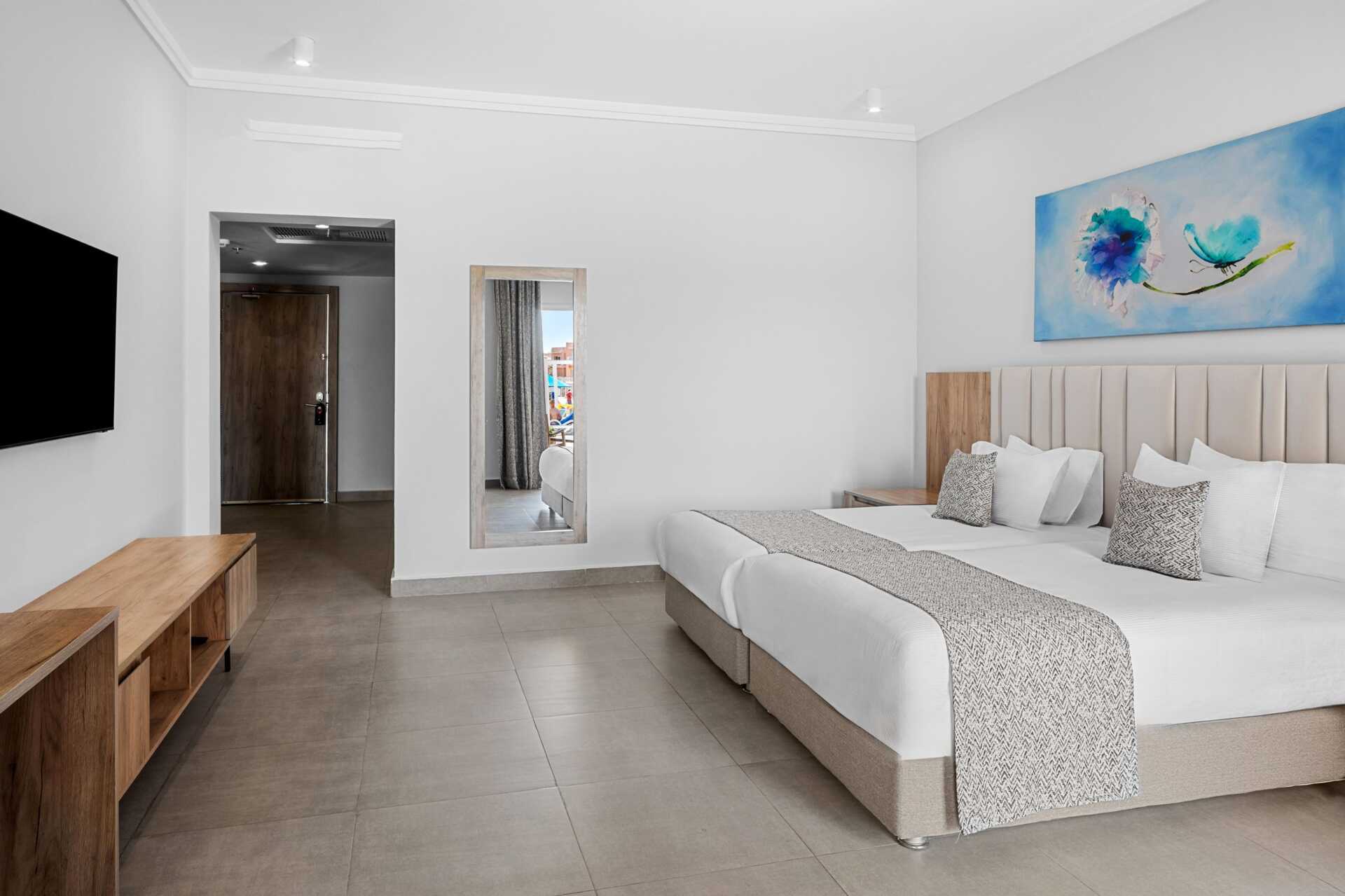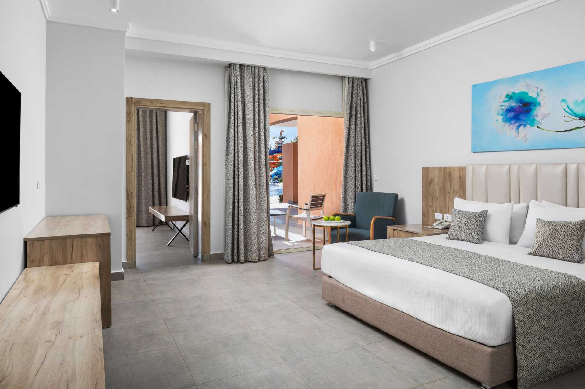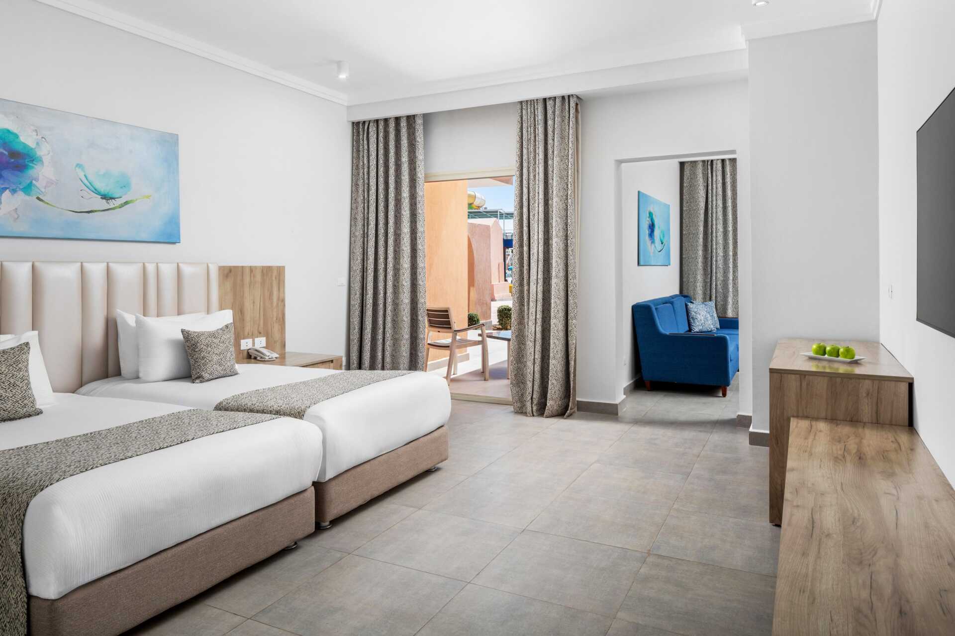 2-værelses suite med balkon eller terrasse og pooludsigt. Suiten består af to soveværelser med hvert sit badeværelse i den delte hall, hvoraf det ene har et opholdsrum. En dobbeltseng i det ene soveværelse og det andet soveværelse har to enkeltsenge. Mulighed for ekstra opredning i en fold ud-seng. Gratis wifi, aircondition og deponering. Minibar mod betaling - daglig påfyldning af flaskevand. Tv med internationale kanaler. Hårtørrer. Badeværelse med badekar og seperat bruser samt toilet. Rengøring 7 gange om ugen.