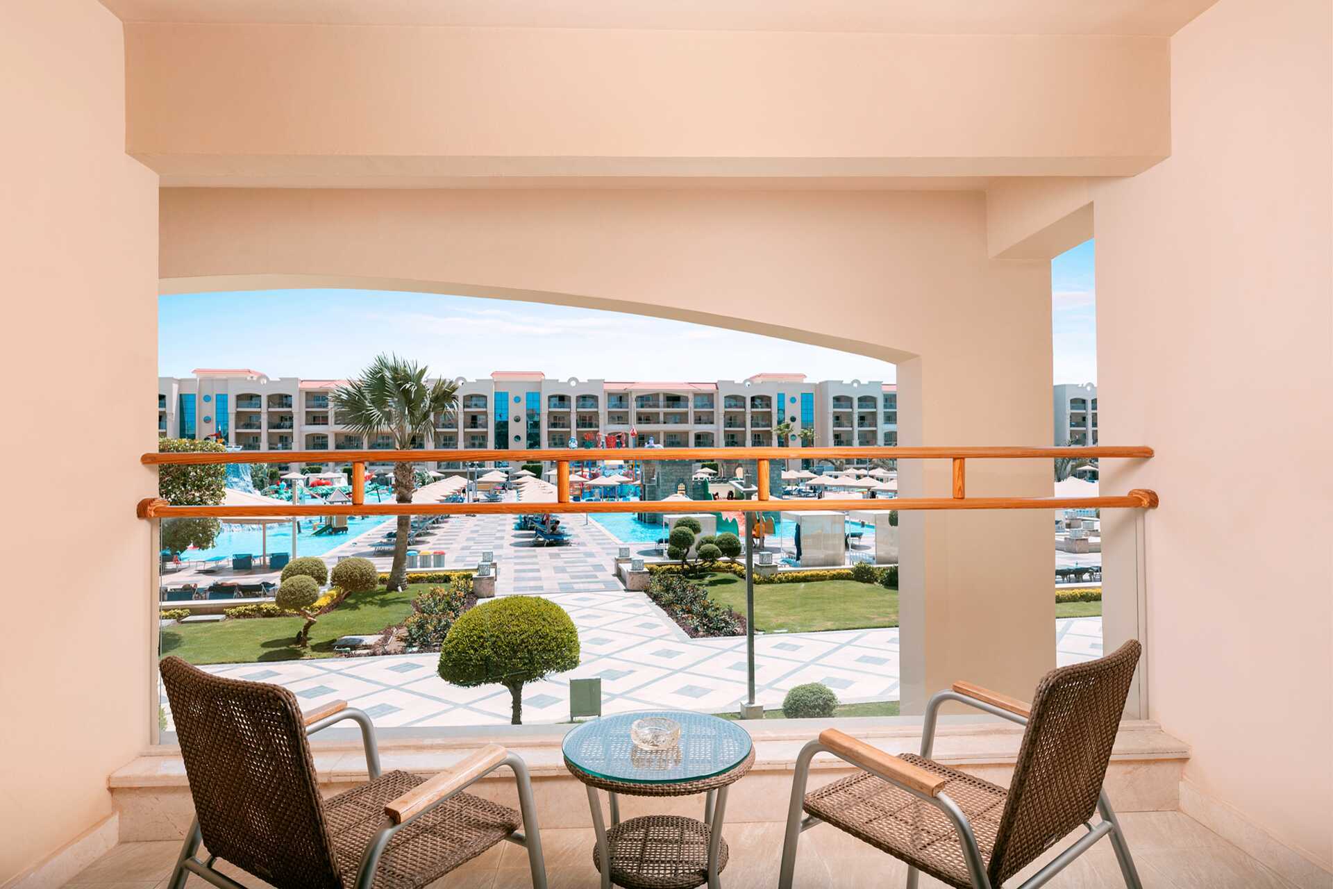 Deluxe-værelse med balkon og havudsigt eller pooludsigt. Nogle balkoner har kun en lav skillevæg til næste balkon. En dobbeltseng eller to enkeltsenge. Mulighed for ekstra opredninger i fold ud-seng eller sovesofa. Gratis wifi, aircondition og deponering. Minibar mod betaling. Vand genopfyldes gratis. El-kedel og kaffe/te. Tv med internationale kanaler. Hårtørrer. Badeværelse med badekar eller bruser samt toilet. Rengøring 7 gange om ugen.